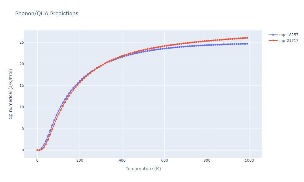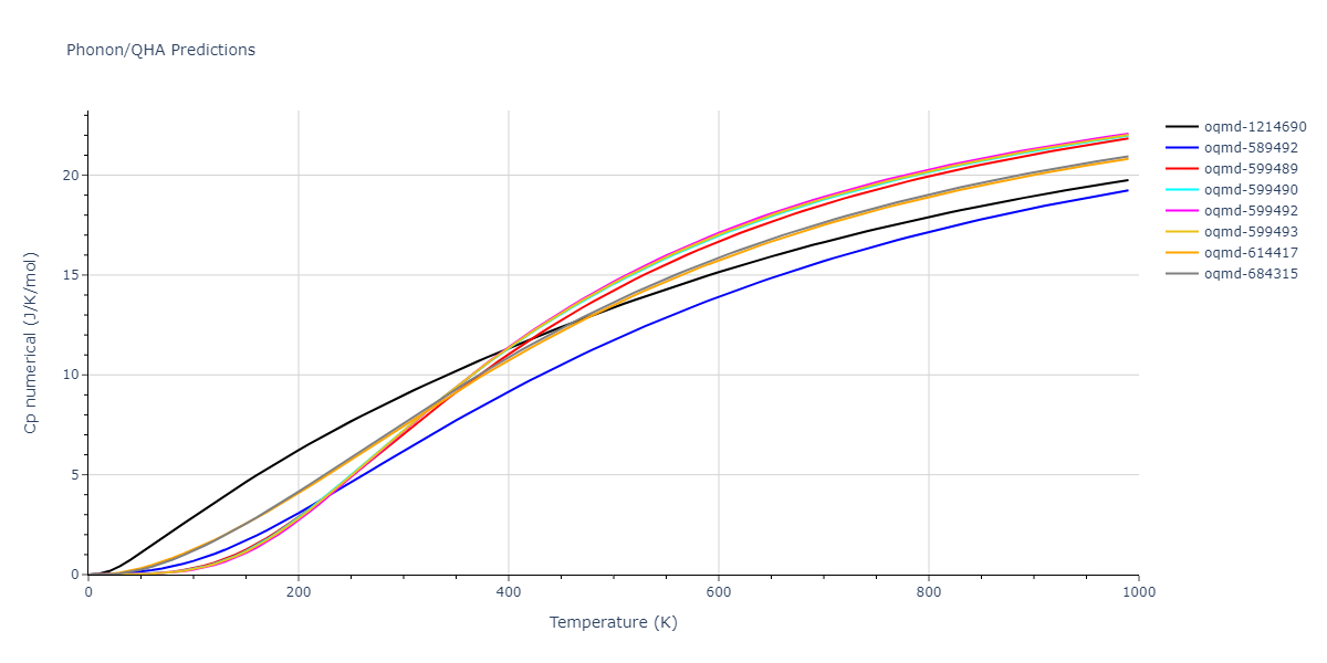 Plots of internal energy, Gibbs free energy, entropy, heat capacity and volume are shown here as a function of temperature for various crystal structures and liquid phases. The included crystal structures correspond to those in the Solid Structures vs. Temperature section, and the liquid phases to those in the Liquid Properties section. Internal energy and volume are taken from the associated structure relaxations mentioned in those previous sections. Constant pressure heat capacity is estimated using 3-point numerical derivatives of enthalpy versus temperature. Note that since all simulations done here are at 0 pressure, internal energy and enthalpy are equivalent.