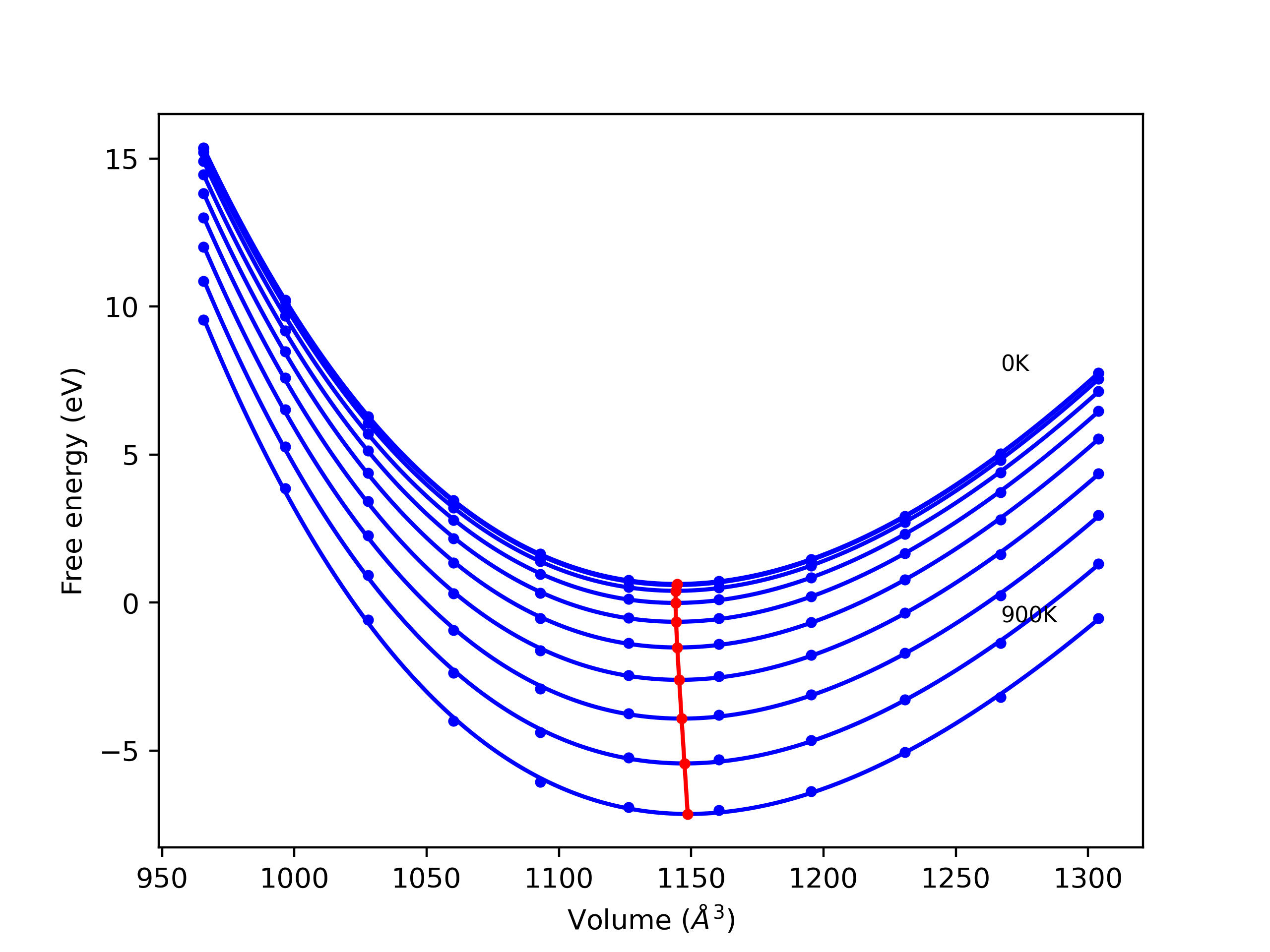 The Gibbs energies of the phases are estimated using thermodynamic integration between the interatomic potential in question and a simpler model with known Gibbs free energy values. For solids, the reference model is an Einstein solid, while for liquids it is the Uhlenbeck-Ford potential. Besides a short run at the start of the solid calculations to estimate Einstein model spring constants, the two calculations proceed similarly. Starting with the final relaxation configurations, the systems are stabilized for 25,000 steps. Then, over the next 50,000 steps the potential is swapped out for the reference potential. The system is then stabilized for another 25,000 steps with the reference model before a reverse swap of 50,000 steps is performed. The simulation ends with one final 25,000 step stabilization period. From the simulation, the irreversible work of transformation is estimated and used to compute the absolute Gibbs free energy of the target phase and potential relative to the reference potential. Entropy is estimated as the difference in enthalpy and Gibbs free energy and divided by temperature.
