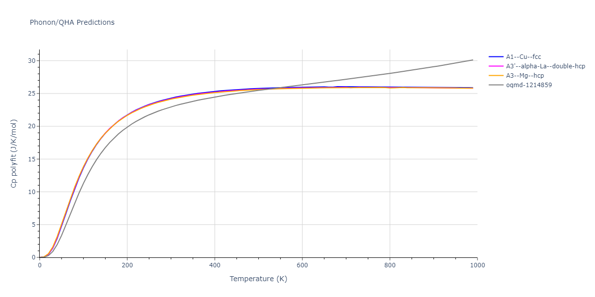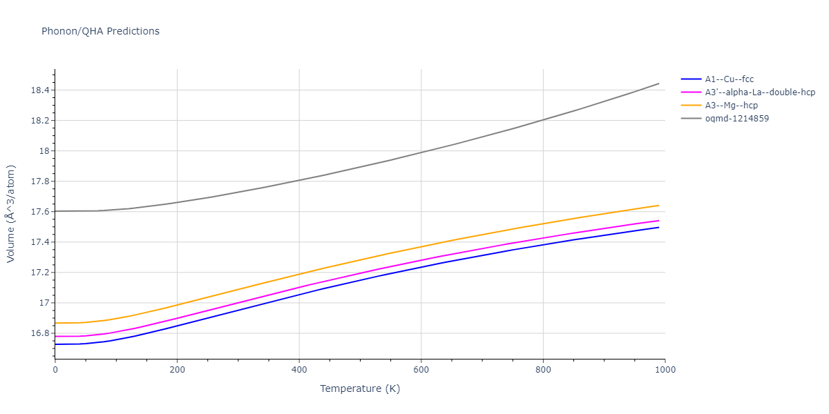 Phonon band structures and crystal properties estimated from quasi-harmonic approximation (QHA) calculations are displayed for select crystals. The calculations were performed using phonopy and LAMMPS. For the phonon calculations, 3x3 supercells of the potential-specific relaxed crystals were used. The QHA calculations were based on 11 strain states ranging from -0.05 to 0.05.