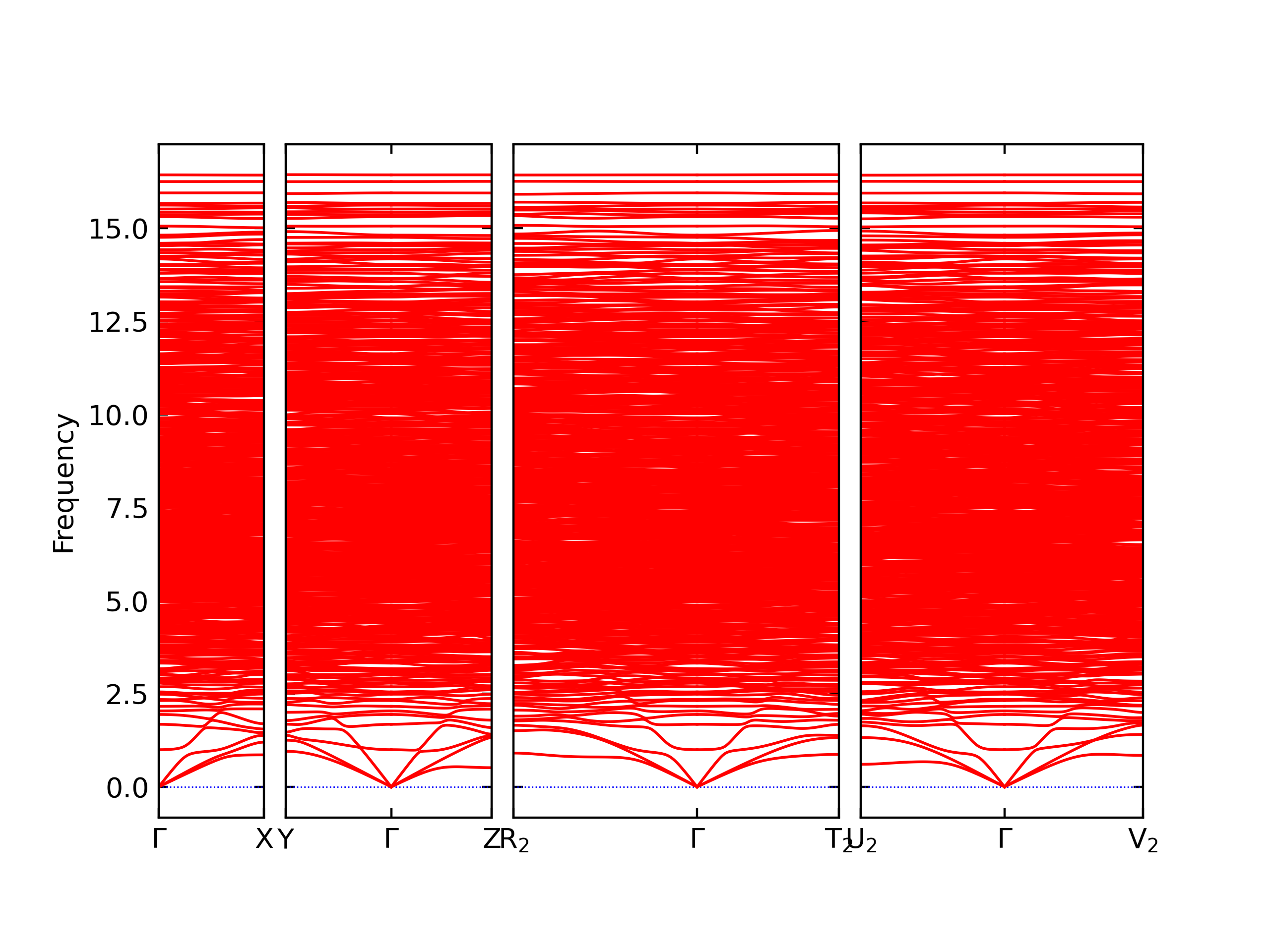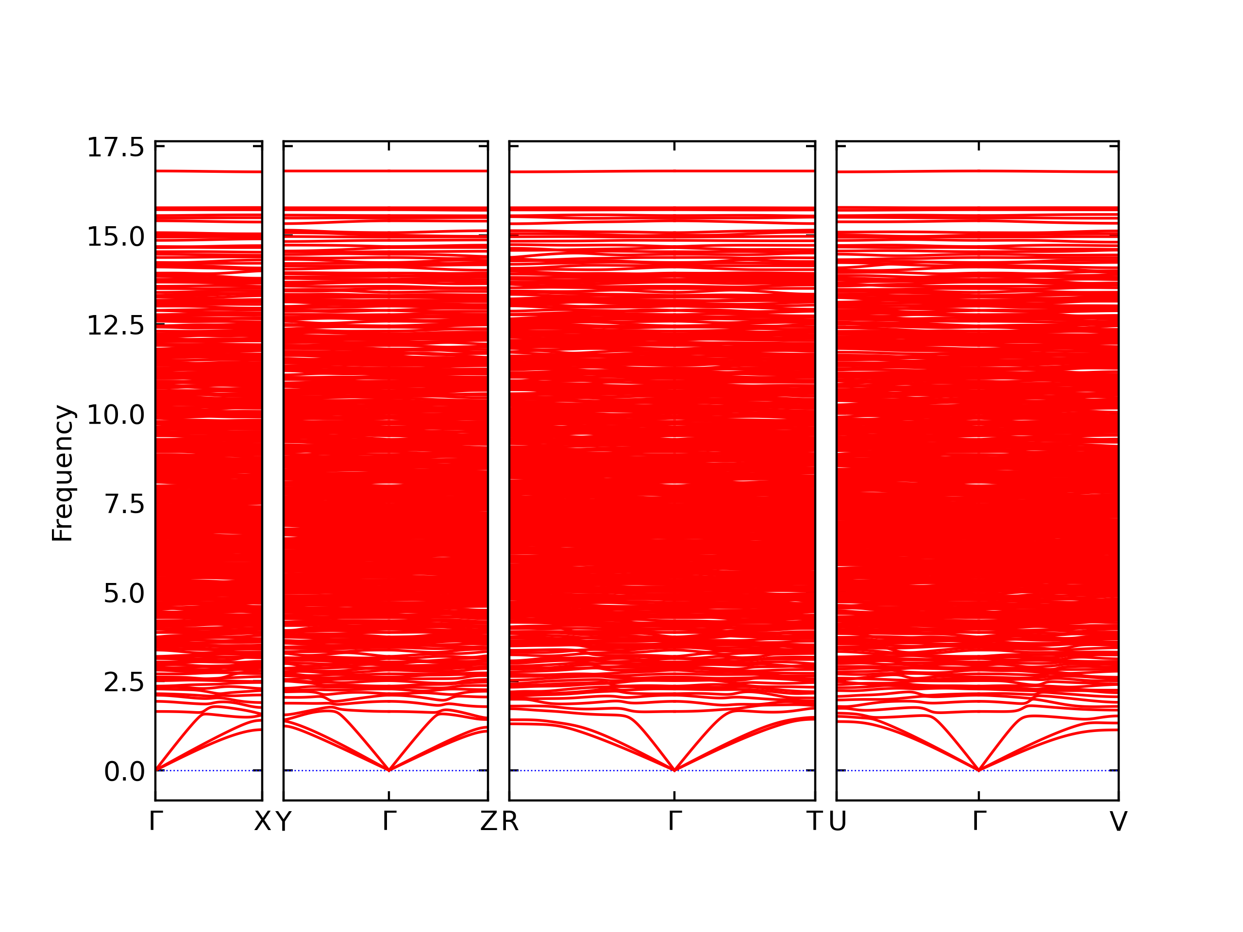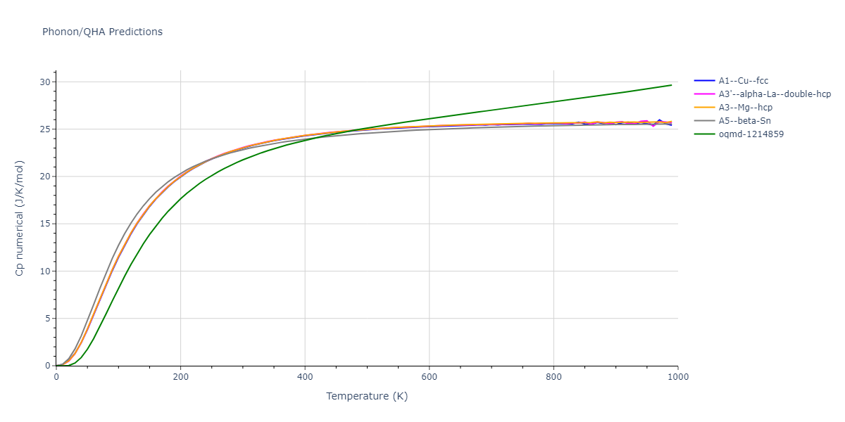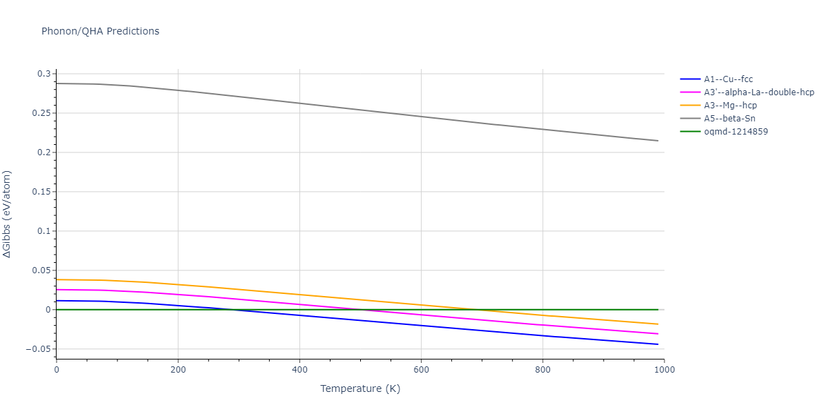 Phonon band structures and crystal properties estimated from quasi-harmonic approximation (QHA) calculations are displayed for select crystals. The calculations were performed using phonopy and LAMMPS. For the phonon calculations, 3x3 supercells of the potential-specific relaxed crystals were used. The QHA calculations were based on 11 strain states ranging from -0.05 to 0.05.