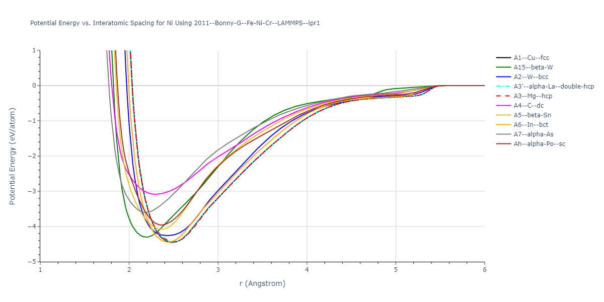 Plots of potential energy vs interatomic spacing, r, are shown below for a number of crystal structures. The structures are generated based on the ideal atomic positions and b/a and c/a lattice parameter ratios for a given crystal prototype. The size of the system is then uniformly scaled, and the energy calculated without relaxing the system. To obtain these plots, values of r are evaluated every 0.02 Å up to 6 Å.