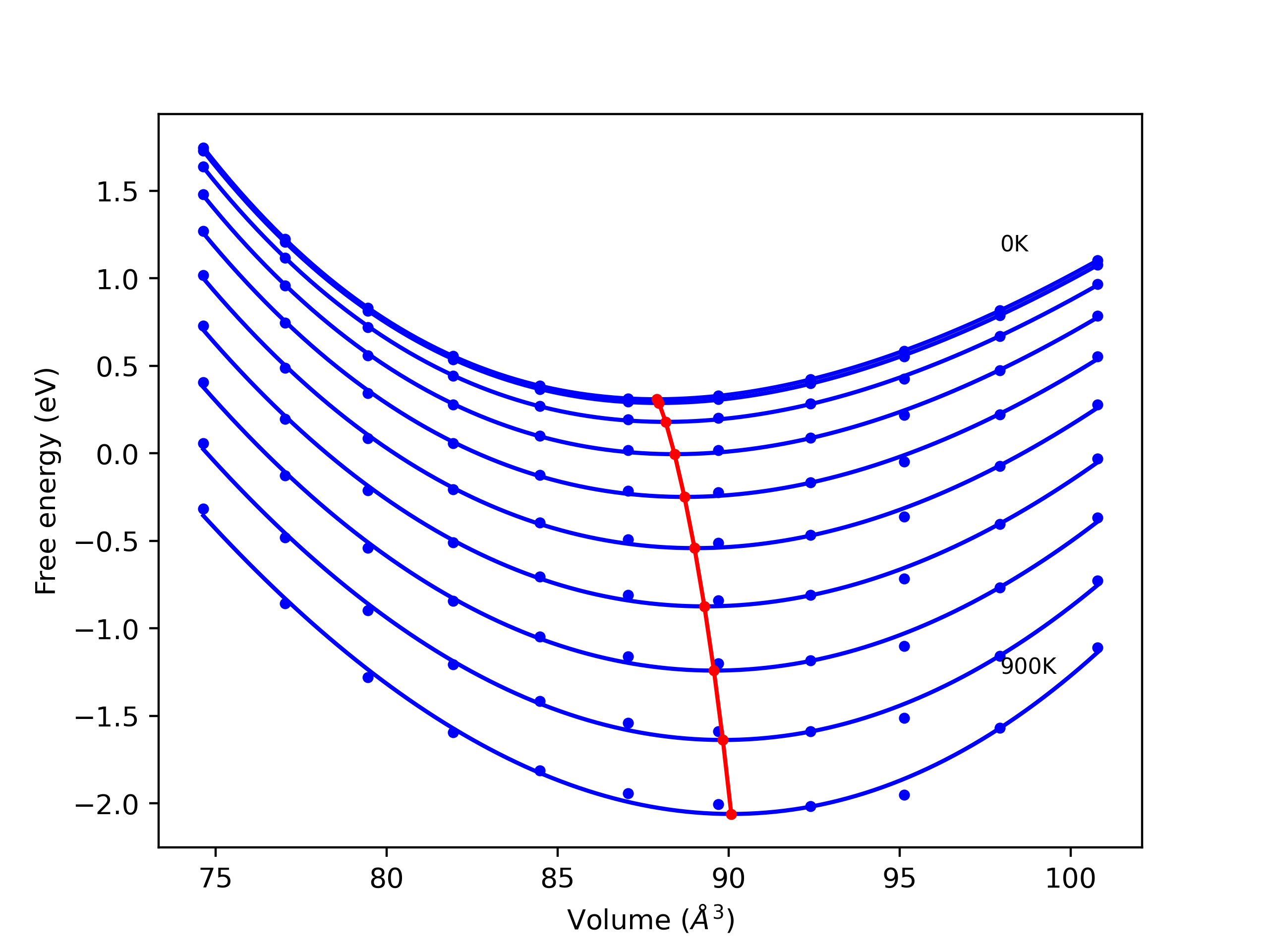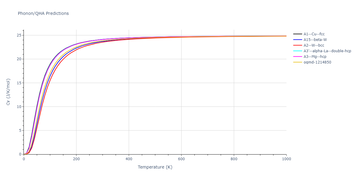 Phonon band structures and crystal properties estimated from quasi-harmonic approximation (QHA) calculations are displayed for select crystals. The calculations were performed using phonopy and LAMMPS. For the phonon calculations, 3x3 supercells of the potential-specific relaxed crystals were used. The QHA calculations were based on 11 strain states ranging from -0.05 to 0.05.