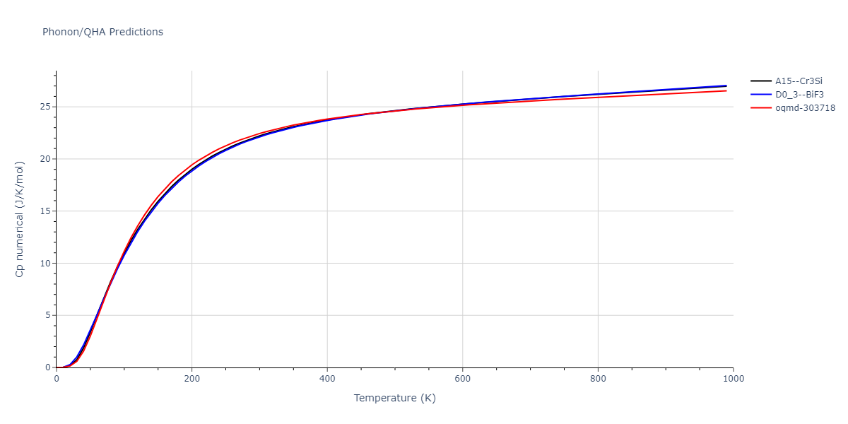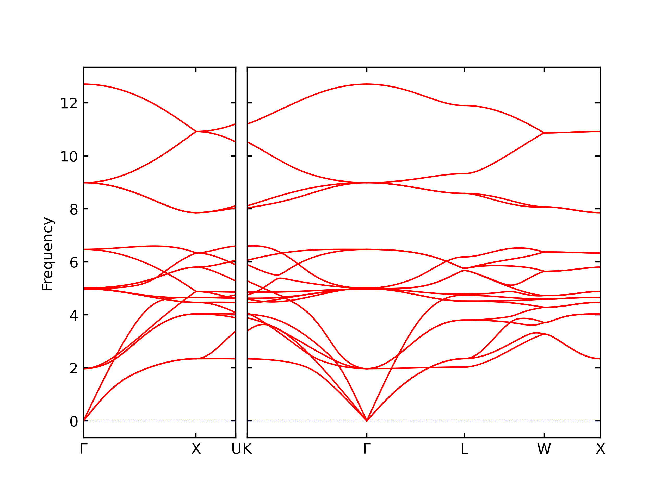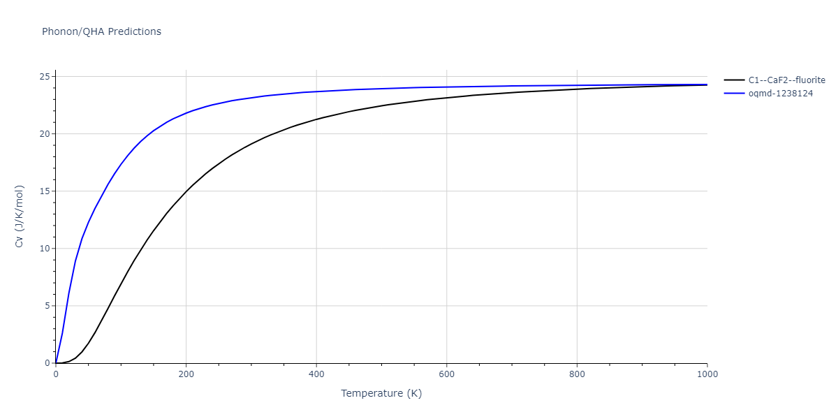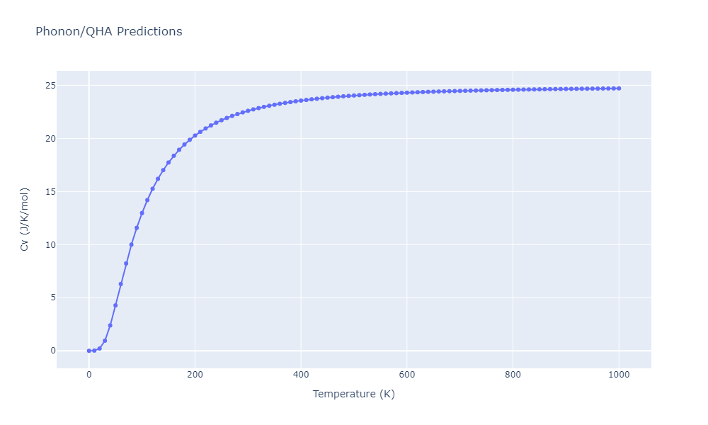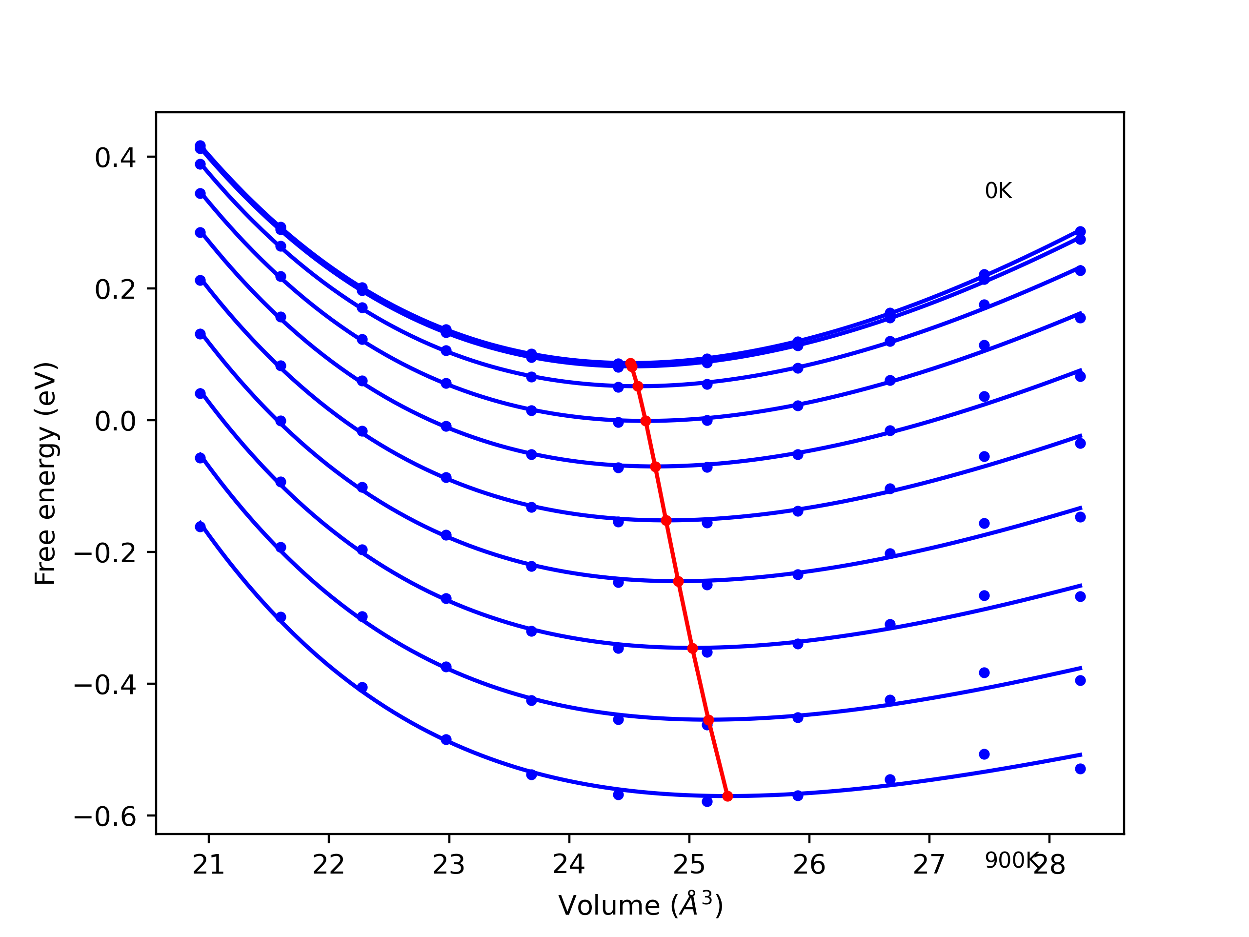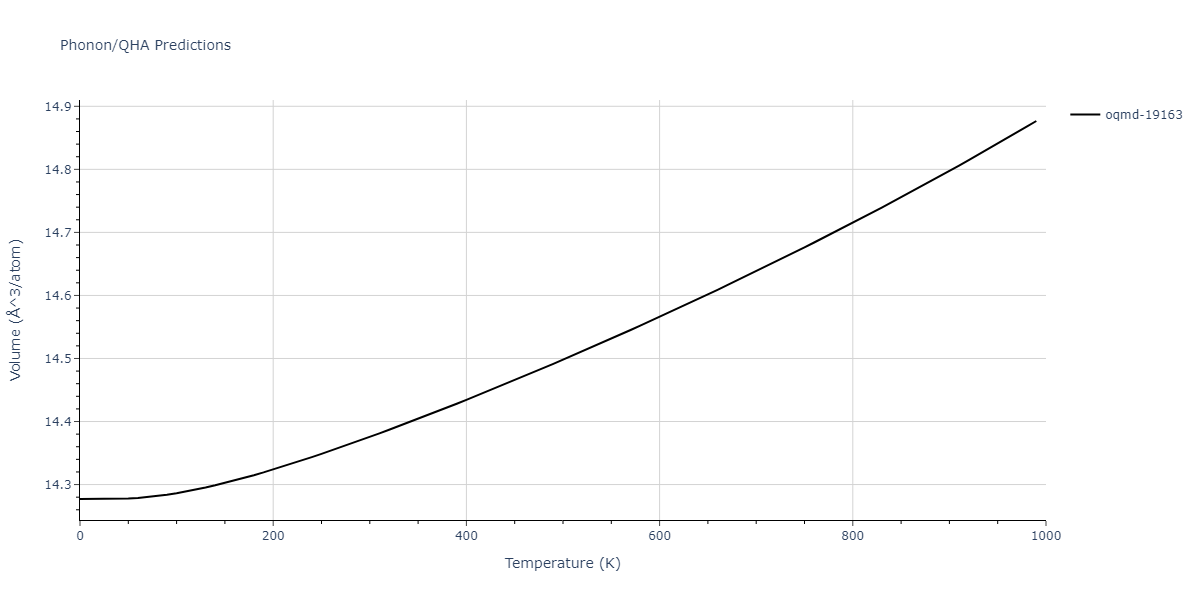 Phonon band structures and crystal properties estimated from quasi-harmonic approximation (QHA) calculations are displayed for select crystals. The calculations were performed using phonopy and LAMMPS. For the phonon calculations, 3x3 supercells of the potential-specific relaxed crystals were used. The QHA calculations were based on 11 strain states ranging from -0.05 to 0.05.