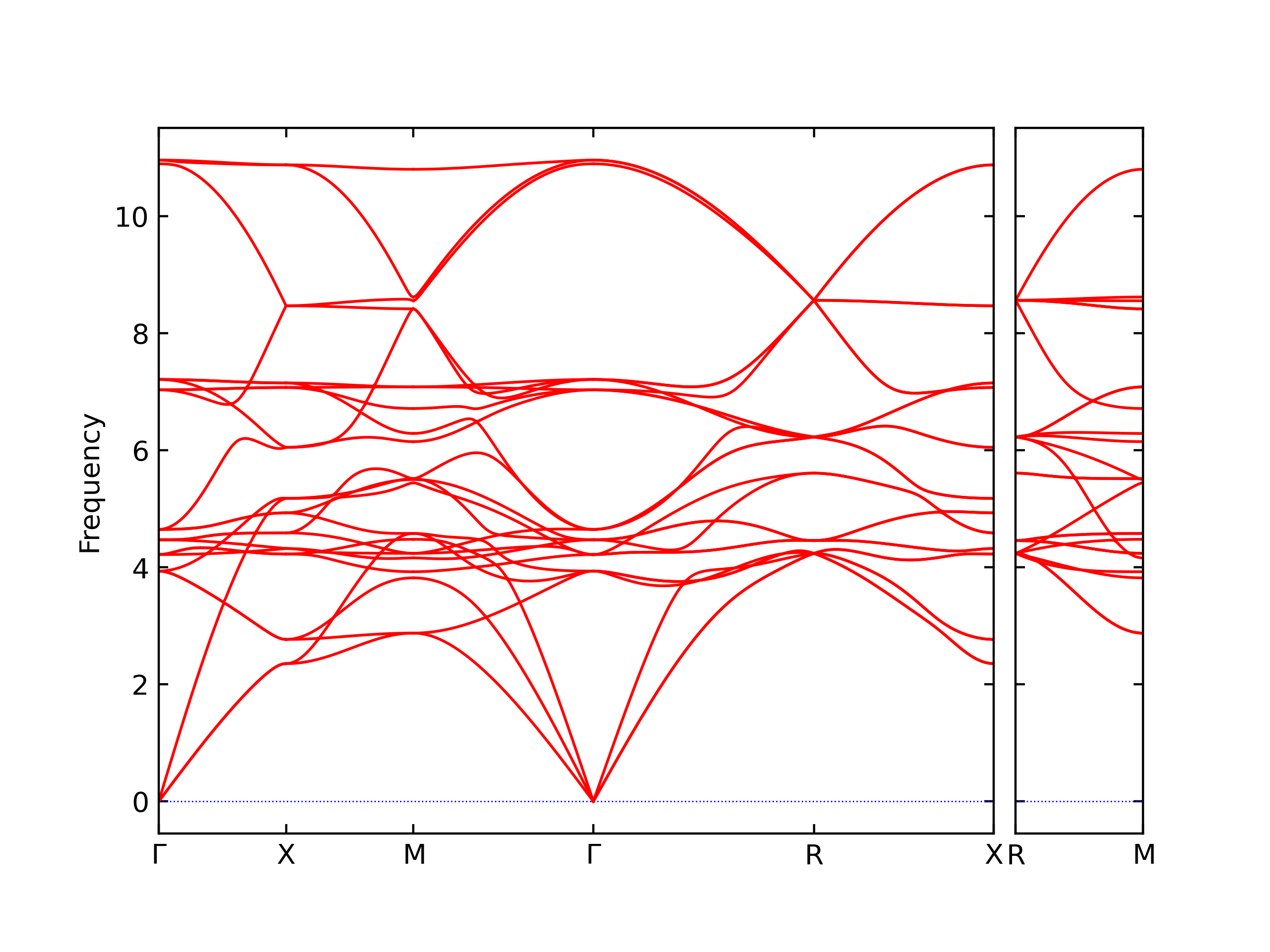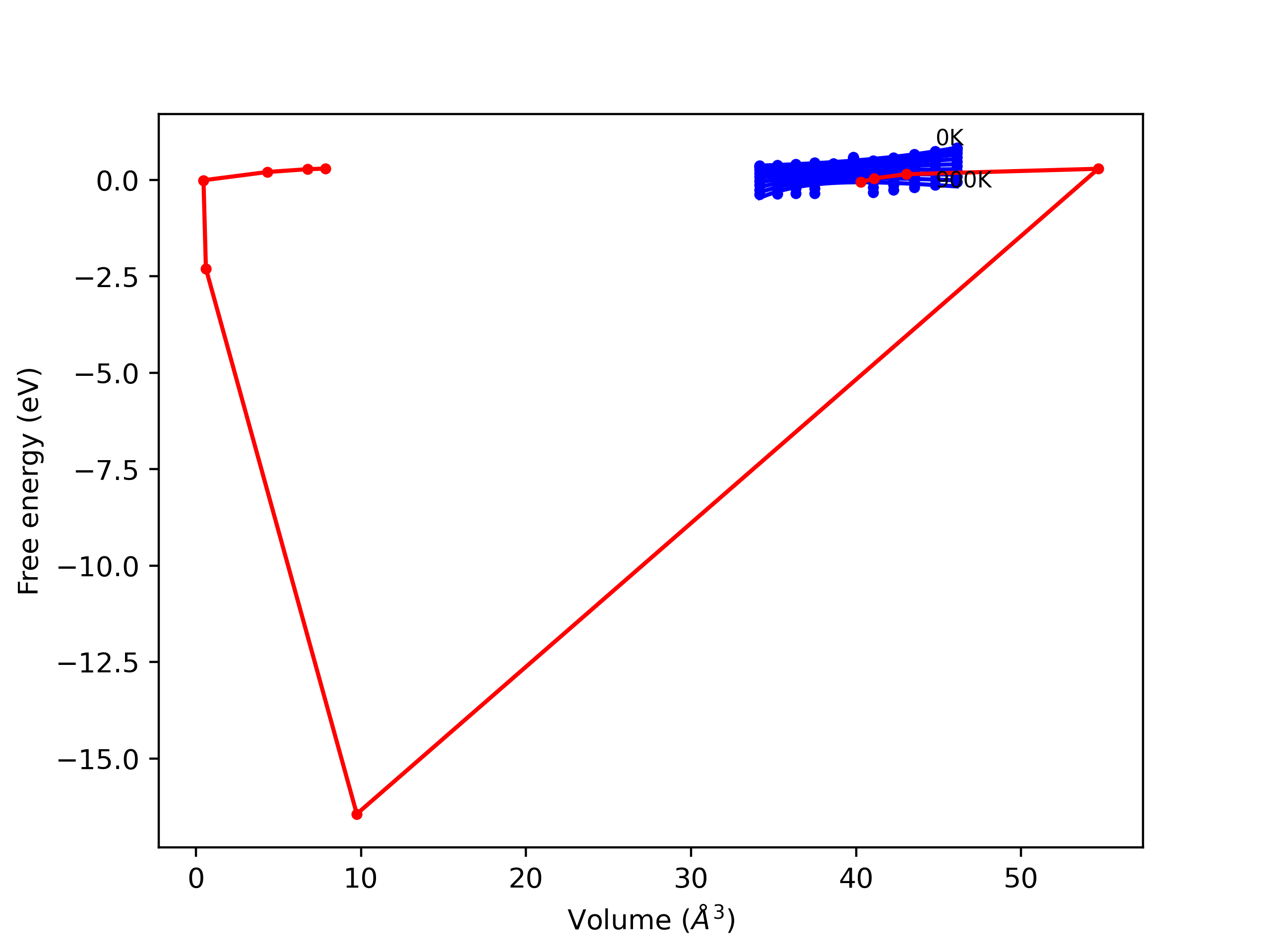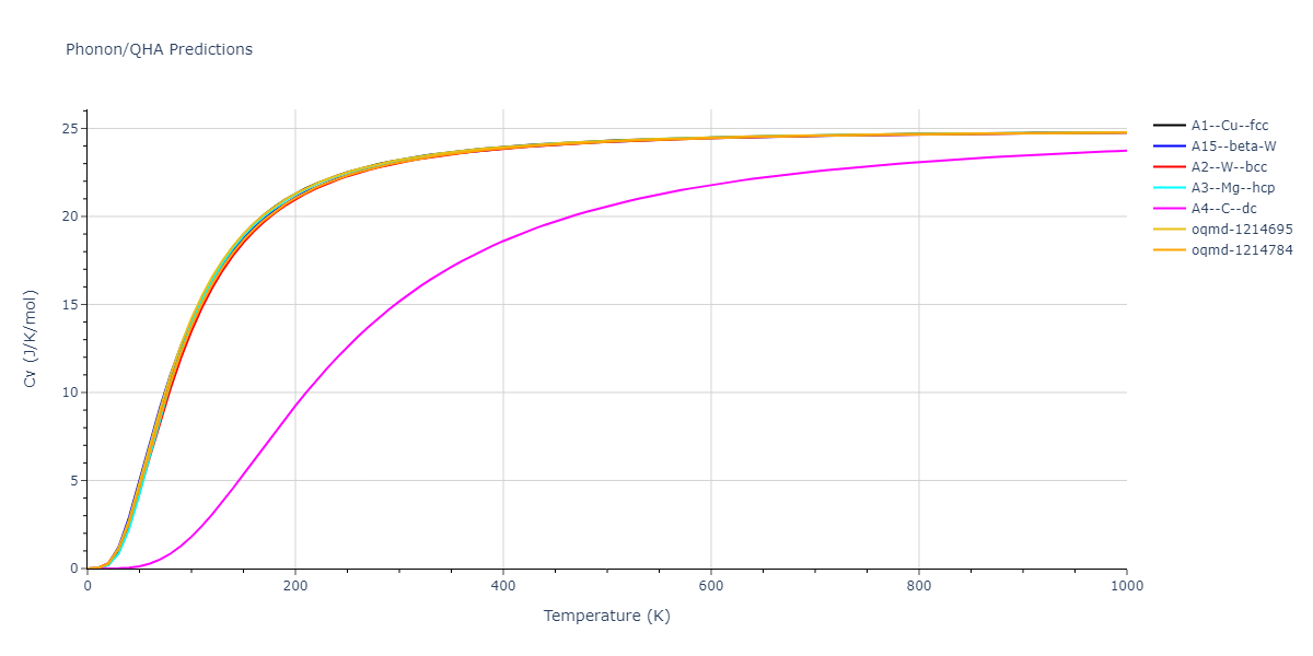 Phonon band structures and crystal properties estimated from quasi-harmonic approximation (QHA) calculations are displayed for select crystals. The calculations were performed using phonopy and LAMMPS. For the phonon calculations, 3x3 supercells of the potential-specific relaxed crystals were used. The QHA calculations were based on 11 strain states ranging from -0.05 to 0.05.
