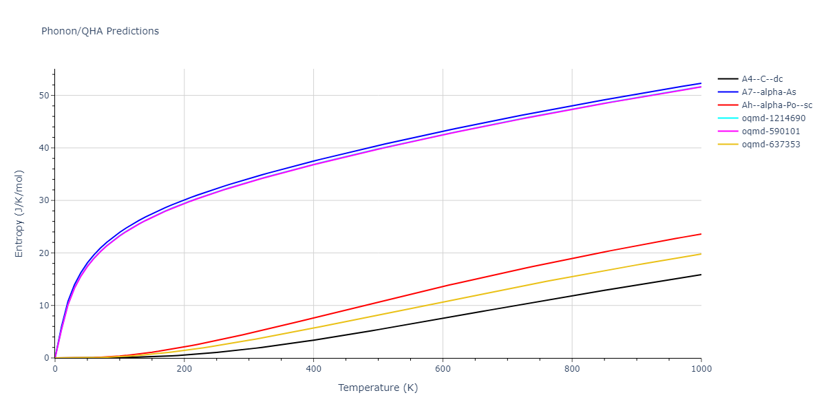 The Gibbs energies of the phases are estimated using thermodynamic integration between the interatomic potential in question and a simpler model with known Gibbs free energy values. For solids, the reference model is an Einstein solid, while for liquids it is the Uhlenbeck-Ford potential. Besides a short run at the start of the solid calculations to estimate Einstein model spring constants, the two calculations proceed similarly. Starting with the final relaxation configurations, the systems are stabilized for 25,000 steps. Then, over the next 50,000 steps the potential is swapped out for the reference potential. The system is then stabilized for another 25,000 steps with the reference model before a reverse swap of 50,000 steps is performed. The simulation ends with one final 25,000 step stabilization period. From the simulation, the irreversible work of transformation is estimated and used to compute the absolute Gibbs free energy of the target phase and potential relative to the reference potential. Entropy is estimated as the difference in enthalpy and Gibbs free energy and divided by temperature.