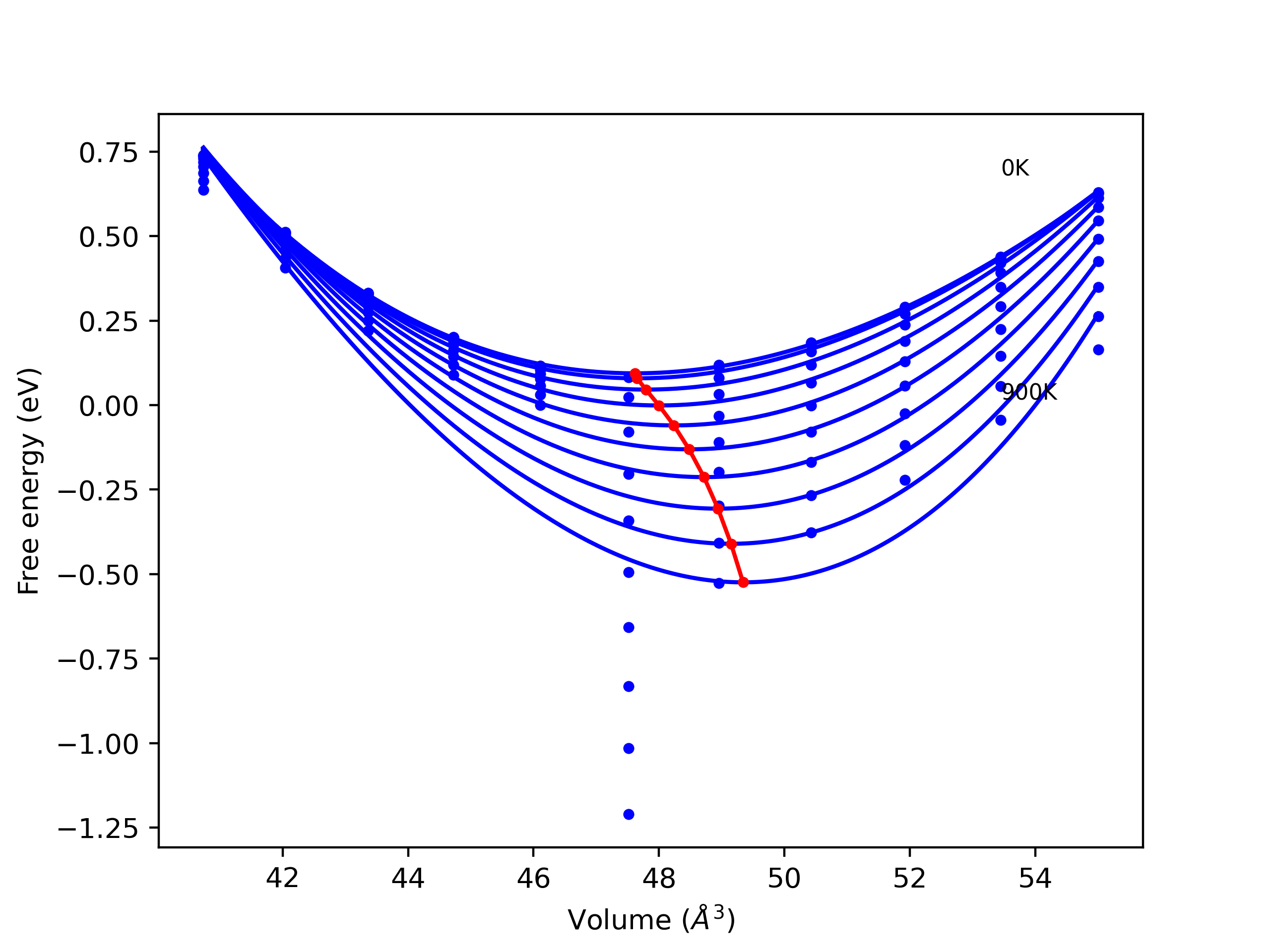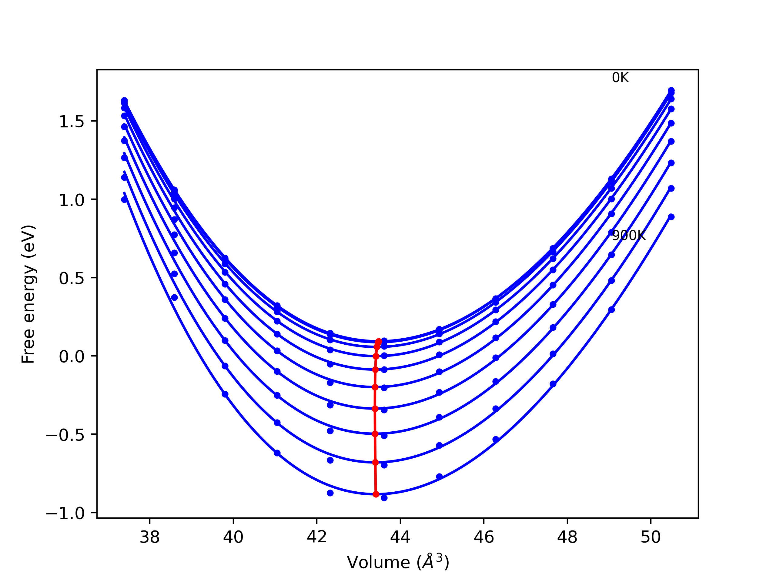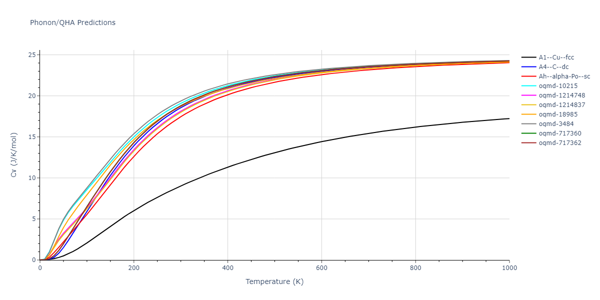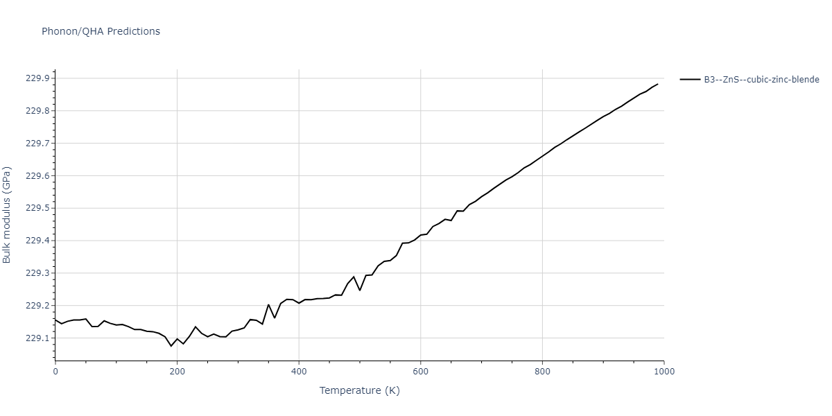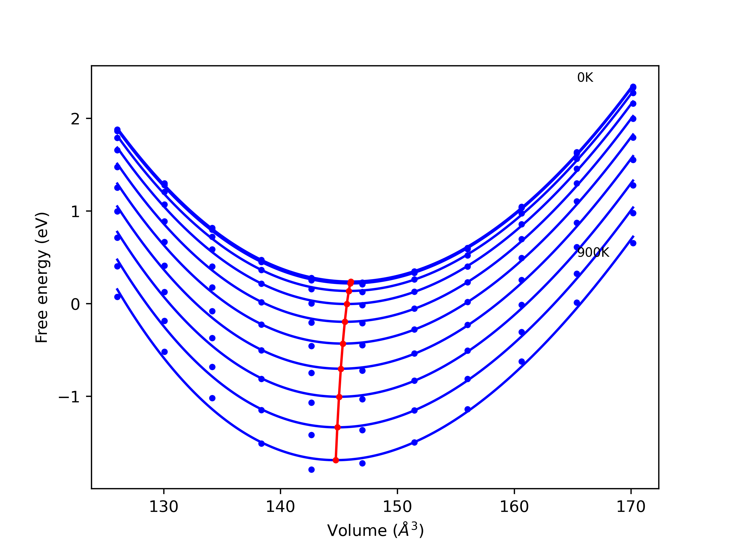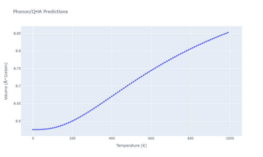 Phonon band structures and crystal properties estimated from quasi-harmonic approximation (QHA) calculations are displayed for select crystals. The calculations were performed using phonopy and LAMMPS. For the phonon calculations, 3x3 supercells of the potential-specific relaxed crystals were used. The QHA calculations were based on 11 strain states ranging from -0.05 to 0.05.