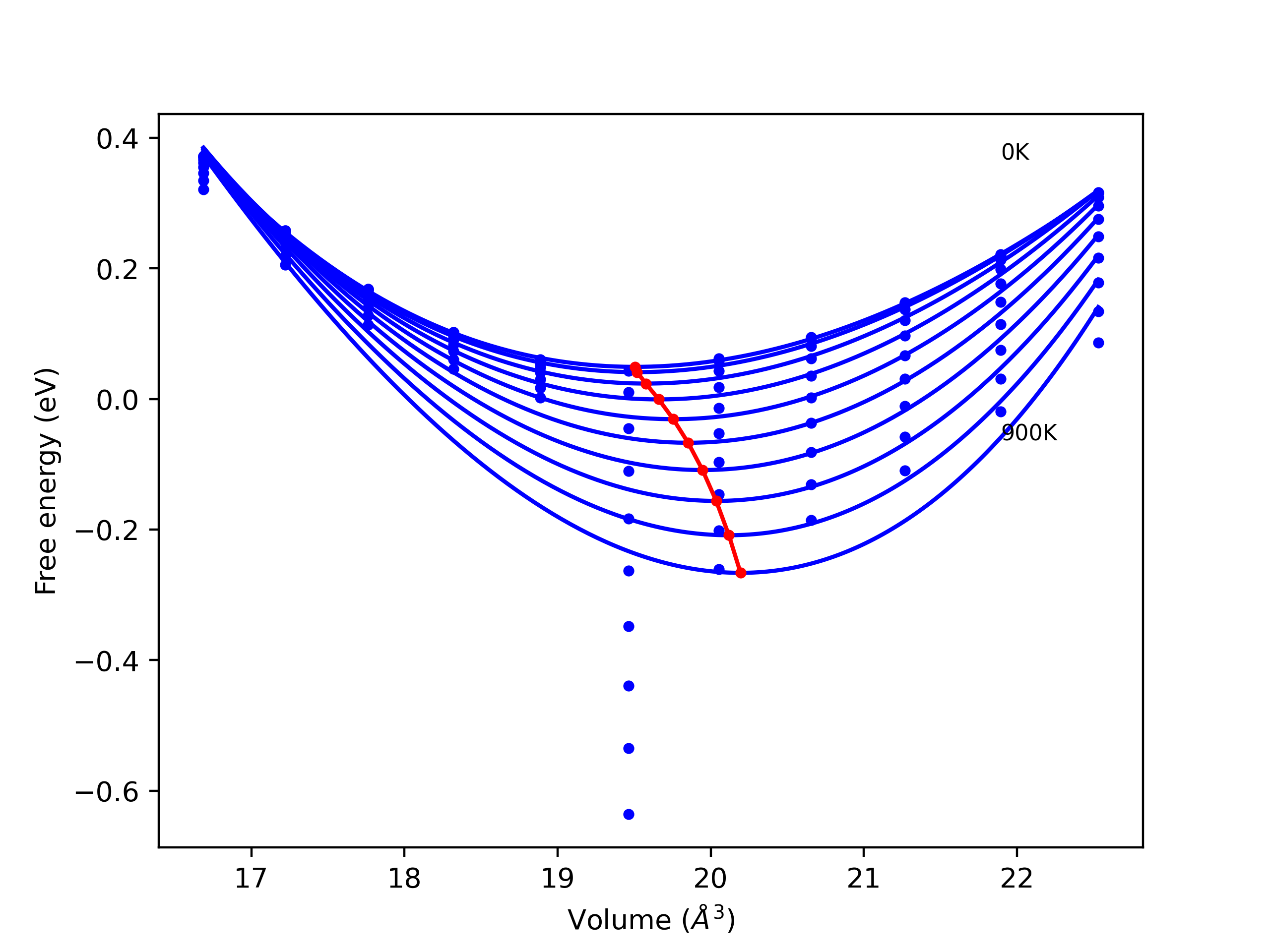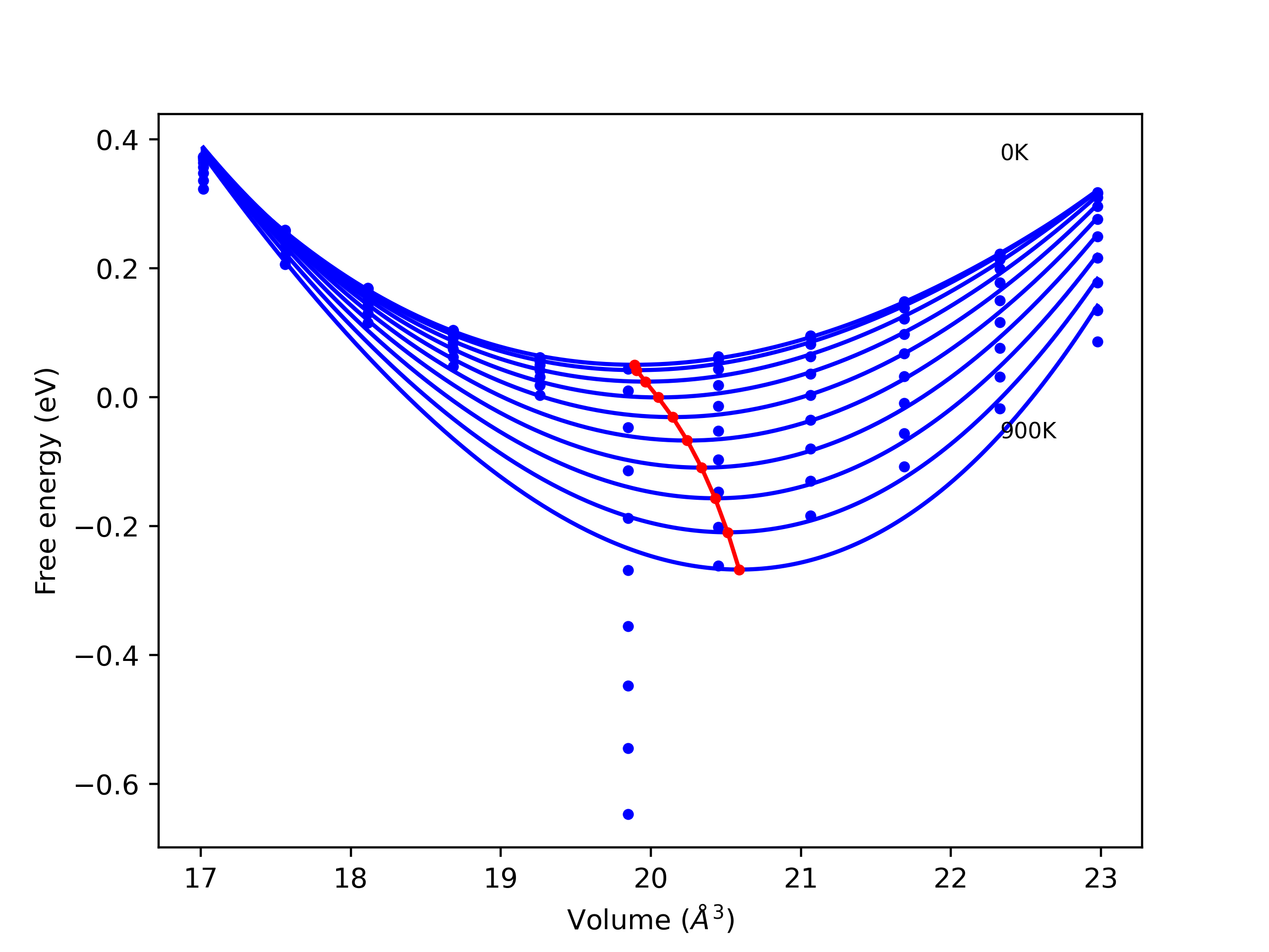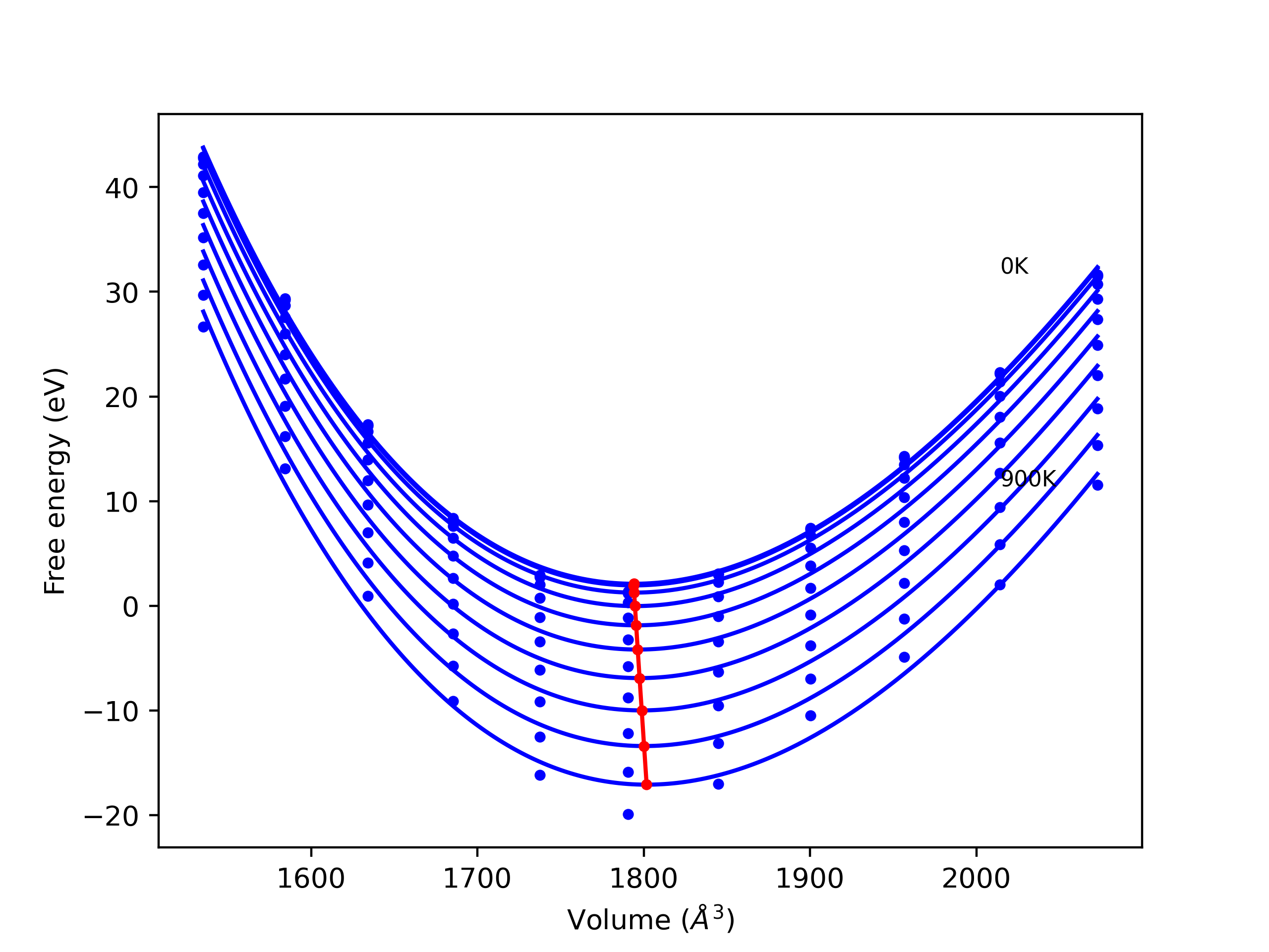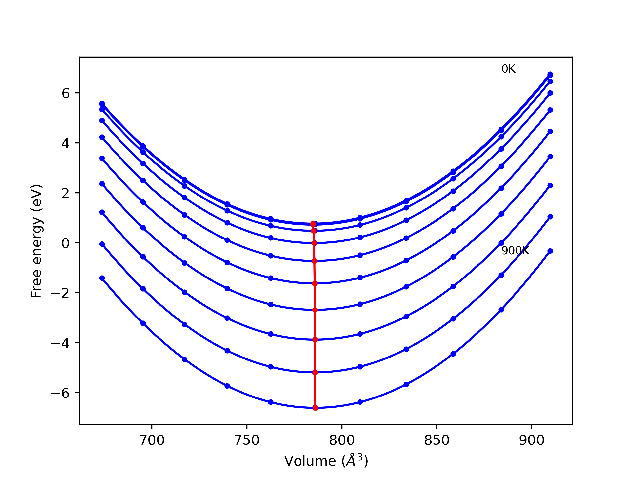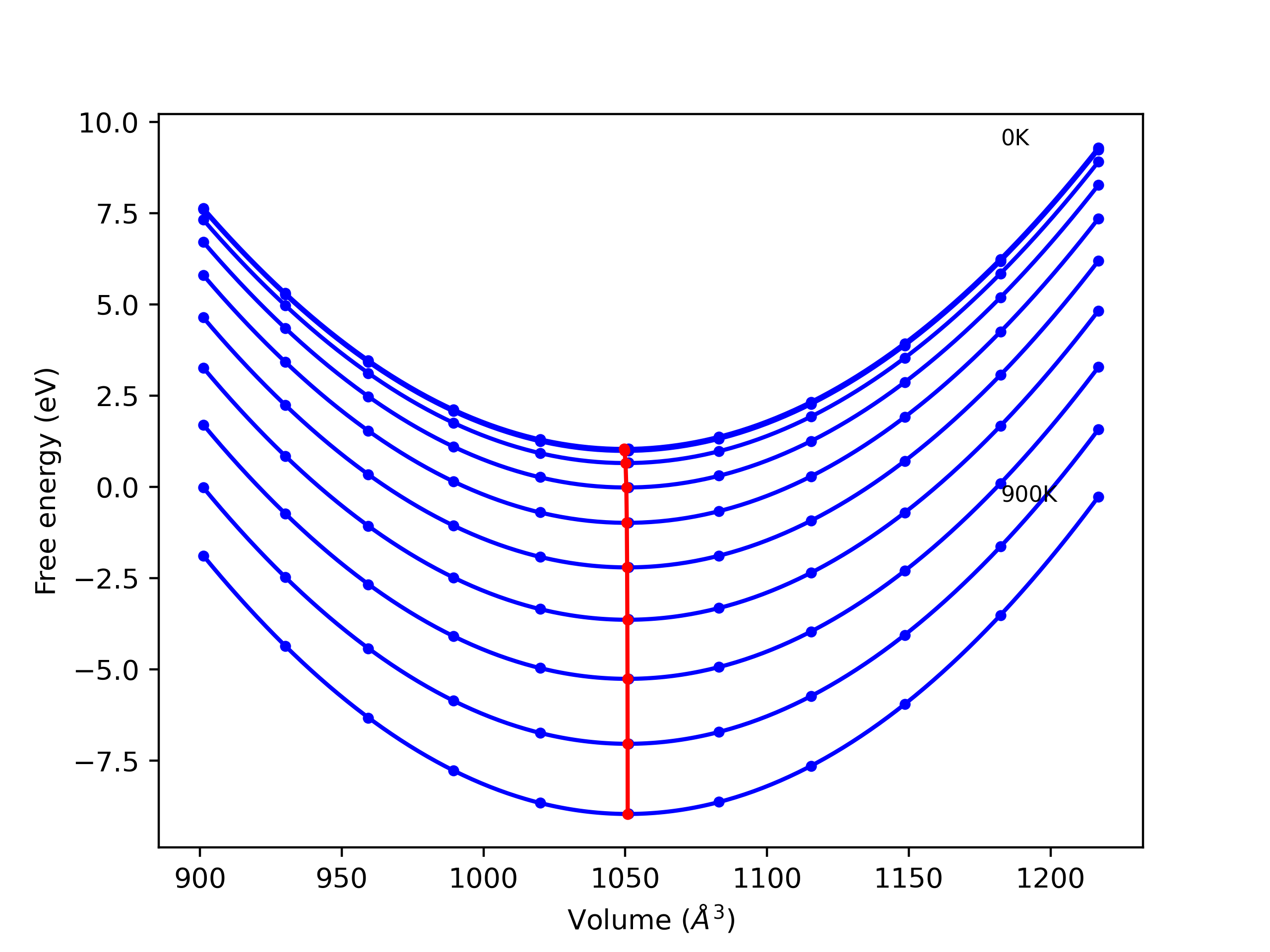 Phonon band structures and crystal properties estimated from quasi-harmonic approximation (QHA) calculations are displayed for select crystals. The calculations were performed using phonopy and LAMMPS. For the phonon calculations, 3x3 supercells of the potential-specific relaxed crystals were used. The QHA calculations were based on 11 strain states ranging from -0.05 to 0.05.