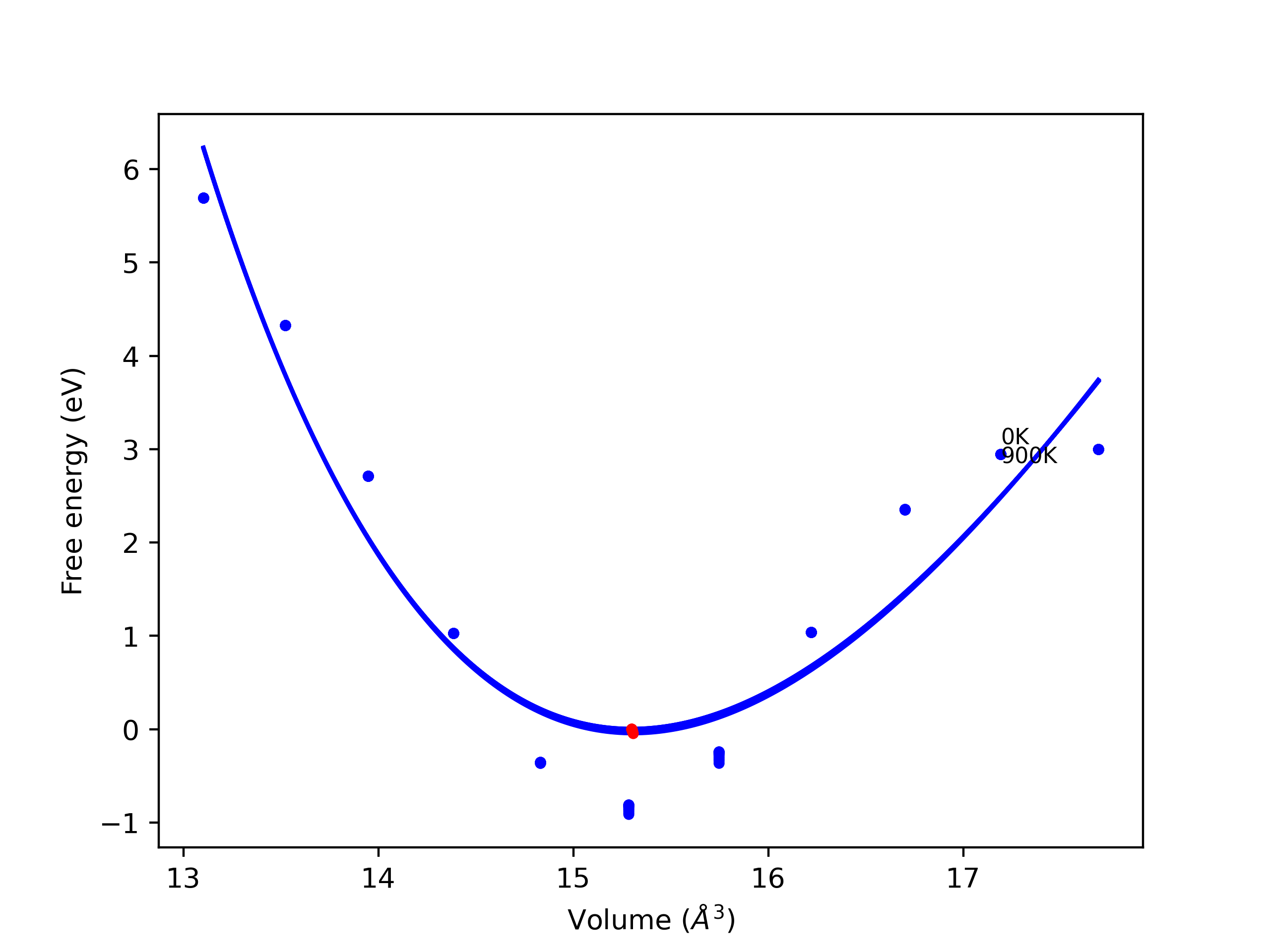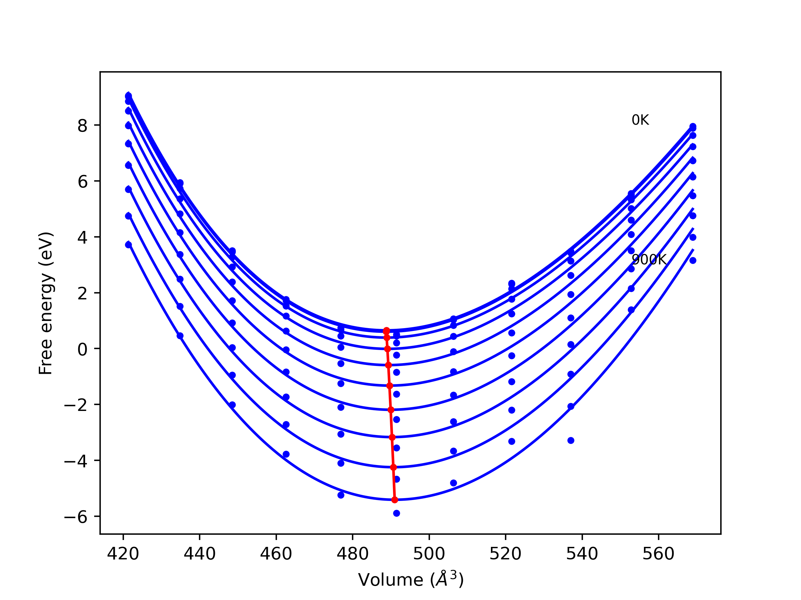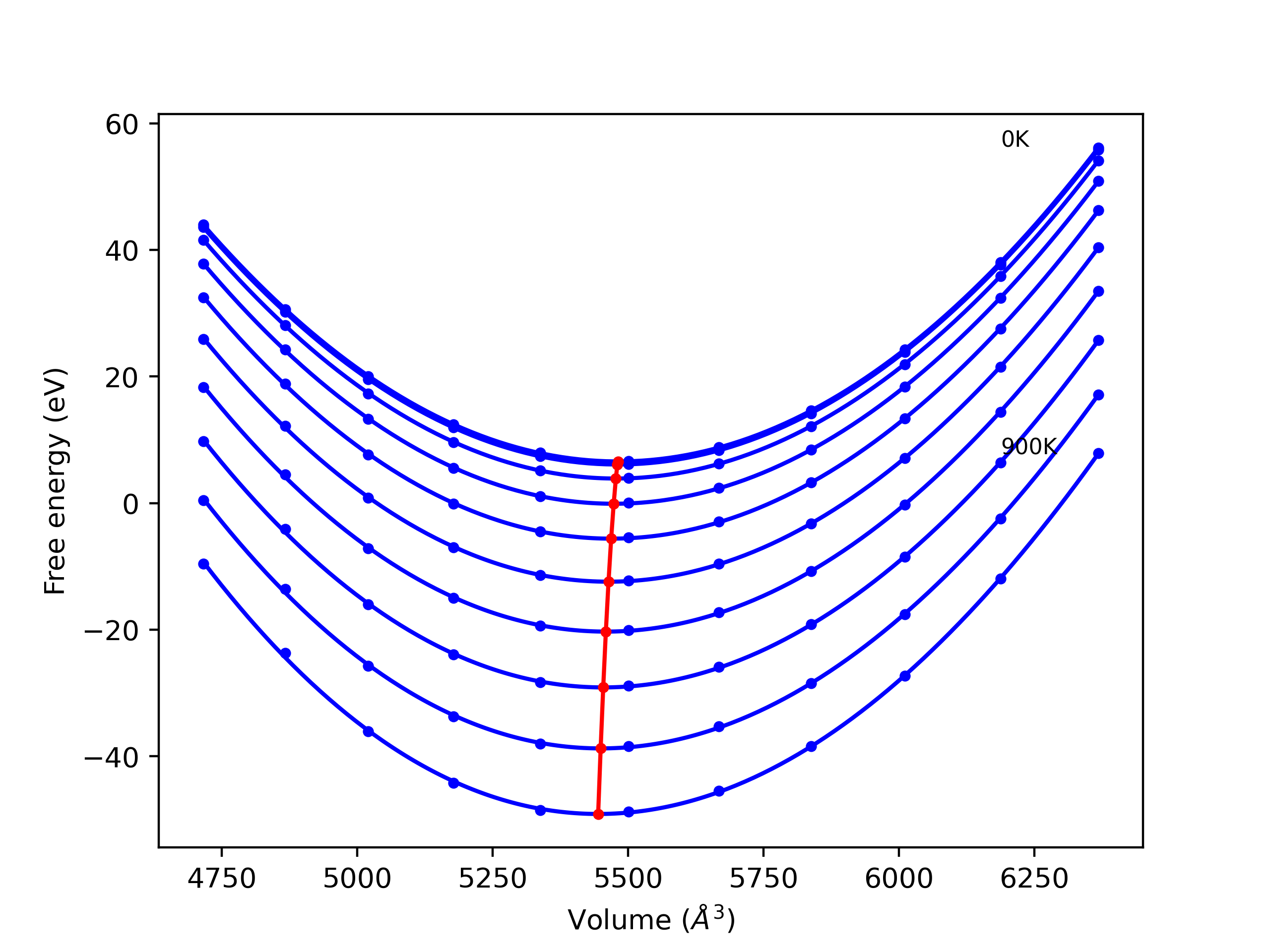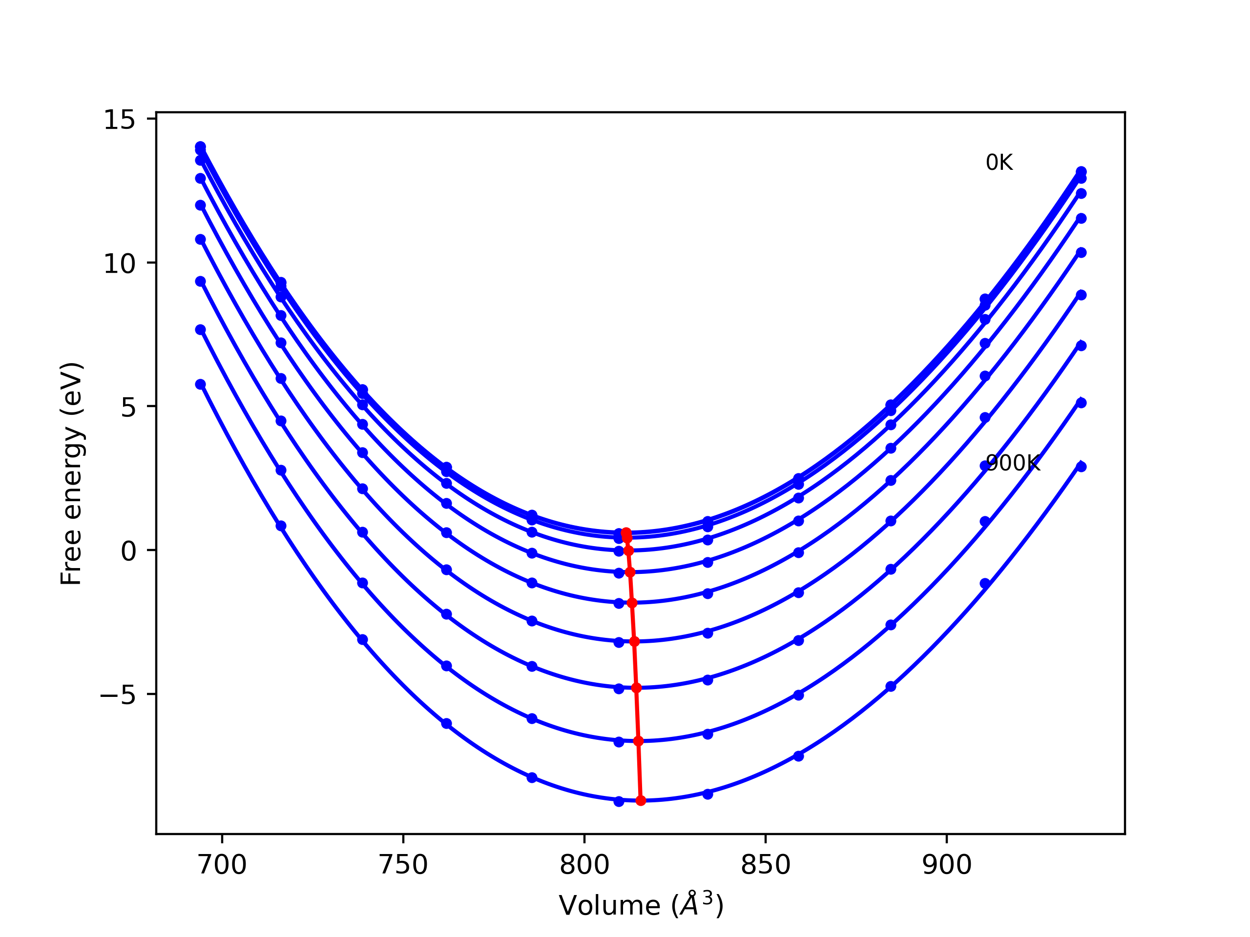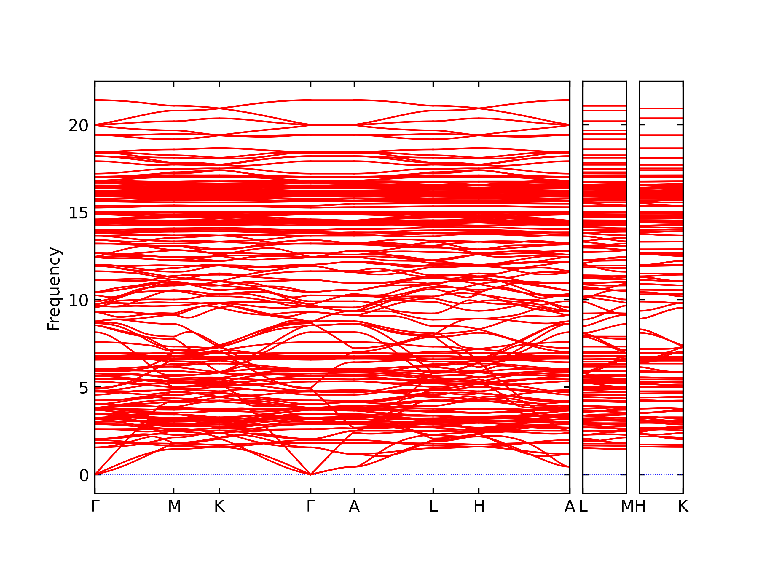 Phonon band structures and crystal properties estimated from quasi-harmonic approximation (QHA) calculations are displayed for select crystals. The calculations were performed using phonopy and LAMMPS. For the phonon calculations, 3x3 supercells of the potential-specific relaxed crystals were used. The QHA calculations were based on 11 strain states ranging from -0.05 to 0.05.