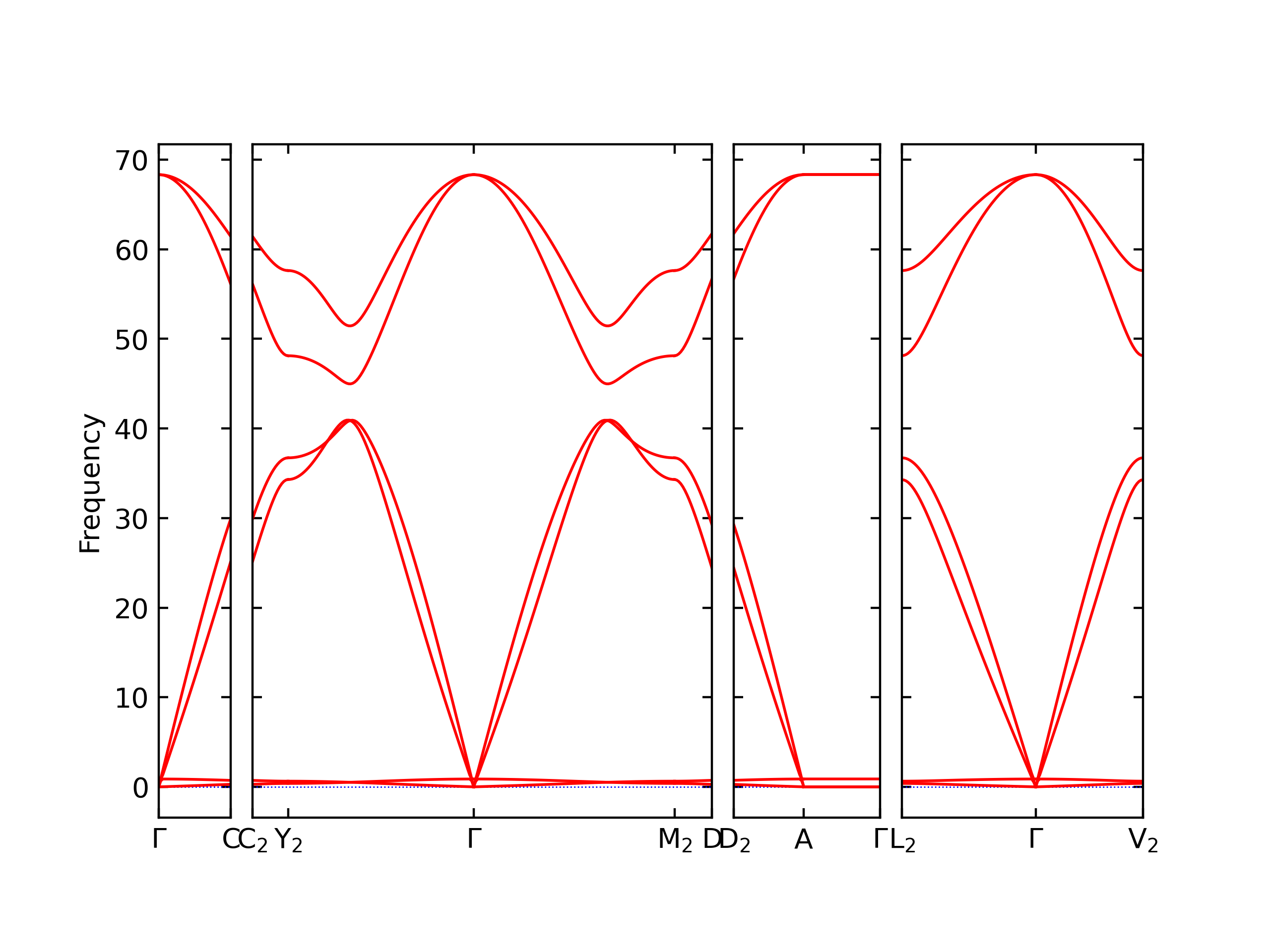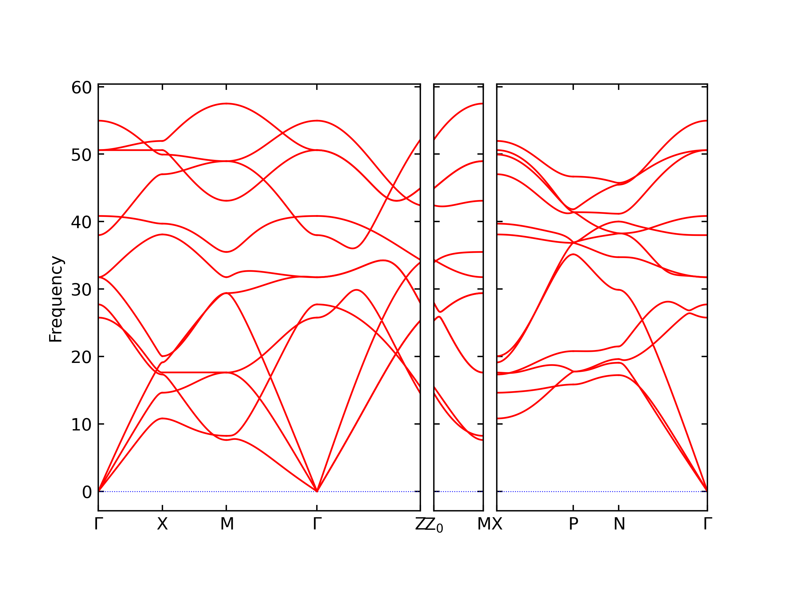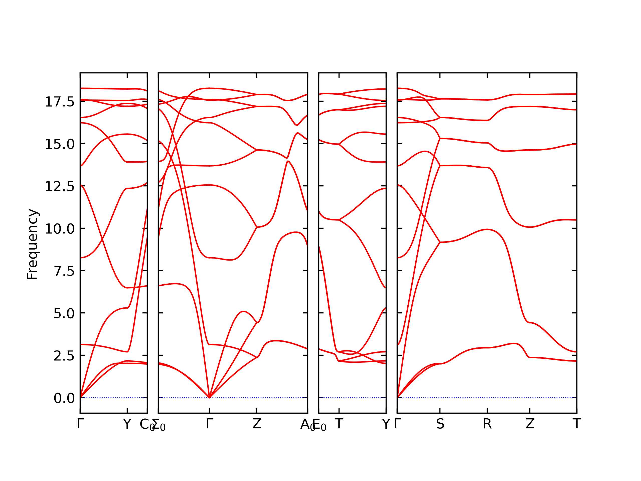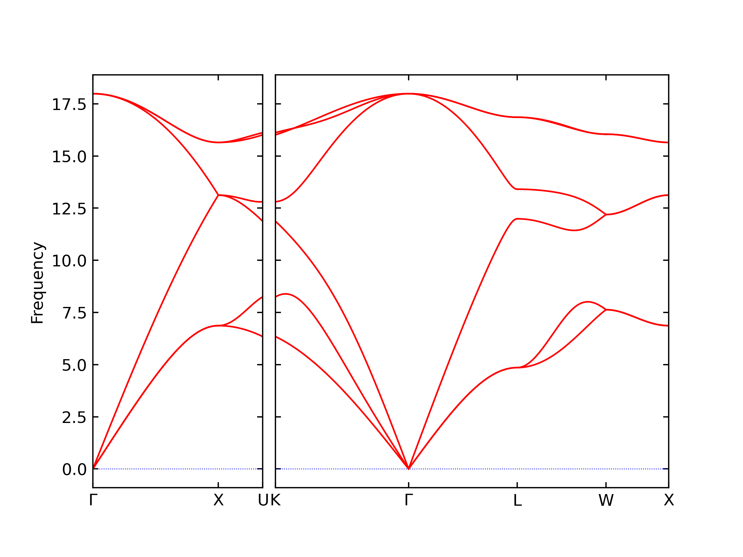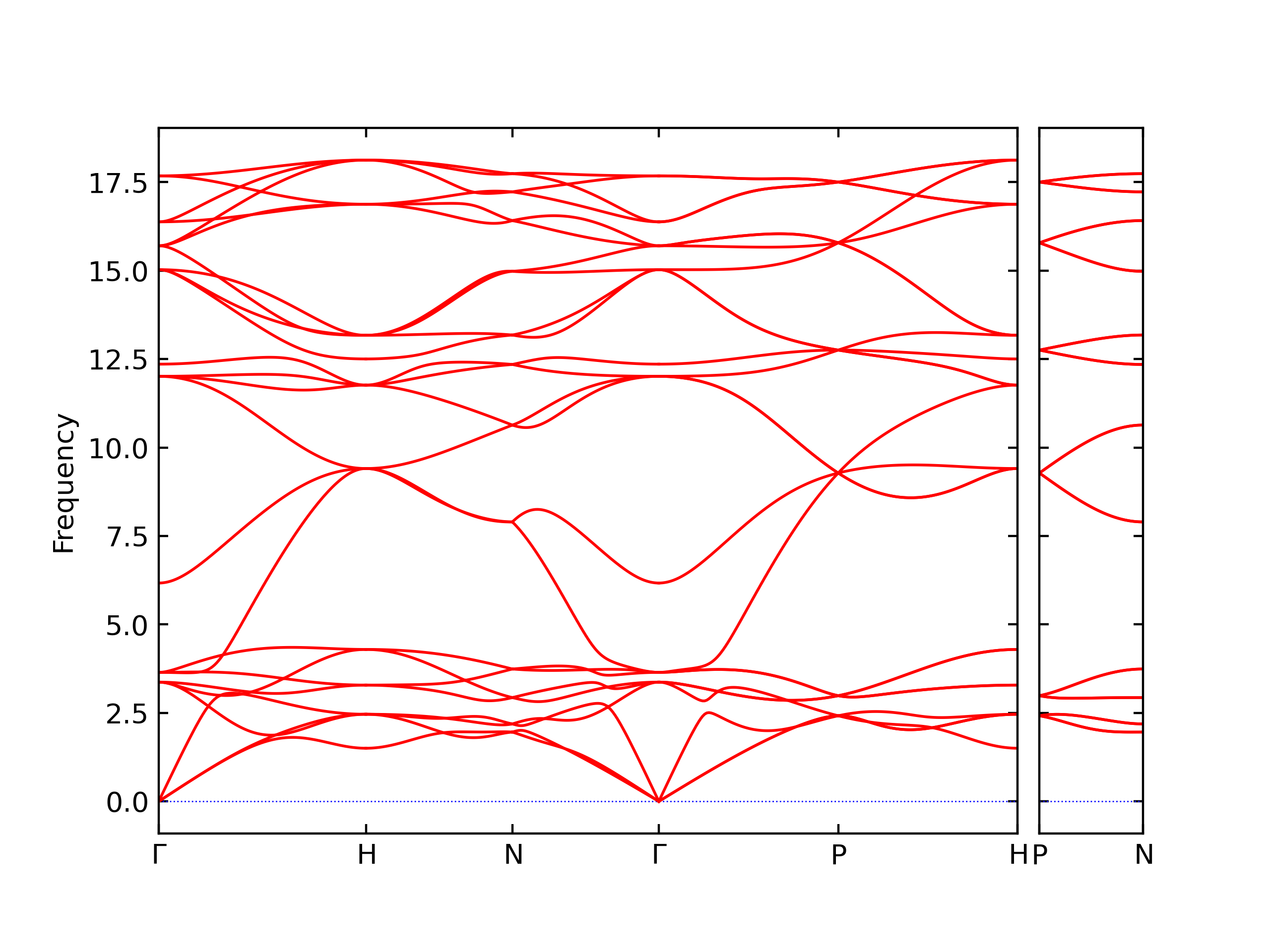 Phonon band structures and crystal properties estimated from quasi-harmonic approximation (QHA) calculations are displayed for select crystals. The calculations were performed using phonopy and LAMMPS. For the phonon calculations, 3x3 supercells of the potential-specific relaxed crystals were used. The QHA calculations were based on 11 strain states ranging from -0.05 to 0.05.