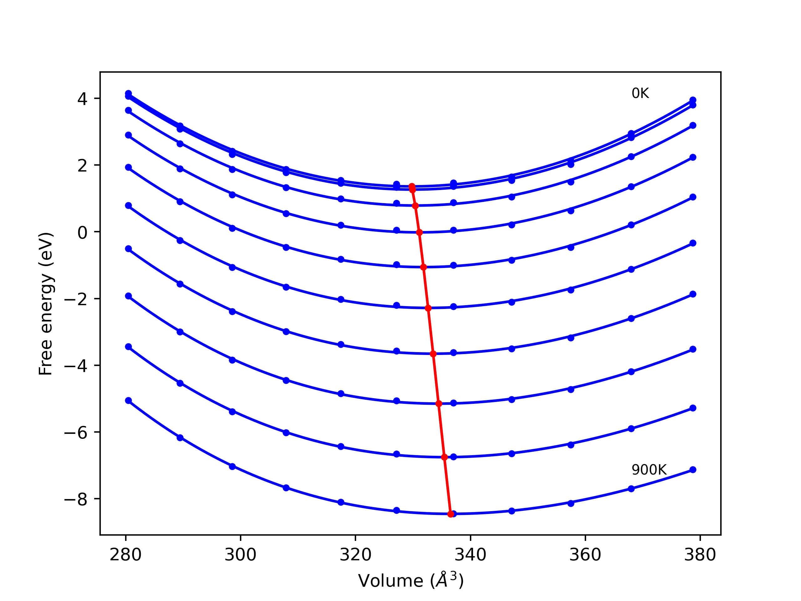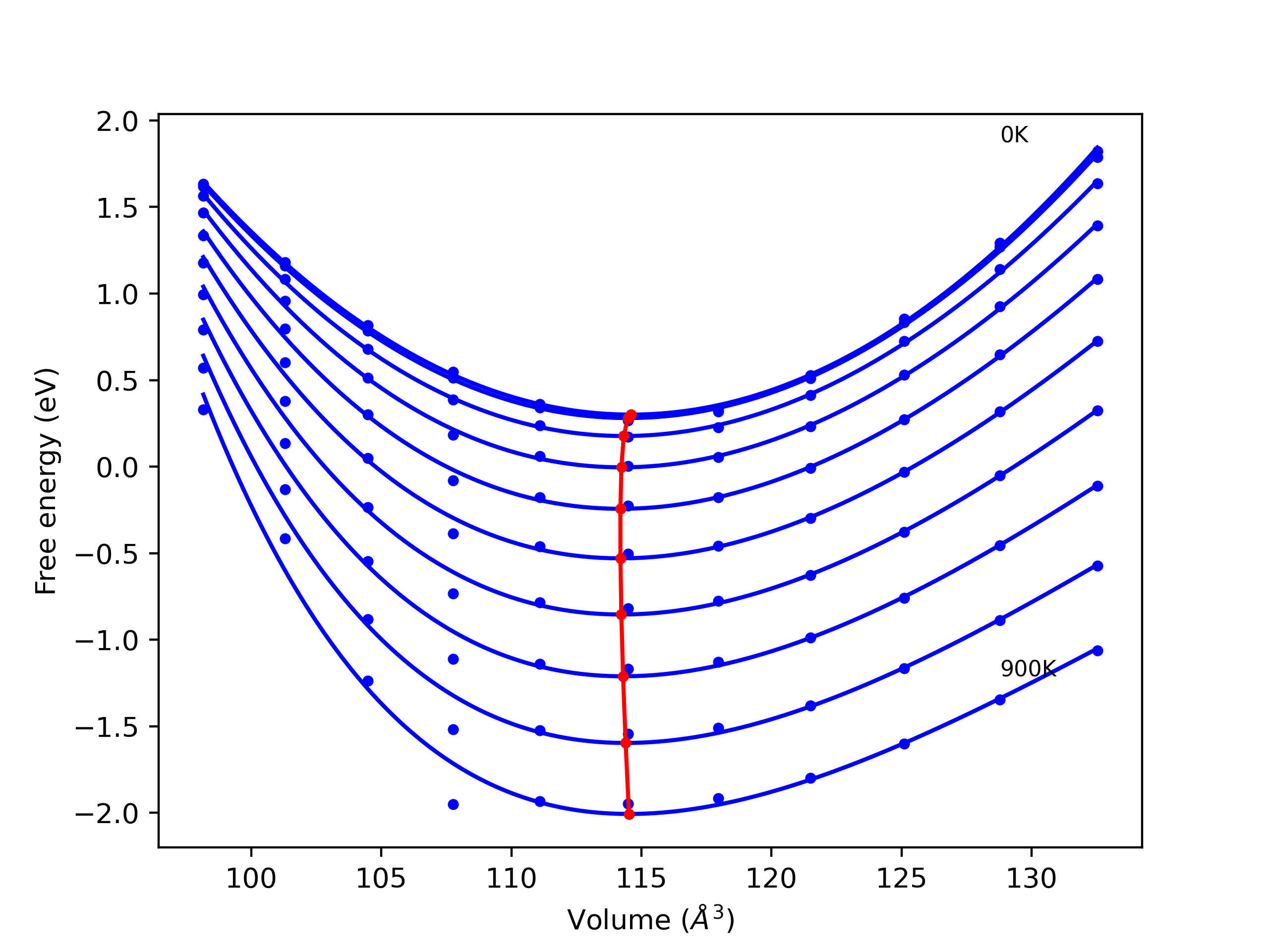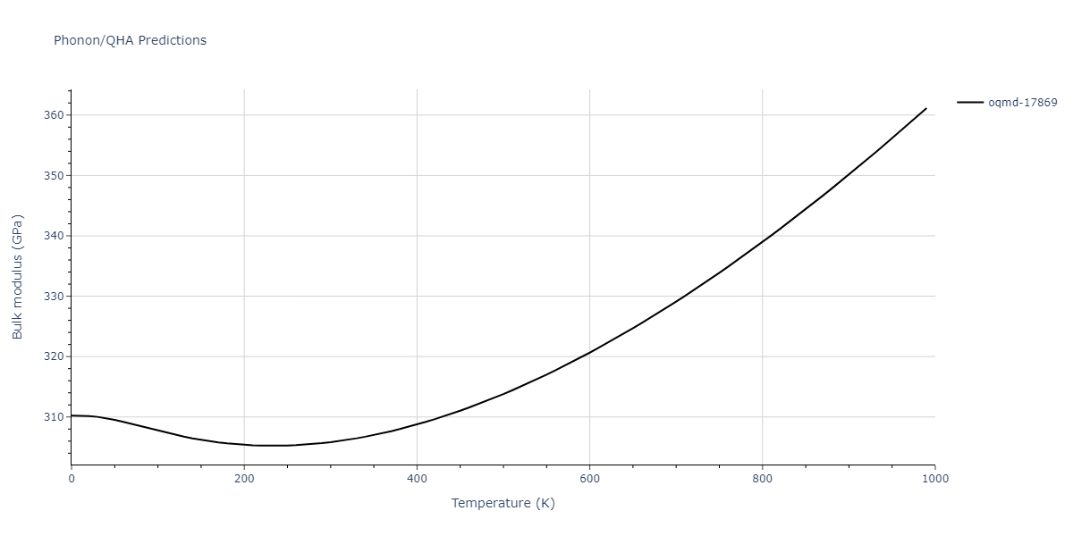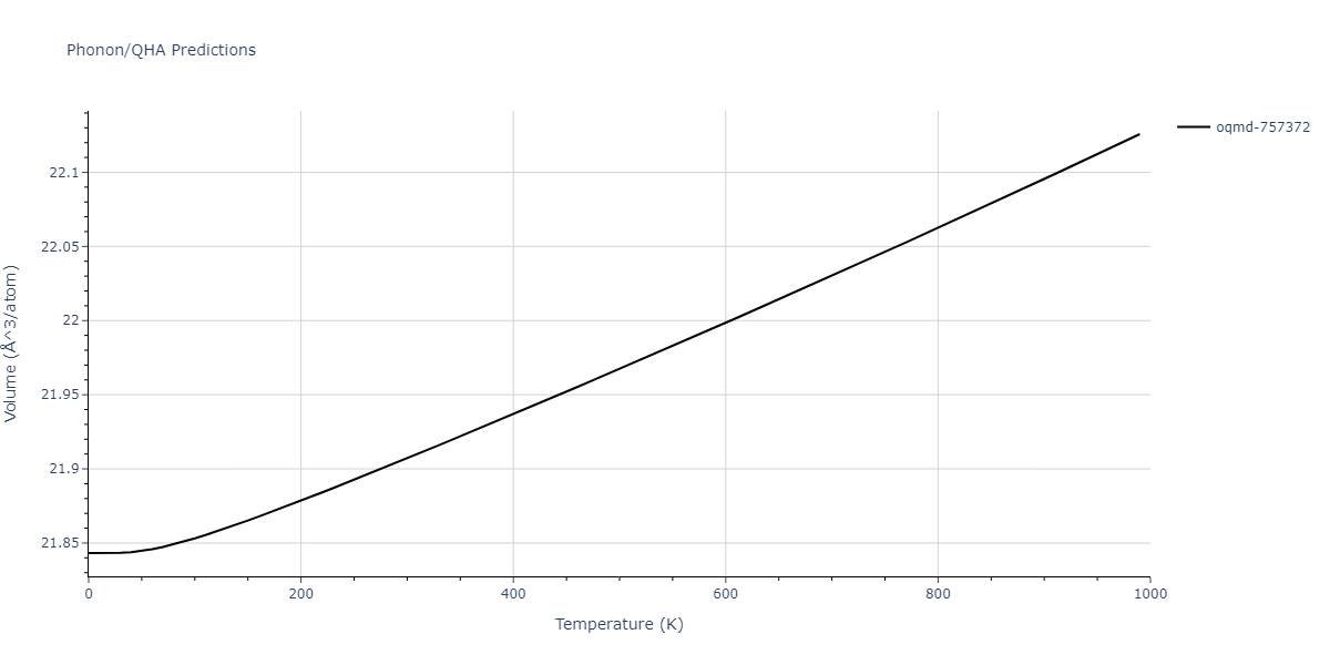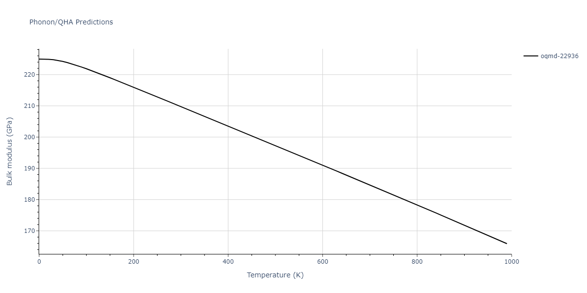 Plots of lattice and elastic constants are shown as a function of temperature. The 0K points were taken from the Crystal Structure Predictions and the Elastic Constants Predictions sections above for the unique crystal structures relaxed with the "dynamic" method. Starting from the 0 K relaxed crystal unit cells, supercell systems are created by replicating all three dimensions by the same multiplier to achieve at least 4000 atoms. The systems are then relaxed at 50 K and zero pressure using 1 million NPT steps. Lattice constants are estimated by averaging the measured box dimensions. Temperatures are iteratively increased by 50 K, with each subsequent relaxation calculation starting from the final atomic configuration at the previous temperature and relaxing for another 1 million steps.