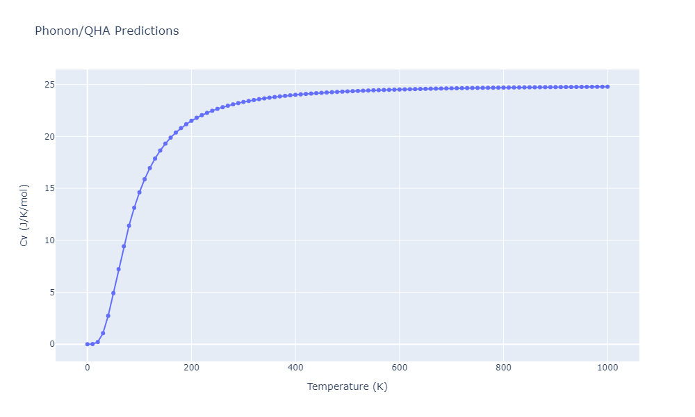 Plots of internal energy, Gibbs free energy, entropy, heat capacity and volume are shown here as a function of temperature for various crystal structures and liquid phases. The included crystal structures correspond to those in the Solid Structures vs. Temperature section, and the liquid phases to those in the Liquid Properties section. Internal energy and volume are taken from the associated structure relaxations mentioned in those previous sections. Constant pressure heat capacity is estimated using 3-point numerical derivatives of enthalpy versus temperature. Note that since all simulations done here are at 0 pressure, internal energy and enthalpy are equivalent.