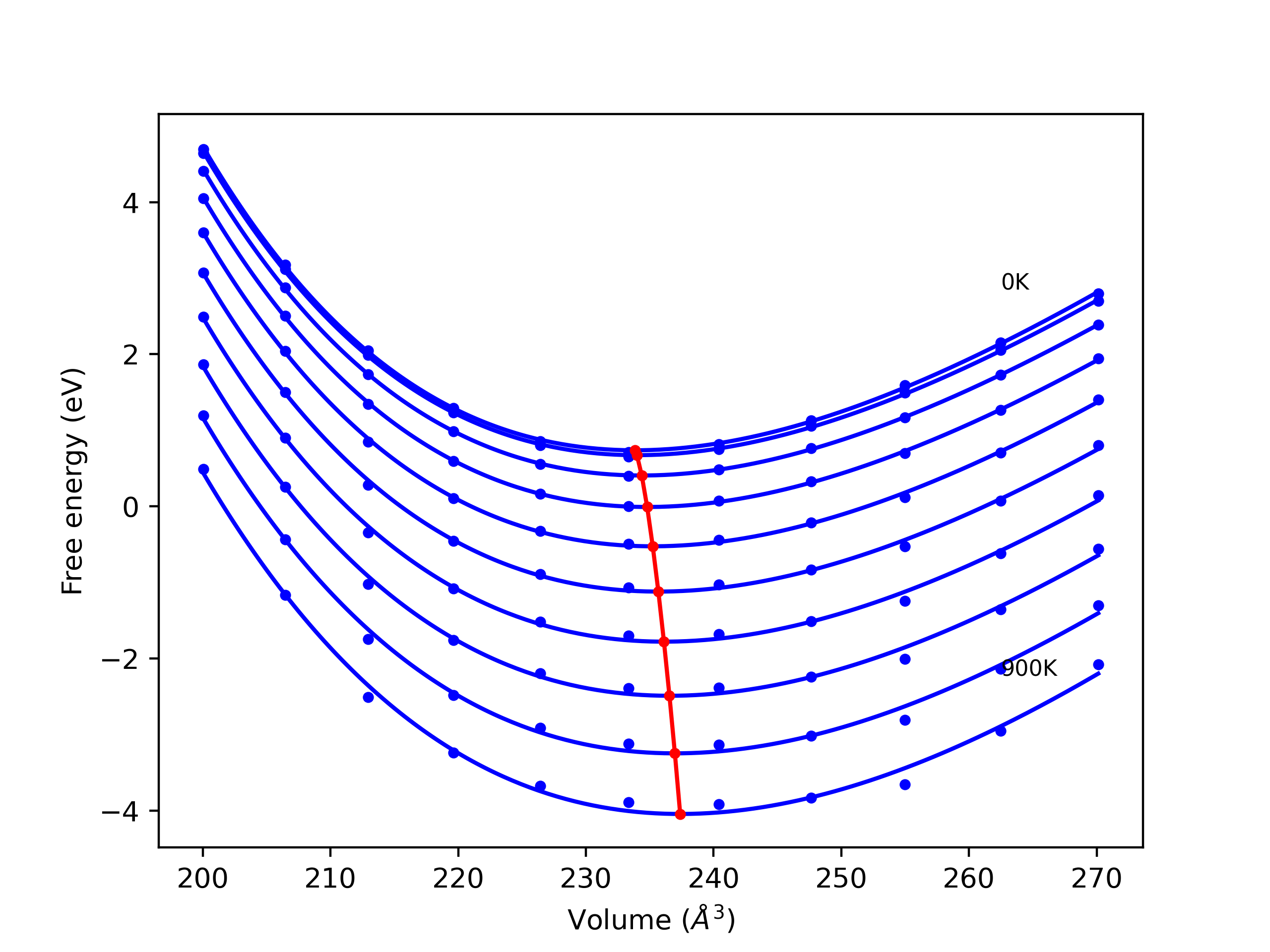 The Gibbs energies of the phases are estimated using thermodynamic integration between the interatomic potential in question and a simpler model with known Gibbs free energy values. For solids, the reference model is an Einstein solid, while for liquids it is the Uhlenbeck-Ford potential. Besides a short run at the start of the solid calculations to estimate Einstein model spring constants, the two calculations proceed similarly. Starting with the final relaxation configurations, the systems are stabilized for 25,000 steps. Then, over the next 50,000 steps the potential is swapped out for the reference potential. The system is then stabilized for another 25,000 steps with the reference model before a reverse swap of 50,000 steps is performed. The simulation ends with one final 25,000 step stabilization period. From the simulation, the irreversible work of transformation is estimated and used to compute the absolute Gibbs free energy of the target phase and potential relative to the reference potential. Entropy is estimated as the difference in enthalpy and Gibbs free energy and divided by temperature.