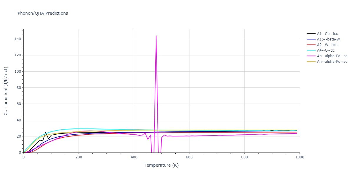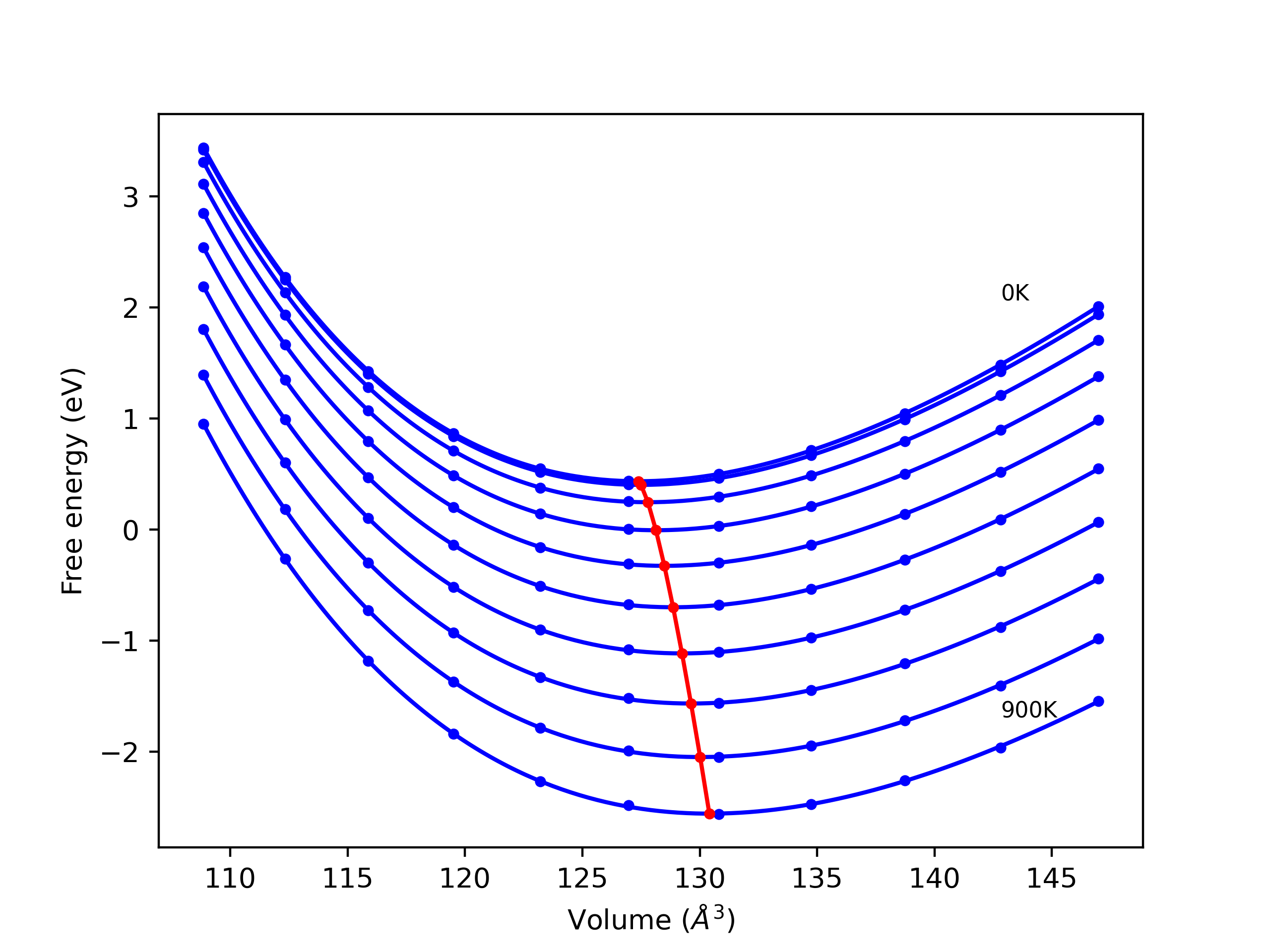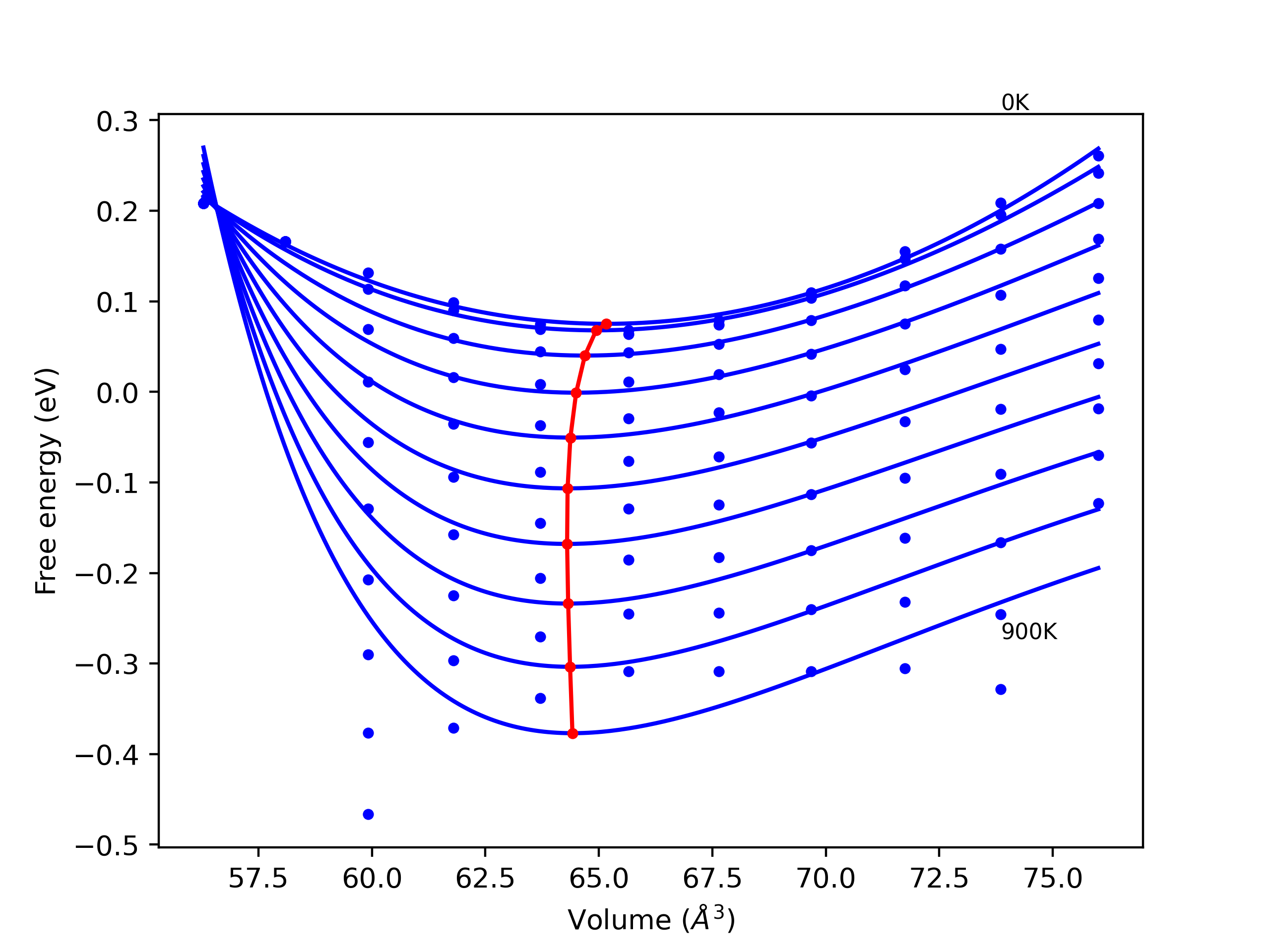 Phonon band structures and crystal properties estimated from quasi-harmonic approximation (QHA) calculations are displayed for select crystals. The calculations were performed using phonopy and LAMMPS. For the phonon calculations, 3x3 supercells of the potential-specific relaxed crystals were used. The QHA calculations were based on 11 strain states ranging from -0.05 to 0.05.