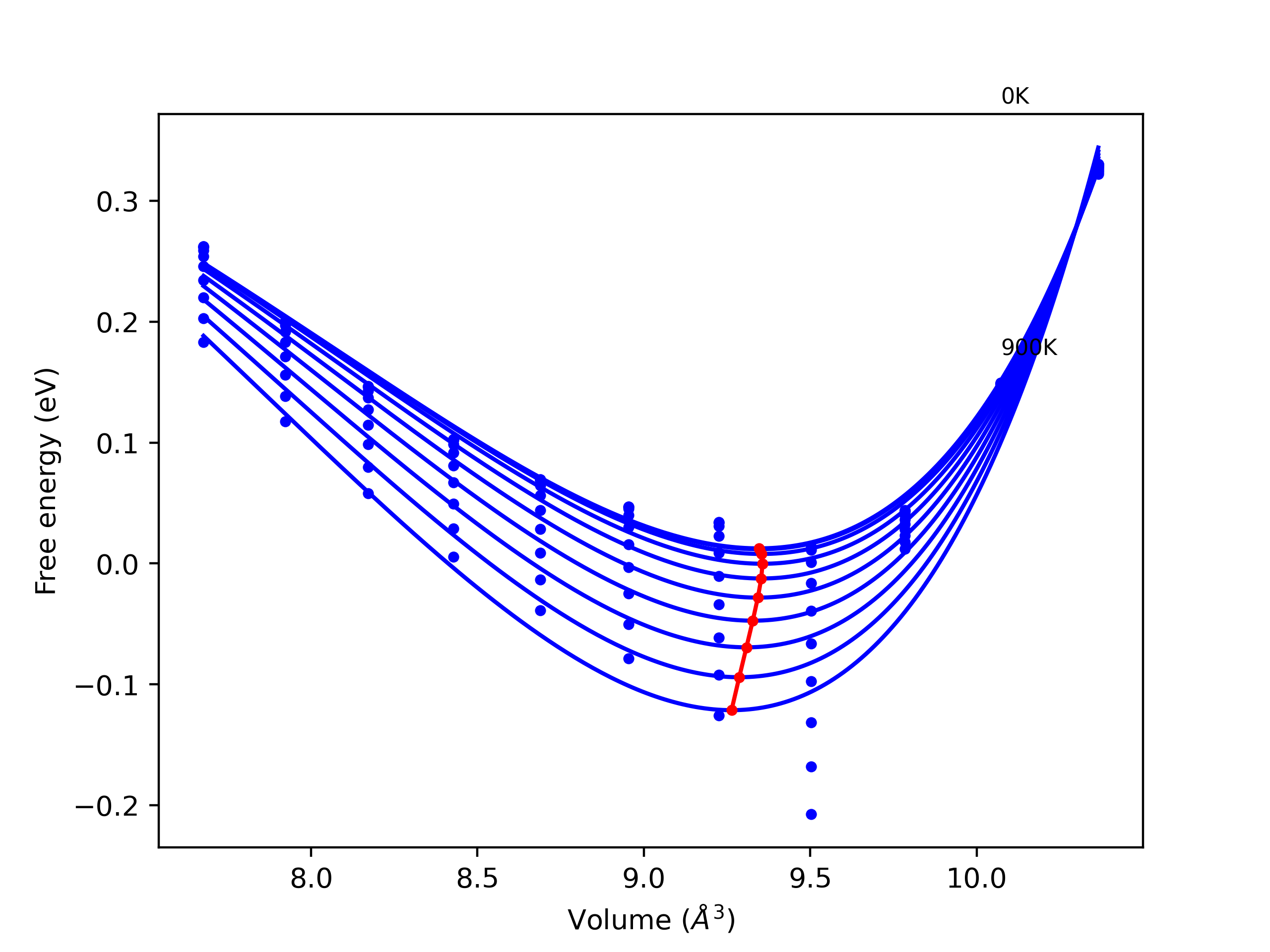 Plots of internal energy, Gibbs free energy, entropy, heat capacity and volume are shown here as a function of temperature for various crystal structures and liquid phases. The included crystal structures correspond to those in the Solid Structures vs. Temperature section, and the liquid phases to those in the Liquid Properties section. Internal energy and volume are taken from the associated structure relaxations mentioned in those previous sections. Constant pressure heat capacity is estimated using 3-point numerical derivatives of enthalpy versus temperature. Note that since all simulations done here are at 0 pressure, internal energy and enthalpy are equivalent.
