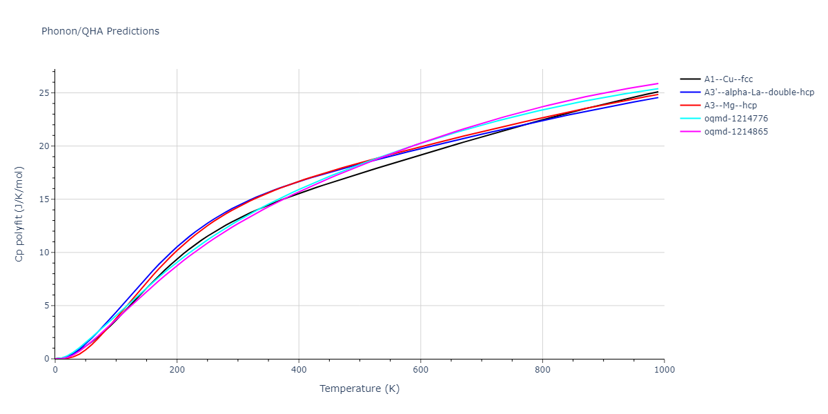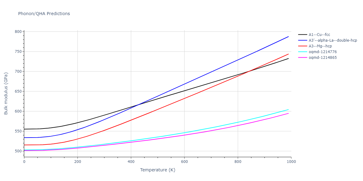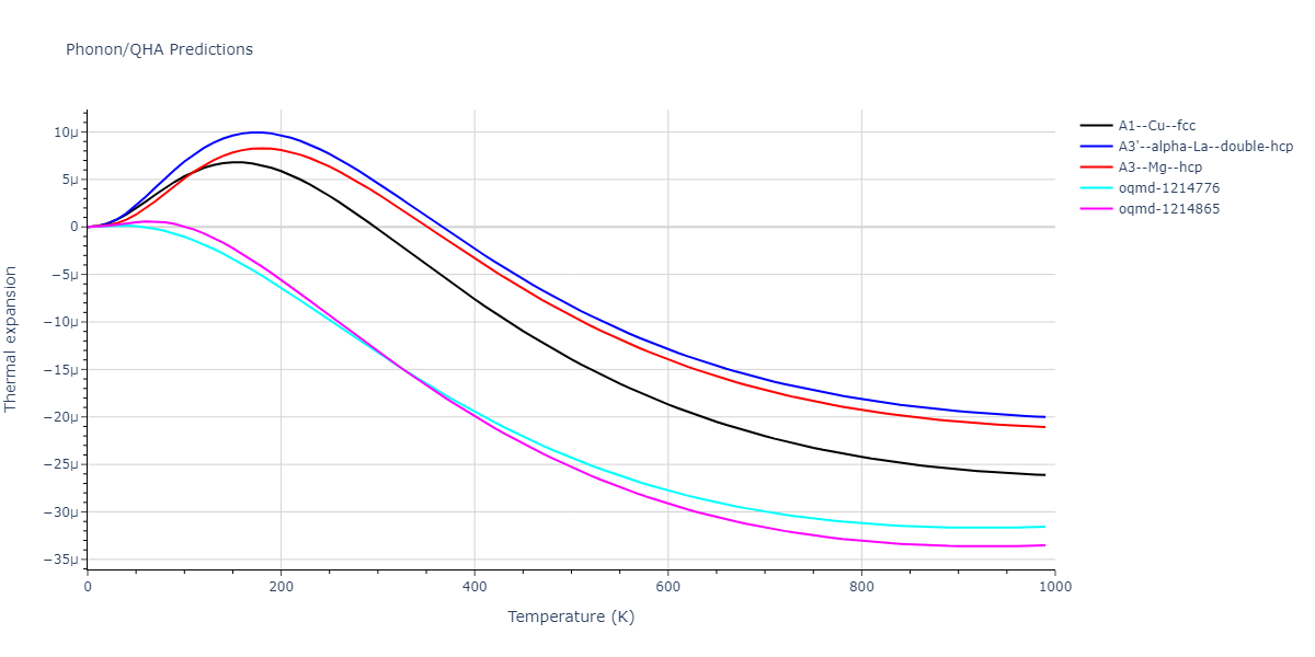 Phonon band structures and crystal properties estimated from quasi-harmonic approximation (QHA) calculations are displayed for select crystals. The calculations were performed using phonopy and LAMMPS. For the phonon calculations, 3x3 supercells of the potential-specific relaxed crystals were used. The QHA calculations were based on 11 strain states ranging from -0.05 to 0.05.