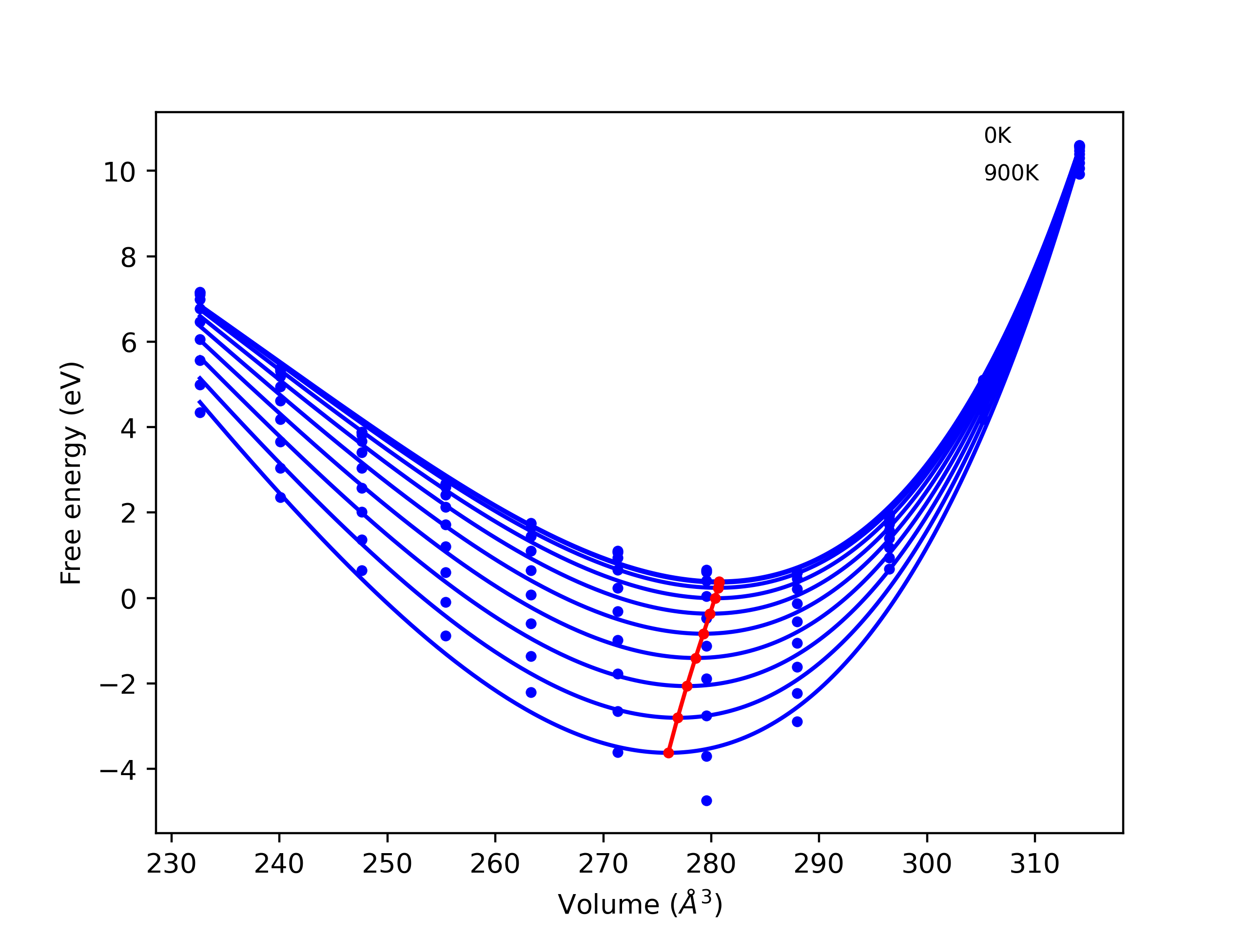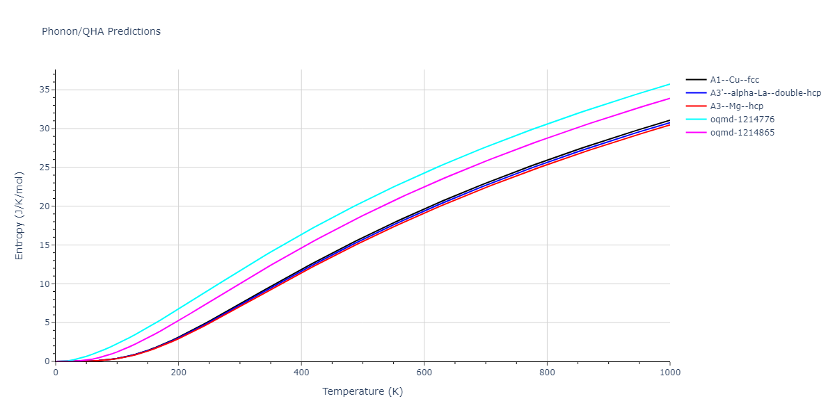 The Gibbs energies of the phases are estimated using thermodynamic integration between the interatomic potential in question and a simpler model with known Gibbs free energy values. For solids, the reference model is an Einstein solid, while for liquids it is the Uhlenbeck-Ford potential. Besides a short run at the start of the solid calculations to estimate Einstein model spring constants, the two calculations proceed similarly. Starting with the final relaxation configurations, the systems are stabilized for 25,000 steps. Then, over the next 50,000 steps the potential is swapped out for the reference potential. The system is then stabilized for another 25,000 steps with the reference model before a reverse swap of 50,000 steps is performed. The simulation ends with one final 25,000 step stabilization period. From the simulation, the irreversible work of transformation is estimated and used to compute the absolute Gibbs free energy of the target phase and potential relative to the reference potential. Entropy is estimated as the difference in enthalpy and Gibbs free energy and divided by temperature.