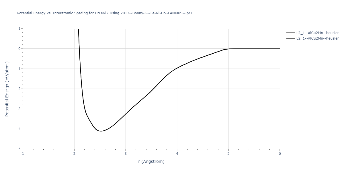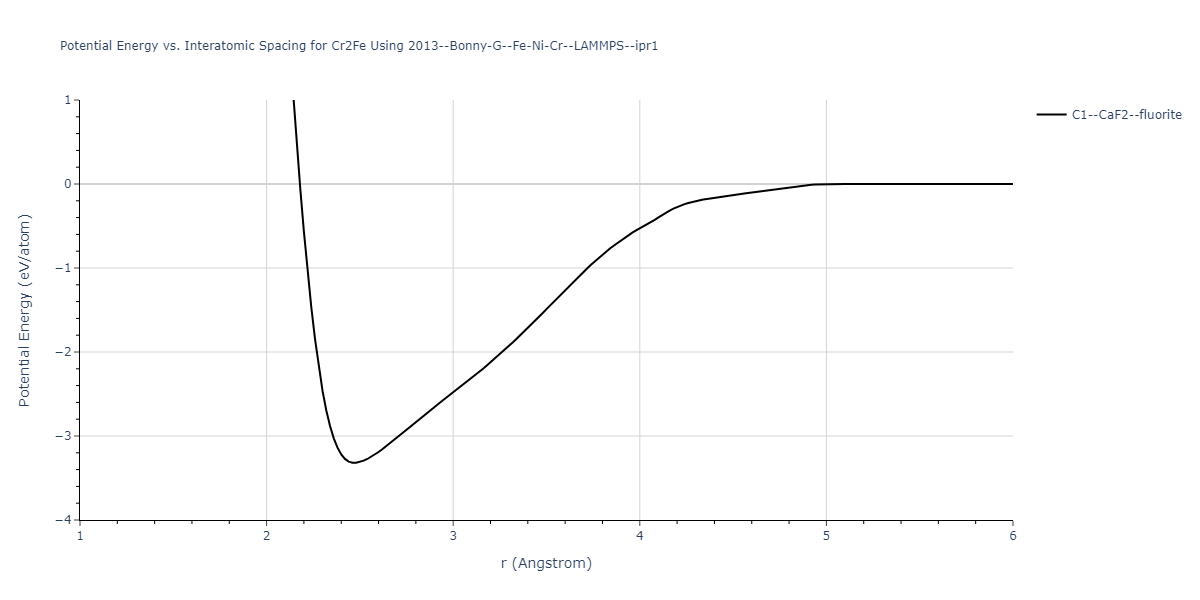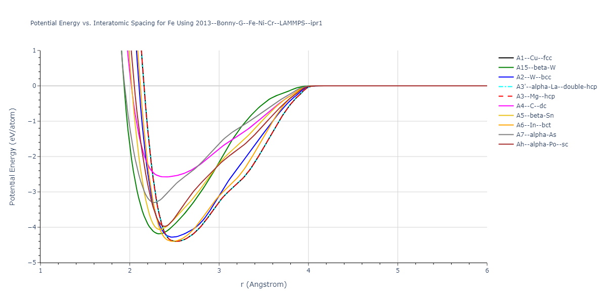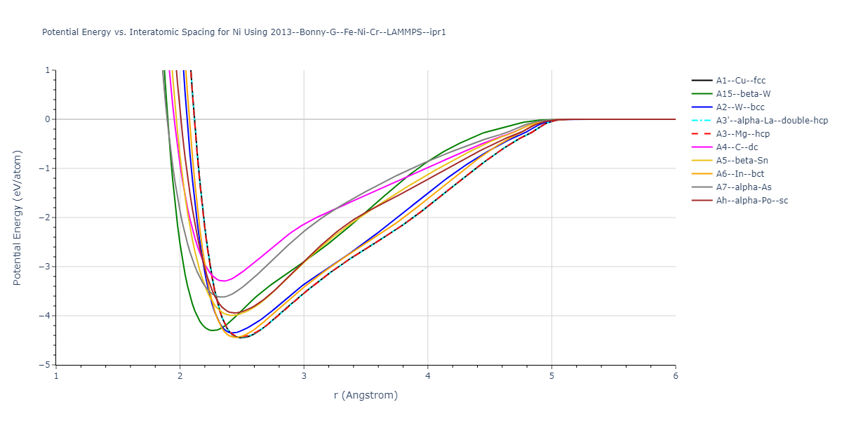 Plots of potential energy vs interatomic spacing, r, are shown below for a number of crystal structures. The structures are generated based on the ideal atomic positions and b/a and c/a lattice parameter ratios for a given crystal prototype. The size of the system is then uniformly scaled, and the energy calculated without relaxing the system. To obtain these plots, values of r are evaluated every 0.02 Å up to 6 Å.