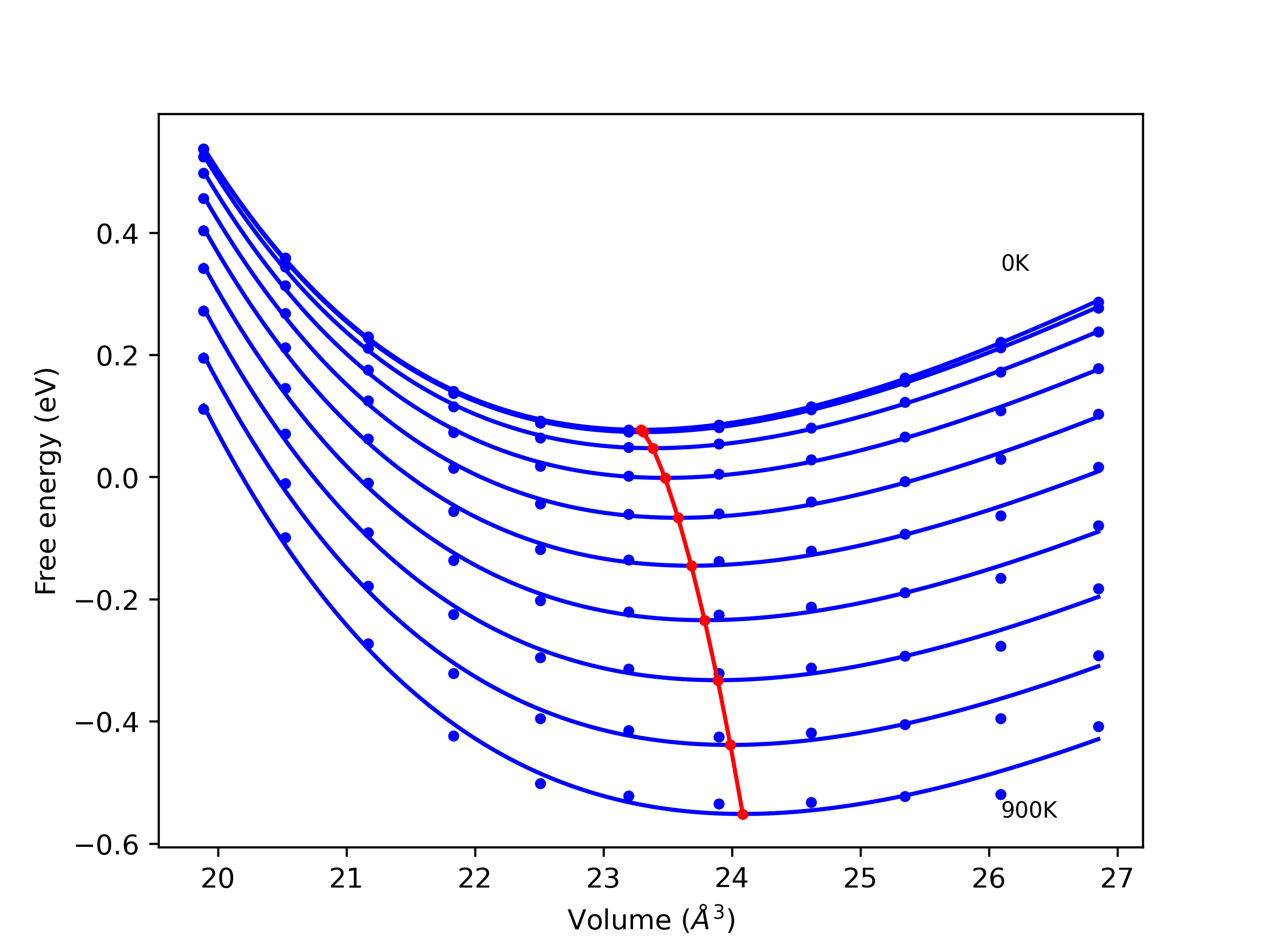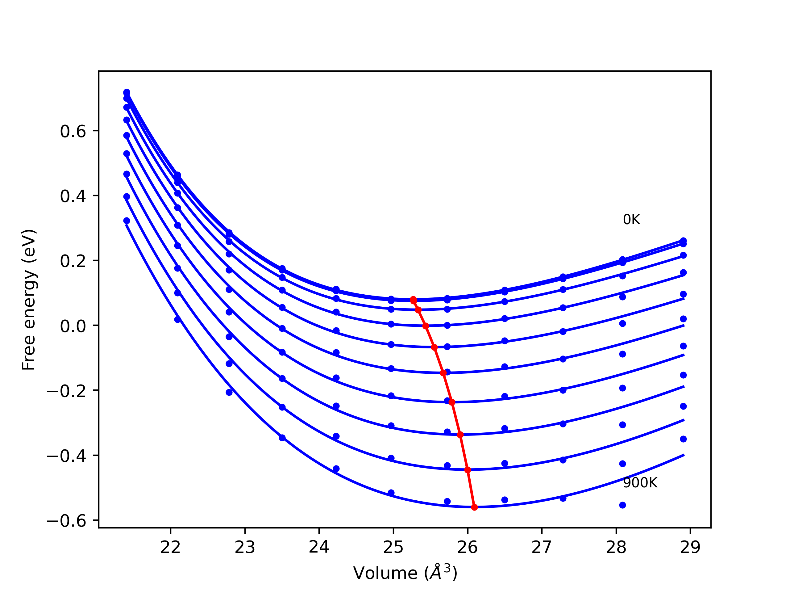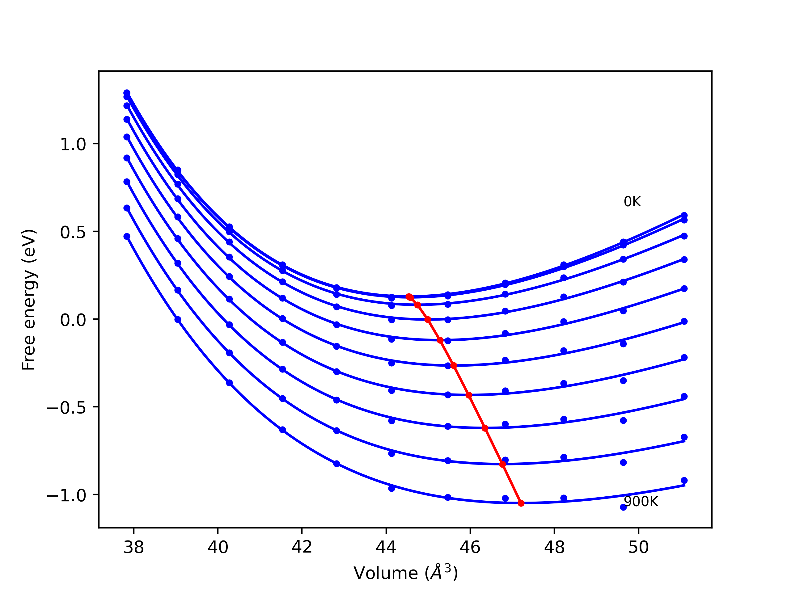 The Gibbs energies of the phases are estimated using thermodynamic integration between the interatomic potential in question and a simpler model with known Gibbs free energy values. For solids, the reference model is an Einstein solid, while for liquids it is the Uhlenbeck-Ford potential. Besides a short run at the start of the solid calculations to estimate Einstein model spring constants, the two calculations proceed similarly. Starting with the final relaxation configurations, the systems are stabilized for 25,000 steps. Then, over the next 50,000 steps the potential is swapped out for the reference potential. The system is then stabilized for another 25,000 steps with the reference model before a reverse swap of 50,000 steps is performed. The simulation ends with one final 25,000 step stabilization period. From the simulation, the irreversible work of transformation is estimated and used to compute the absolute Gibbs free energy of the target phase and potential relative to the reference potential. Entropy is estimated as the difference in enthalpy and Gibbs free energy and divided by temperature.