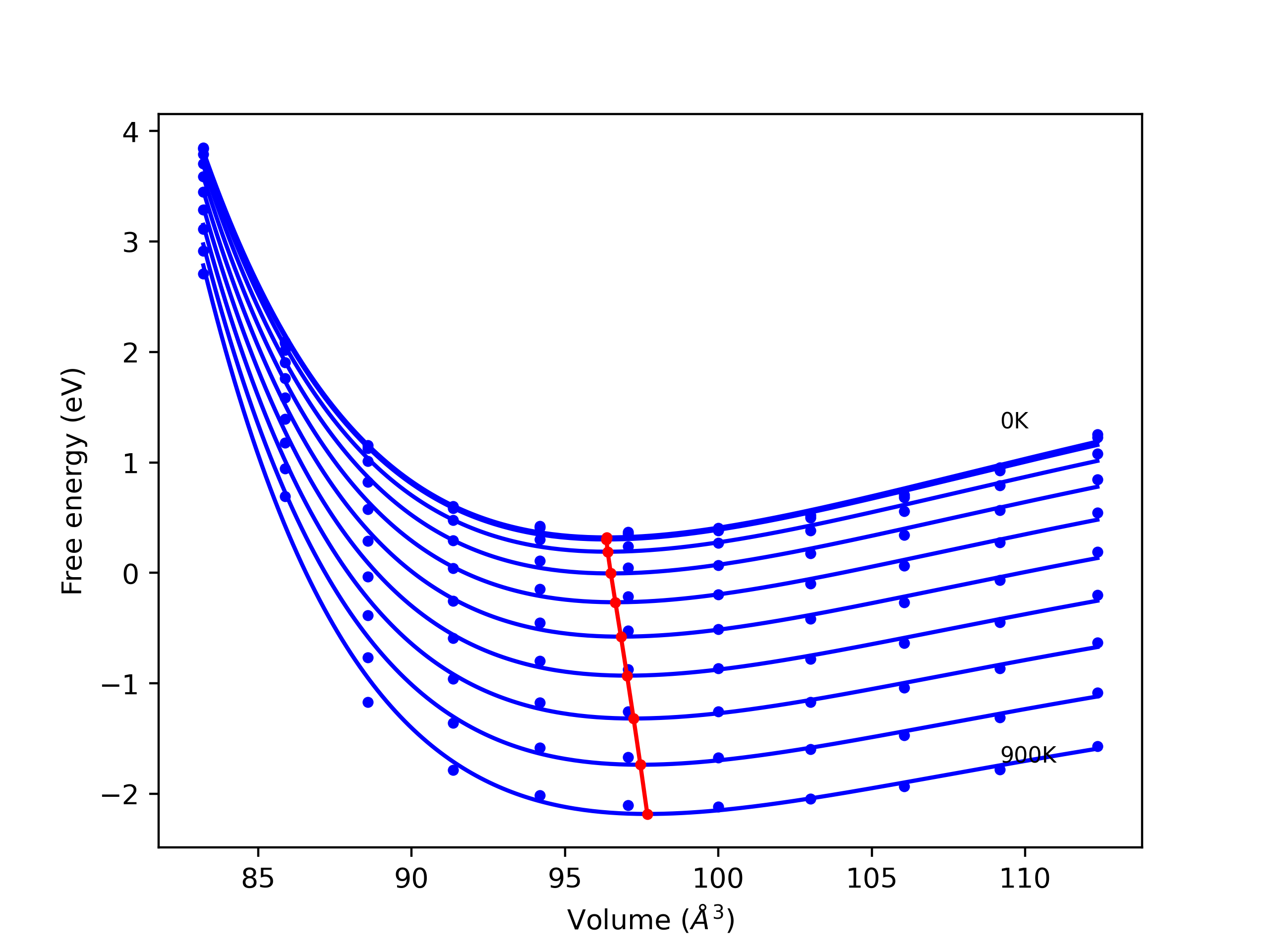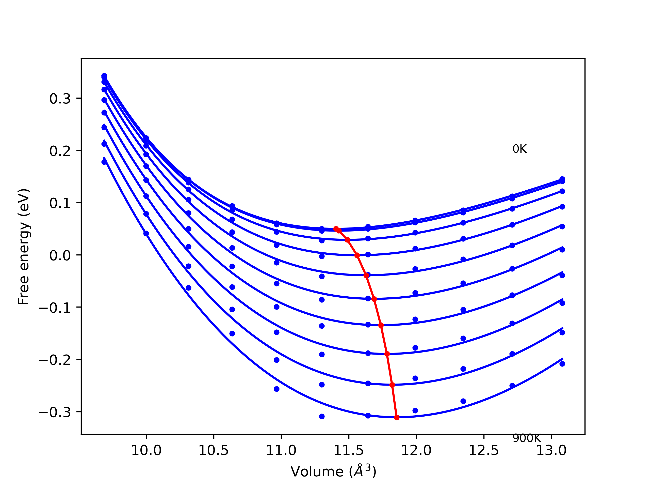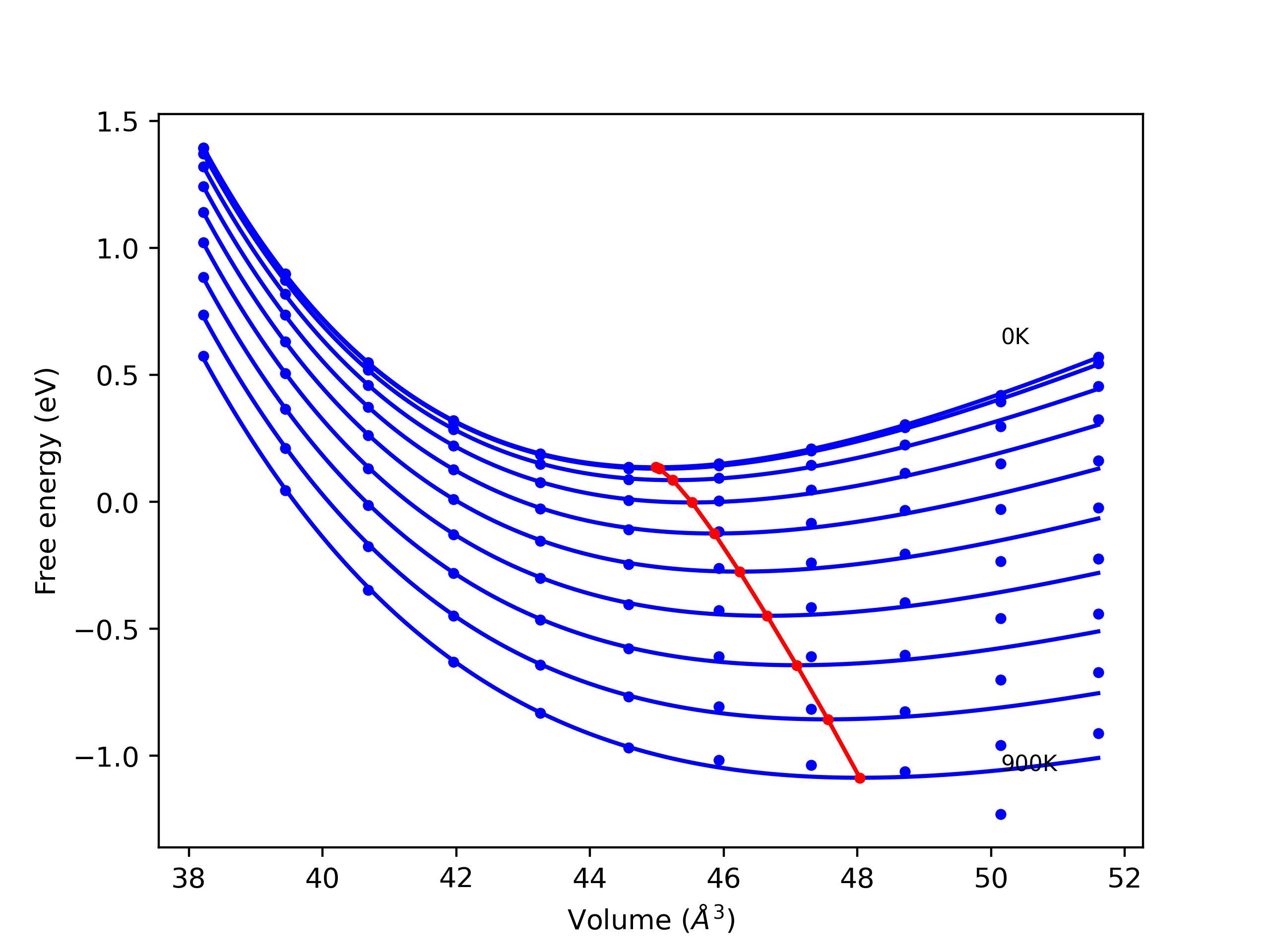 The Gibbs energies of the phases are estimated using thermodynamic integration between the interatomic potential in question and a simpler model with known Gibbs free energy values. For solids, the reference model is an Einstein solid, while for liquids it is the Uhlenbeck-Ford potential. Besides a short run at the start of the solid calculations to estimate Einstein model spring constants, the two calculations proceed similarly. Starting with the final relaxation configurations, the systems are stabilized for 25,000 steps. Then, over the next 50,000 steps the potential is swapped out for the reference potential. The system is then stabilized for another 25,000 steps with the reference model before a reverse swap of 50,000 steps is performed. The simulation ends with one final 25,000 step stabilization period. From the simulation, the irreversible work of transformation is estimated and used to compute the absolute Gibbs free energy of the target phase and potential relative to the reference potential. Entropy is estimated as the difference in enthalpy and Gibbs free energy and divided by temperature.