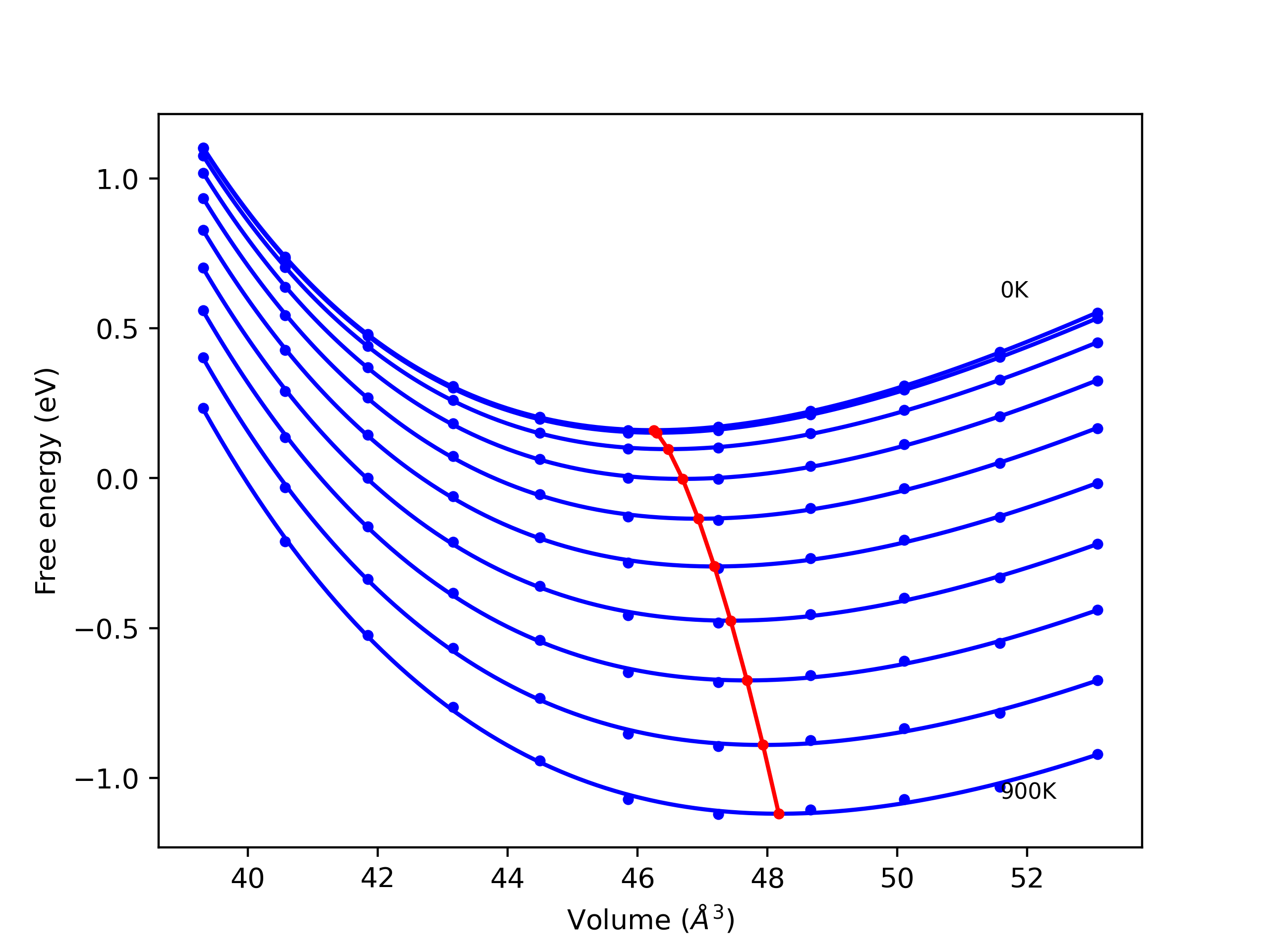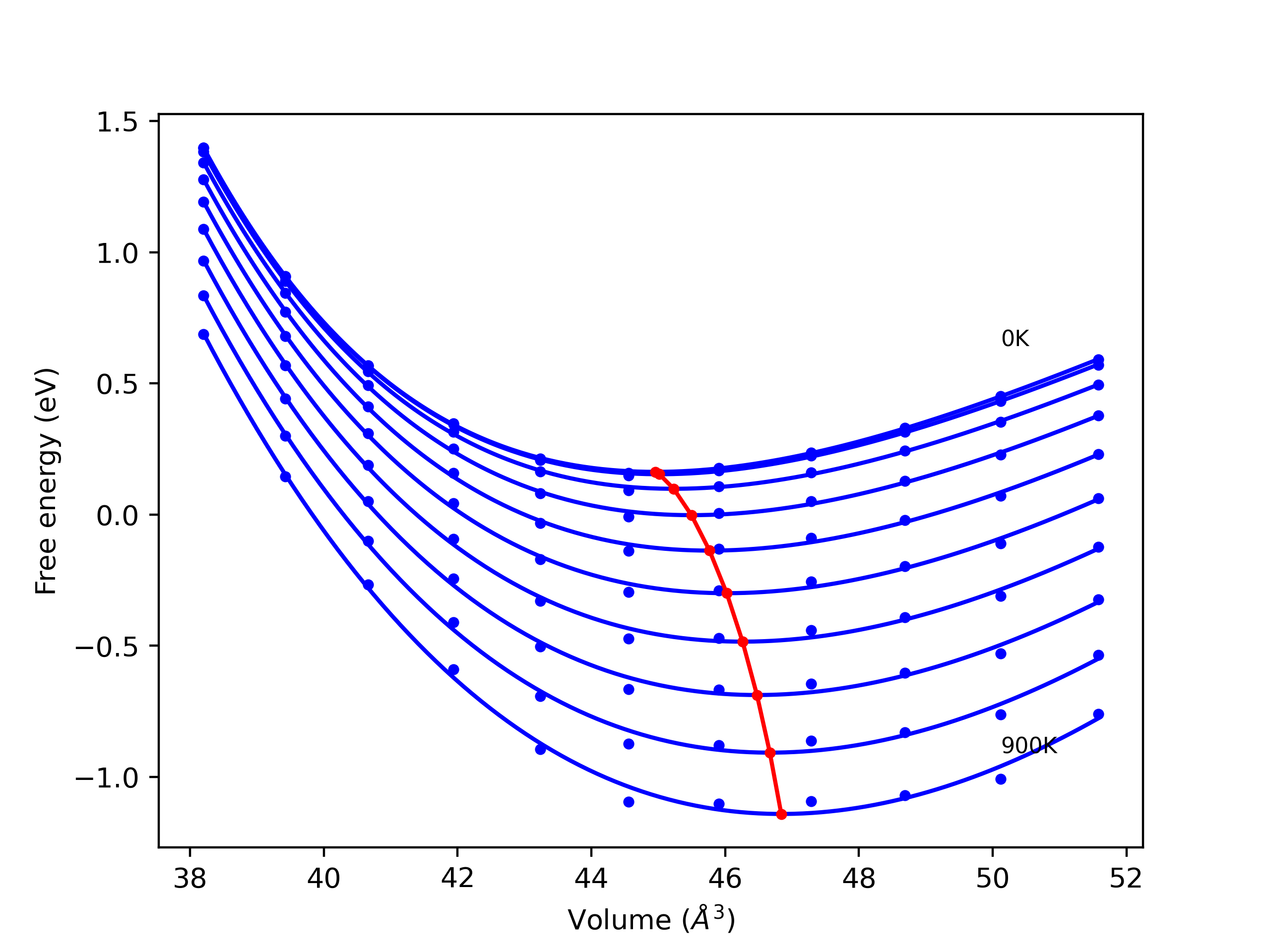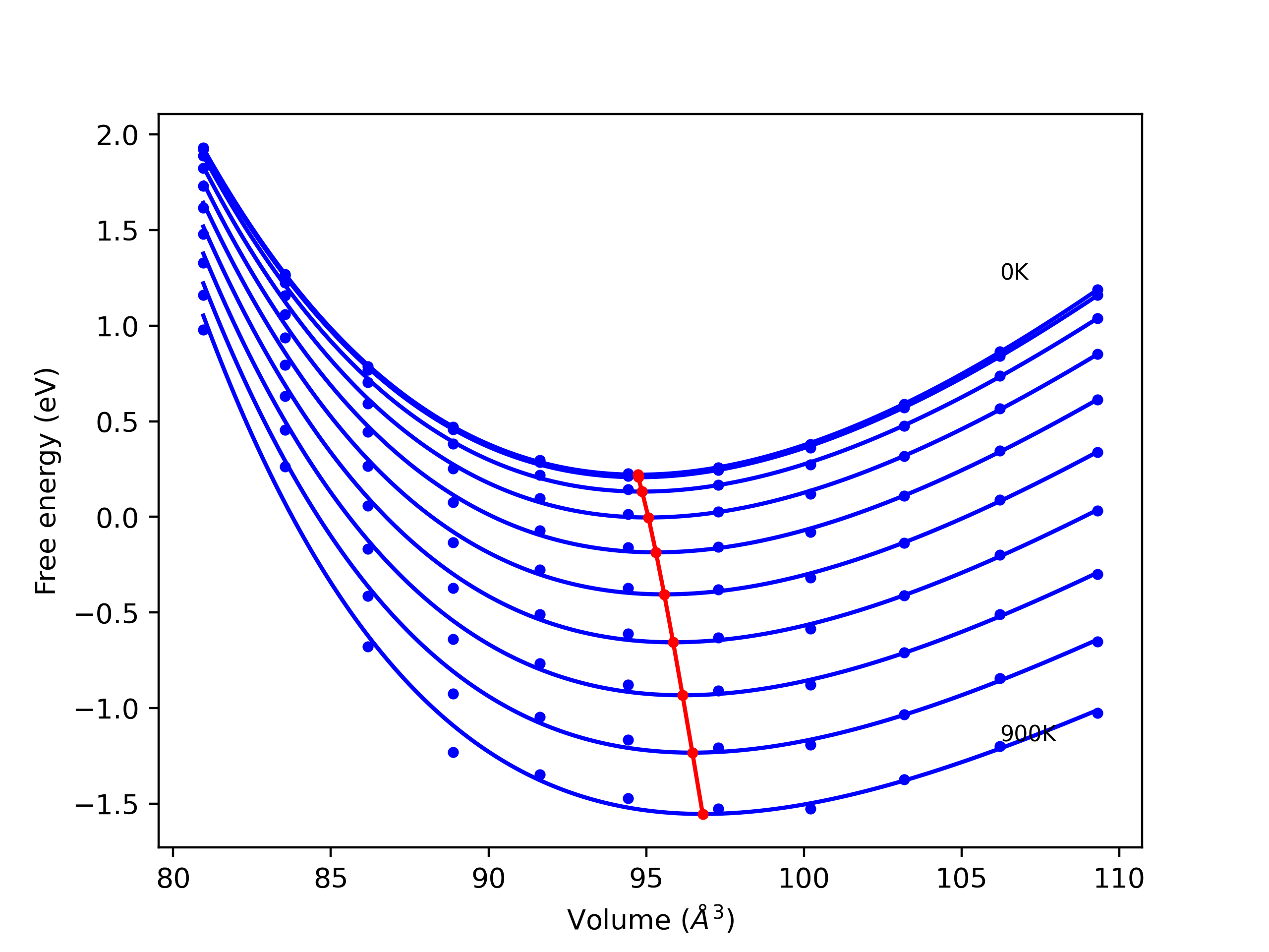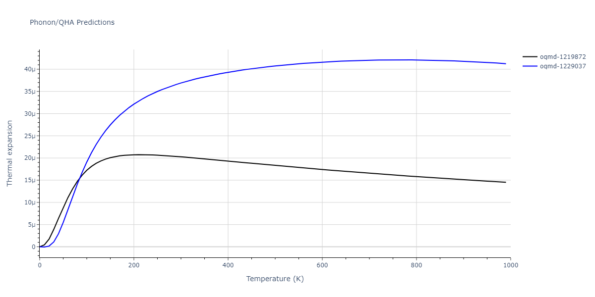 Plots of lattice and elastic constants are shown as a function of temperature. The 0K points were taken from the Crystal Structure Predictions and the Elastic Constants Predictions sections above for the unique crystal structures relaxed with the "dynamic" method. Starting from the 0 K relaxed crystal unit cells, supercell systems are created by replicating all three dimensions by the same multiplier to achieve at least 4000 atoms. The systems are then relaxed at 50 K and zero pressure using 1 million NPT steps. Lattice constants are estimated by averaging the measured box dimensions. Temperatures are iteratively increased by 50 K, with each subsequent relaxation calculation starting from the final atomic configuration at the previous temperature and relaxing for another 1 million steps.