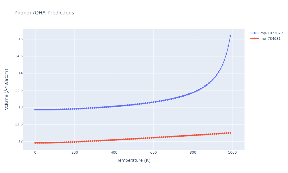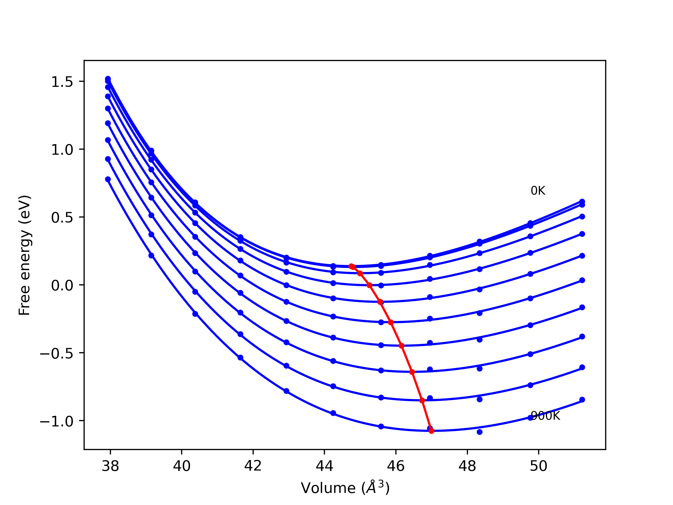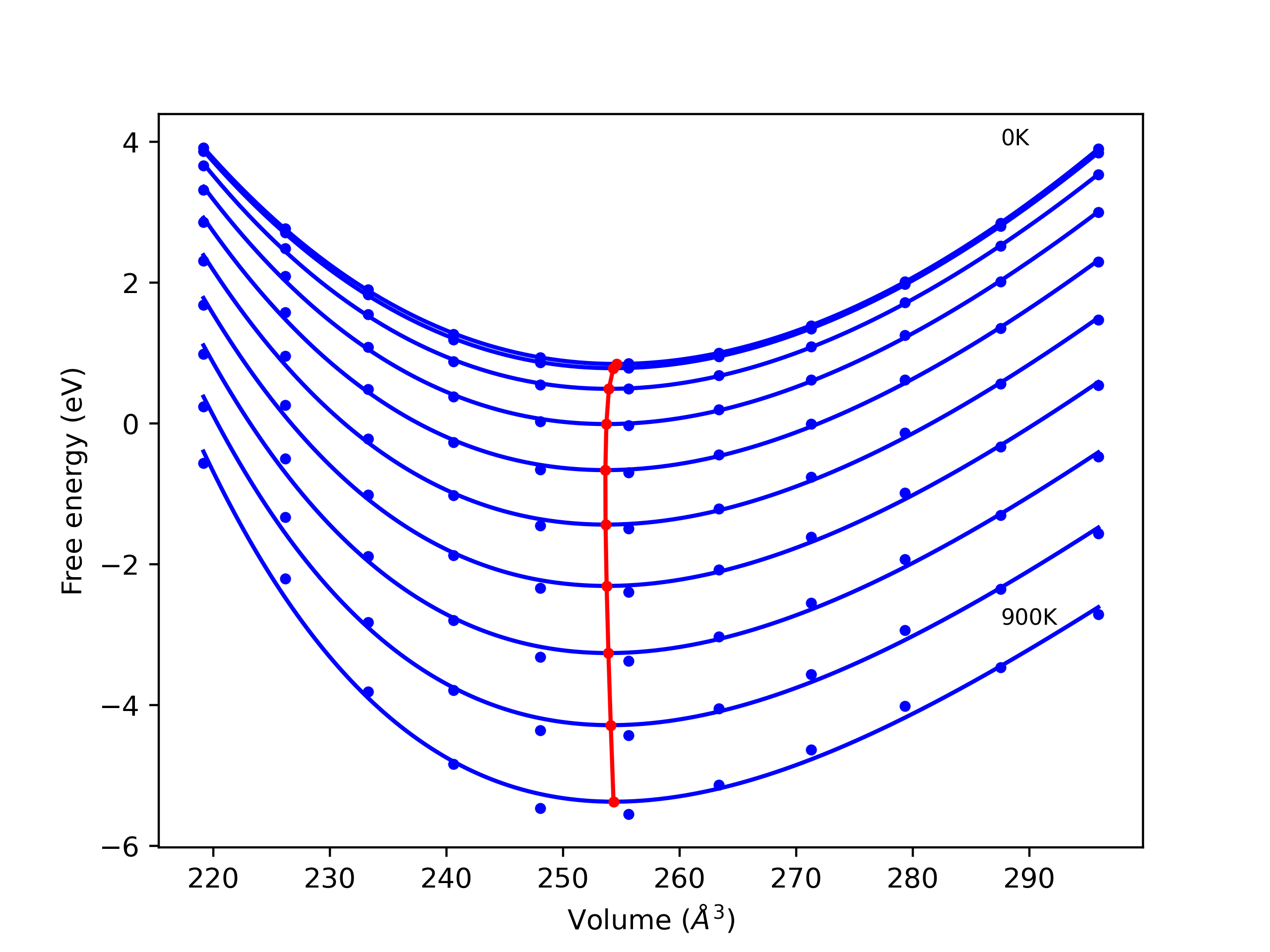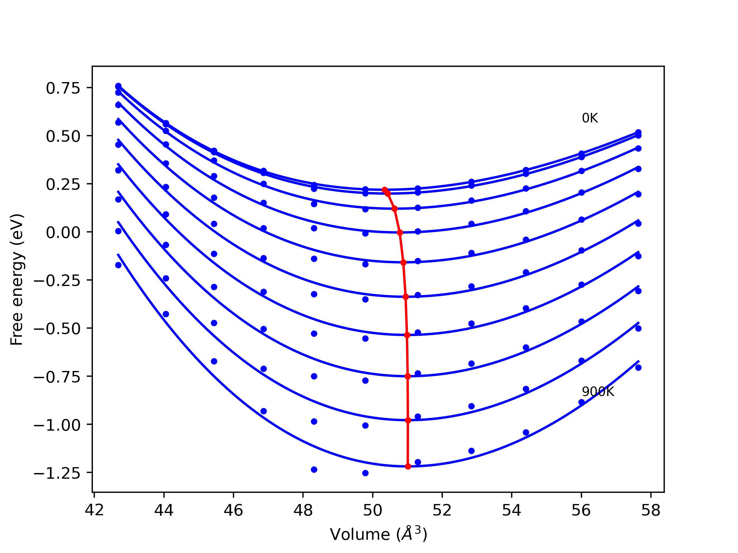 Plots of lattice and elastic constants are shown as a function of temperature. The 0K points were taken from the Crystal Structure Predictions and the Elastic Constants Predictions sections above for the unique crystal structures relaxed with the "dynamic" method. Starting from the 0 K relaxed crystal unit cells, supercell systems are created by replicating all three dimensions by the same multiplier to achieve at least 4000 atoms. The systems are then relaxed at 50 K and zero pressure using 1 million NPT steps. Lattice constants are estimated by averaging the measured box dimensions. Temperatures are iteratively increased by 50 K, with each subsequent relaxation calculation starting from the final atomic configuration at the previous temperature and relaxing for another 1 million steps.