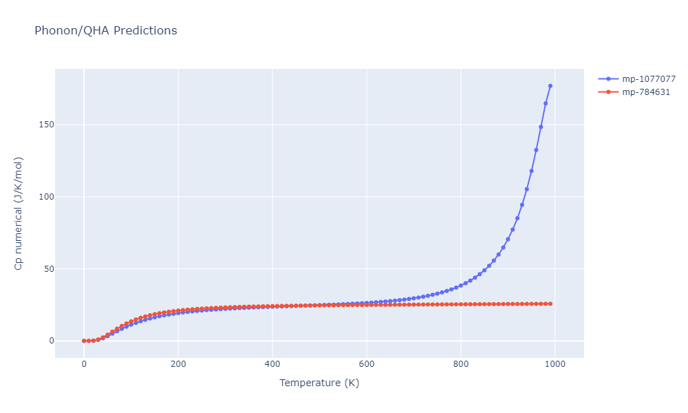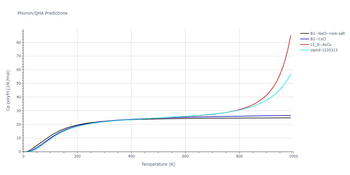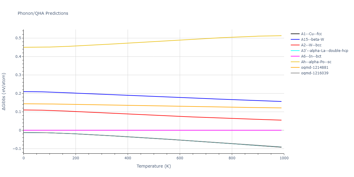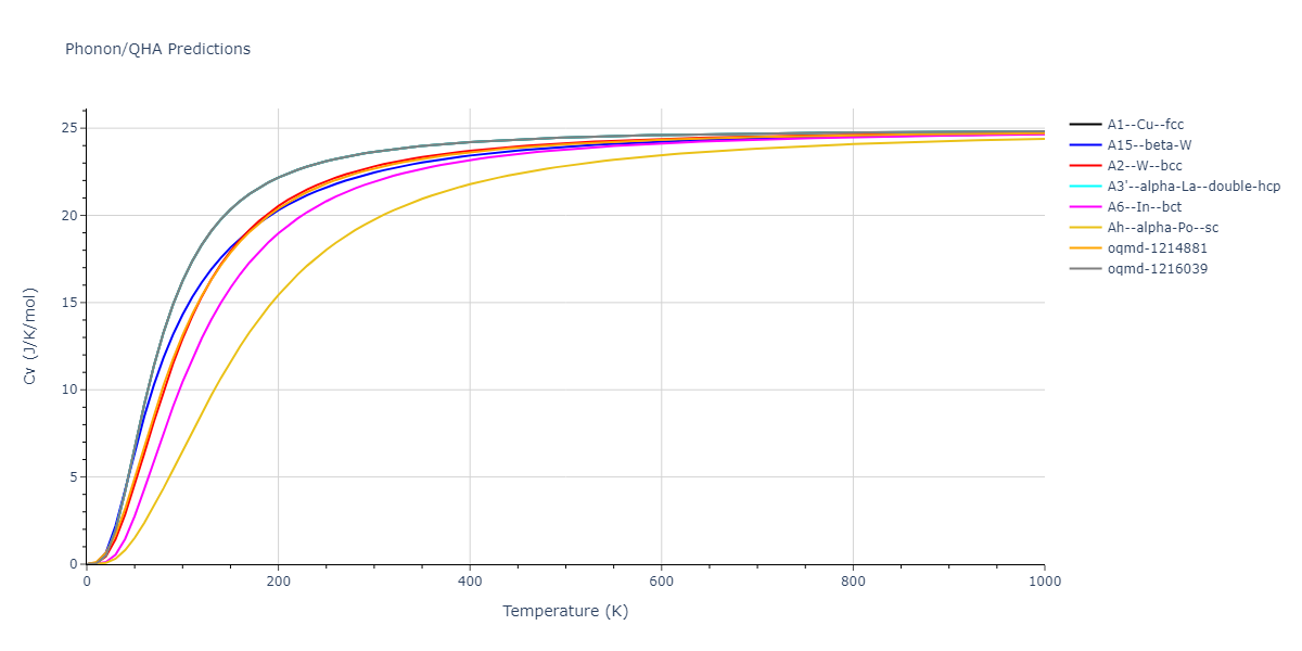 Plots of internal energy, Gibbs free energy, entropy, heat capacity and volume are shown here as a function of temperature for various crystal structures and liquid phases. The included crystal structures correspond to those in the Solid Structures vs. Temperature section, and the liquid phases to those in the Liquid Properties section. Internal energy and volume are taken from the associated structure relaxations mentioned in those previous sections. Constant pressure heat capacity is estimated using 3-point numerical derivatives of enthalpy versus temperature. Note that since all simulations done here are at 0 pressure, internal energy and enthalpy are equivalent.