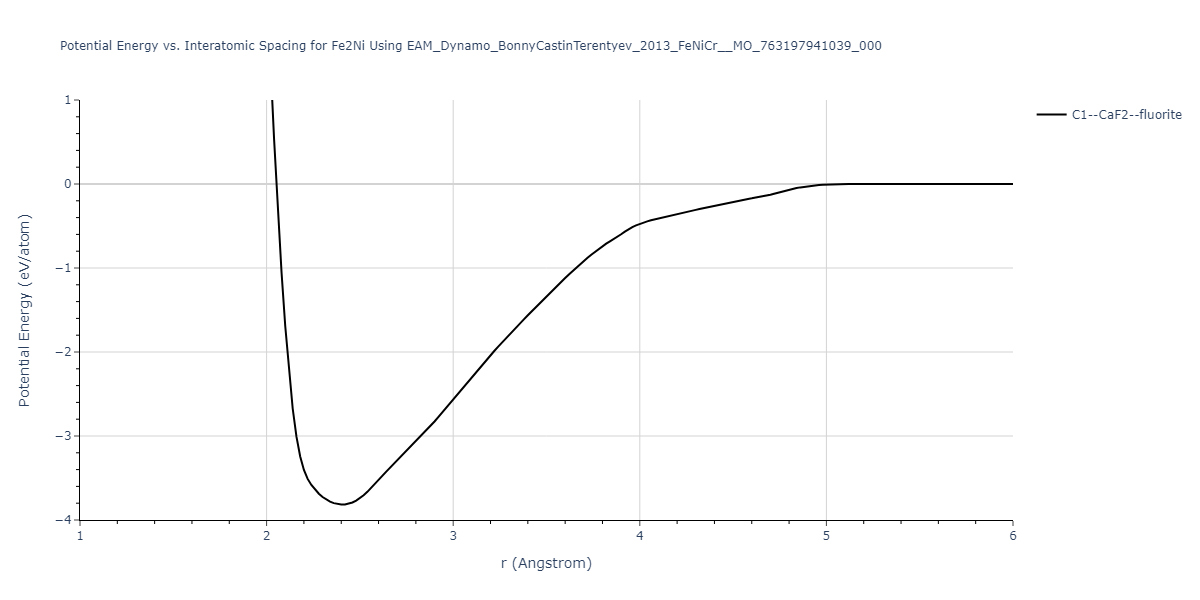 Plots of potential energy vs interatomic spacing, r, are shown below for a number of crystal structures. The structures are generated based on the ideal atomic positions and b/a and c/a lattice parameter ratios for a given crystal prototype. The size of the system is then uniformly scaled, and the energy calculated without relaxing the system. To obtain these plots, values of r are evaluated every 0.02 Å up to 6 Å.