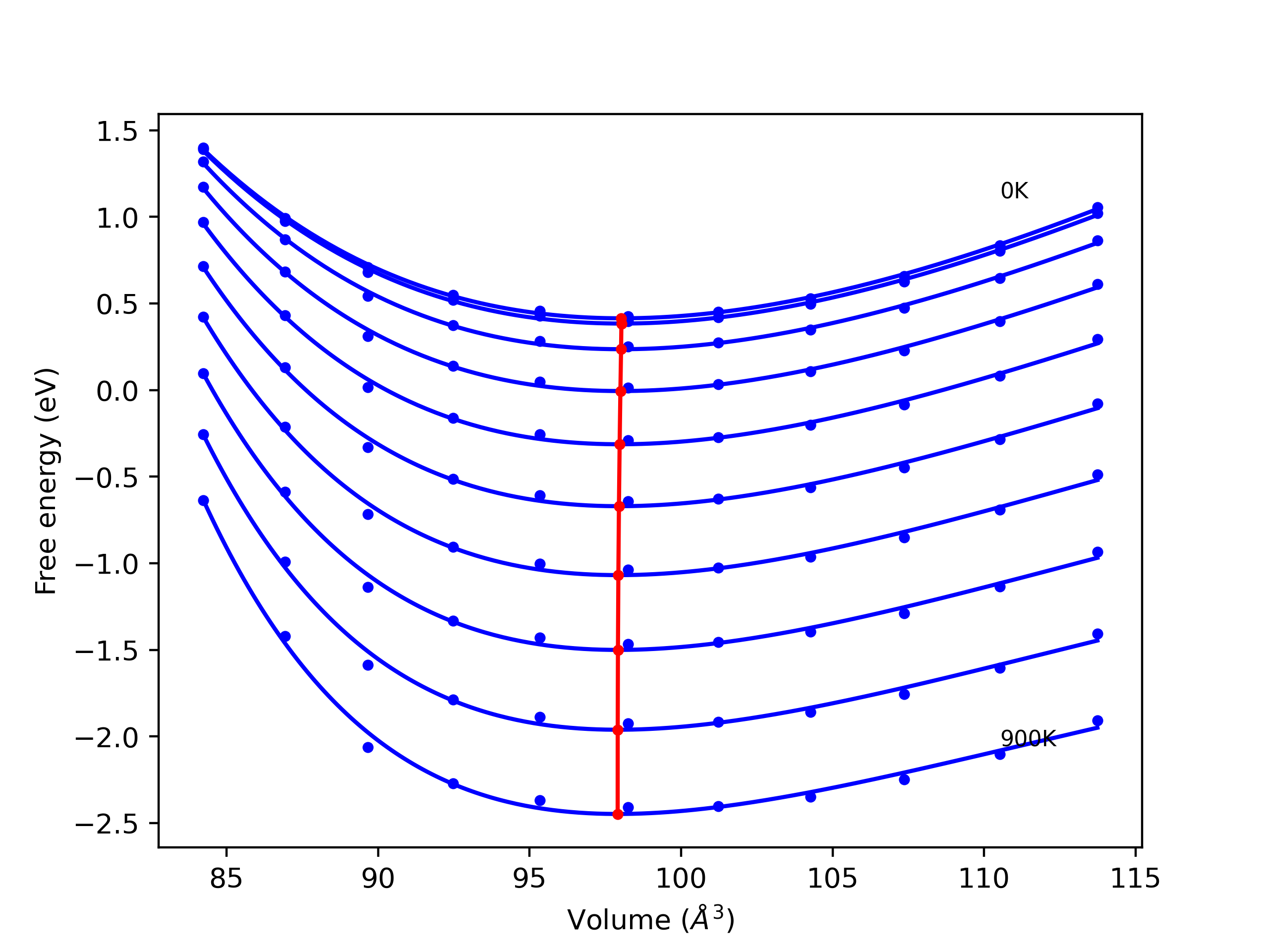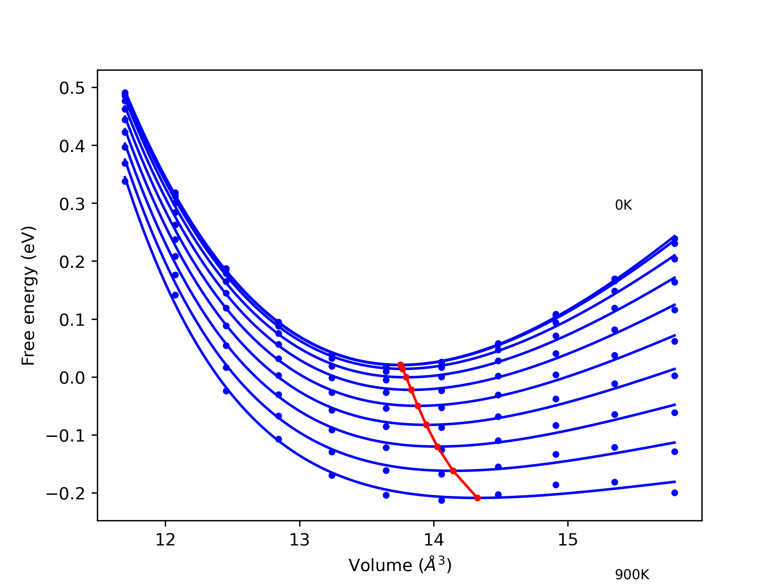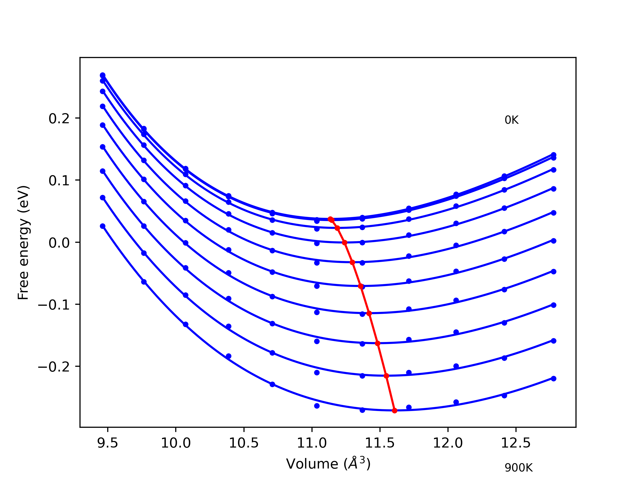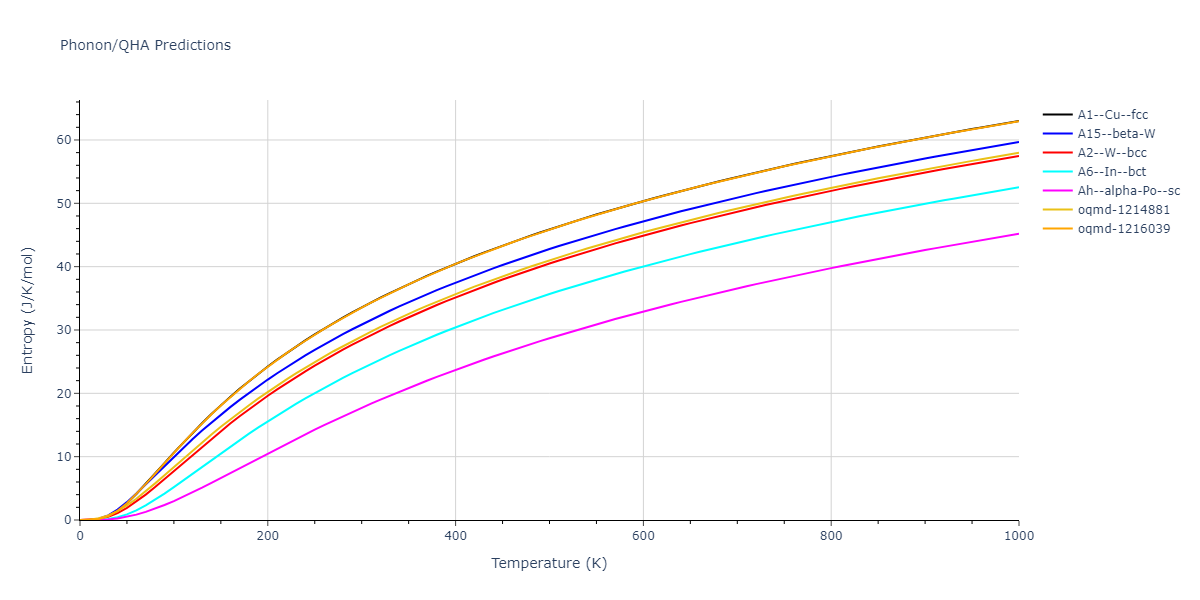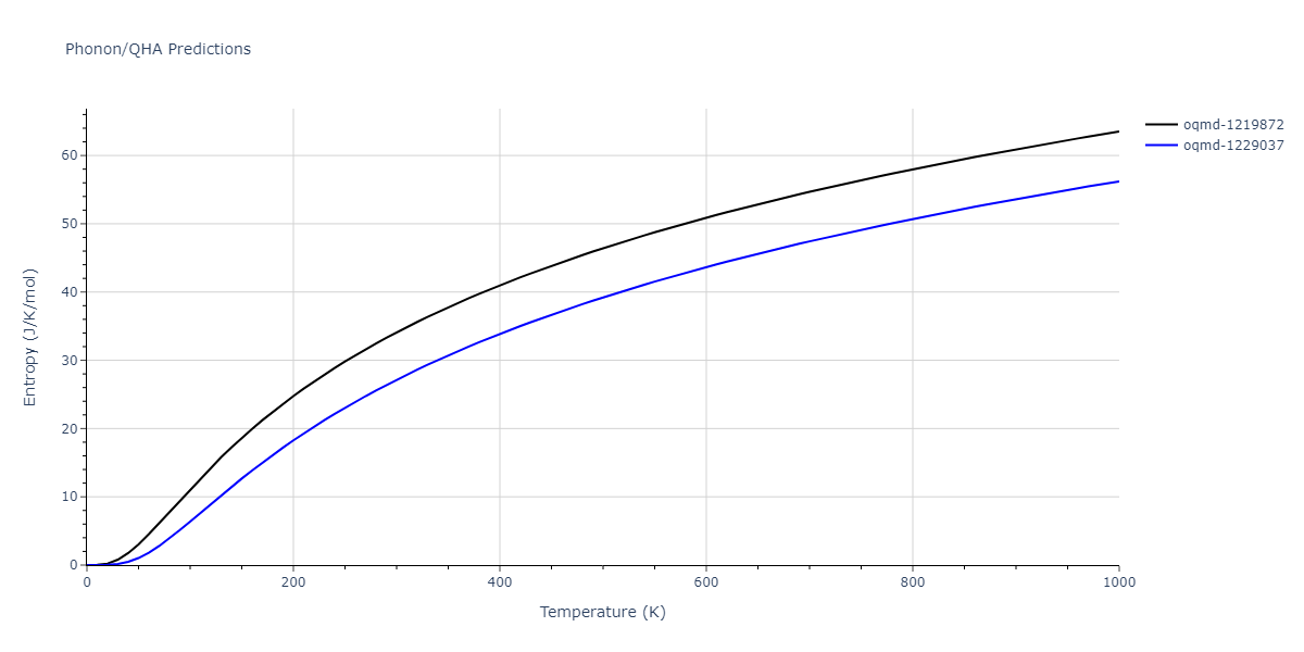 The Gibbs energies of the phases are estimated using thermodynamic integration between the interatomic potential in question and a simpler model with known Gibbs free energy values. For solids, the reference model is an Einstein solid, while for liquids it is the Uhlenbeck-Ford potential. Besides a short run at the start of the solid calculations to estimate Einstein model spring constants, the two calculations proceed similarly. Starting with the final relaxation configurations, the systems are stabilized for 25,000 steps. Then, over the next 50,000 steps the potential is swapped out for the reference potential. The system is then stabilized for another 25,000 steps with the reference model before a reverse swap of 50,000 steps is performed. The simulation ends with one final 25,000 step stabilization period. From the simulation, the irreversible work of transformation is estimated and used to compute the absolute Gibbs free energy of the target phase and potential relative to the reference potential. Entropy is estimated as the difference in enthalpy and Gibbs free energy and divided by temperature.