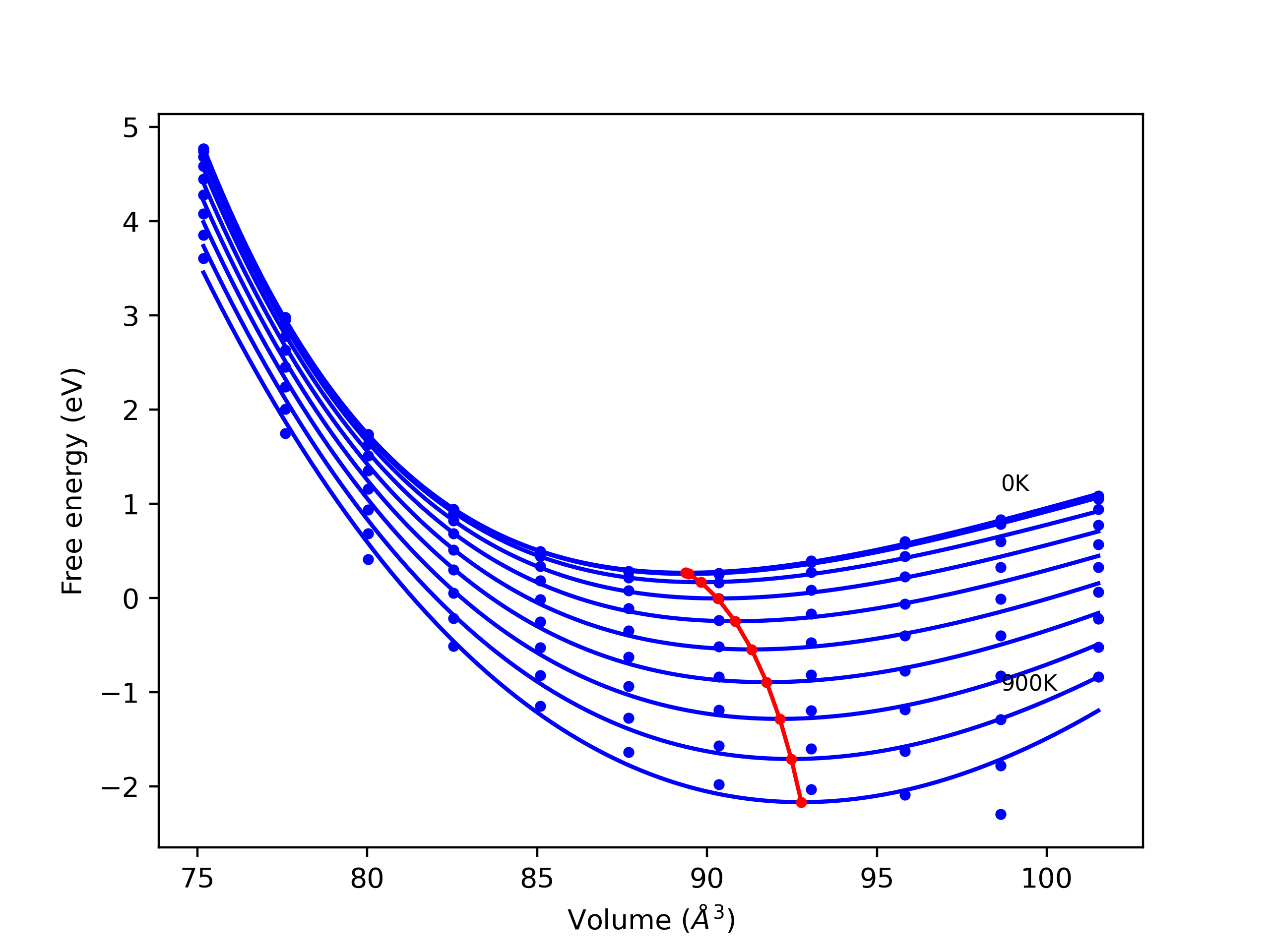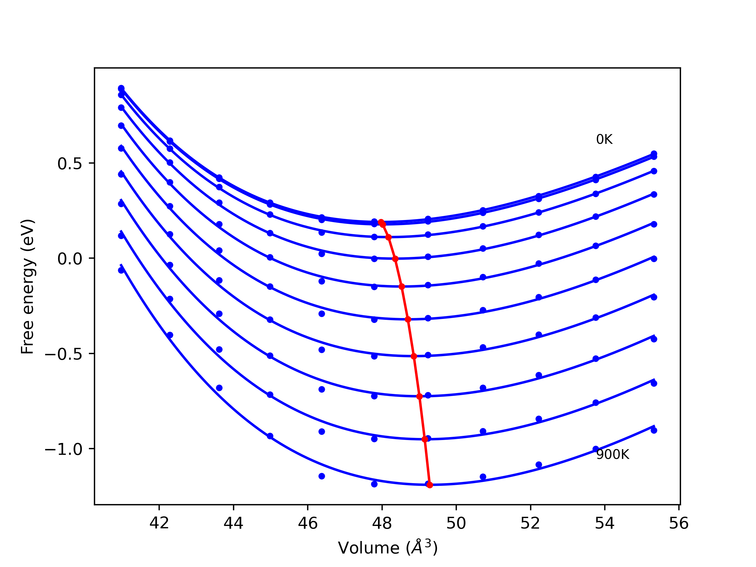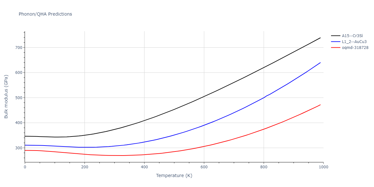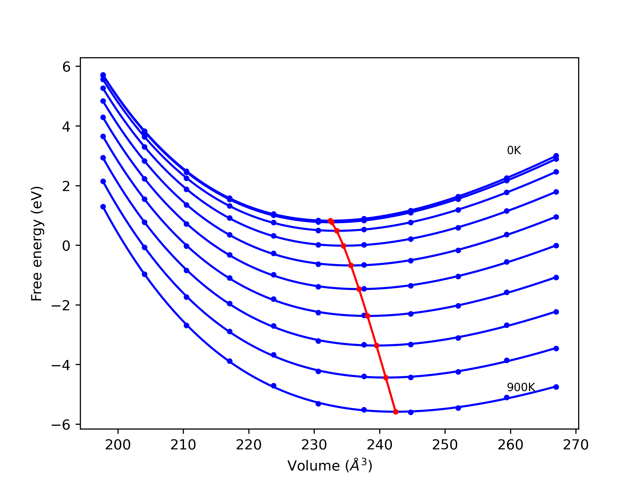 Plots of lattice and elastic constants are shown as a function of temperature. The 0K points were taken from the Crystal Structure Predictions and the Elastic Constants Predictions sections above for the unique crystal structures relaxed with the "dynamic" method. Starting from the 0 K relaxed crystal unit cells, supercell systems are created by replicating all three dimensions by the same multiplier to achieve at least 4000 atoms. The systems are then relaxed at 50 K and zero pressure using 1 million NPT steps. Lattice constants are estimated by averaging the measured box dimensions. Temperatures are iteratively increased by 50 K, with each subsequent relaxation calculation starting from the final atomic configuration at the previous temperature and relaxing for another 1 million steps.