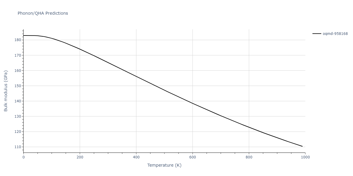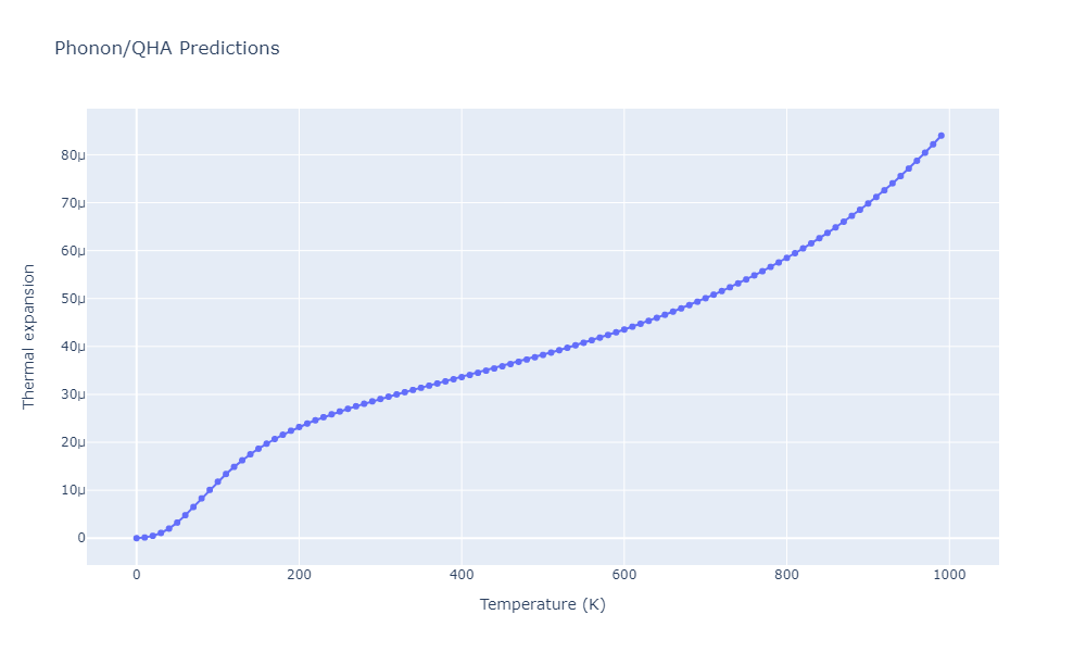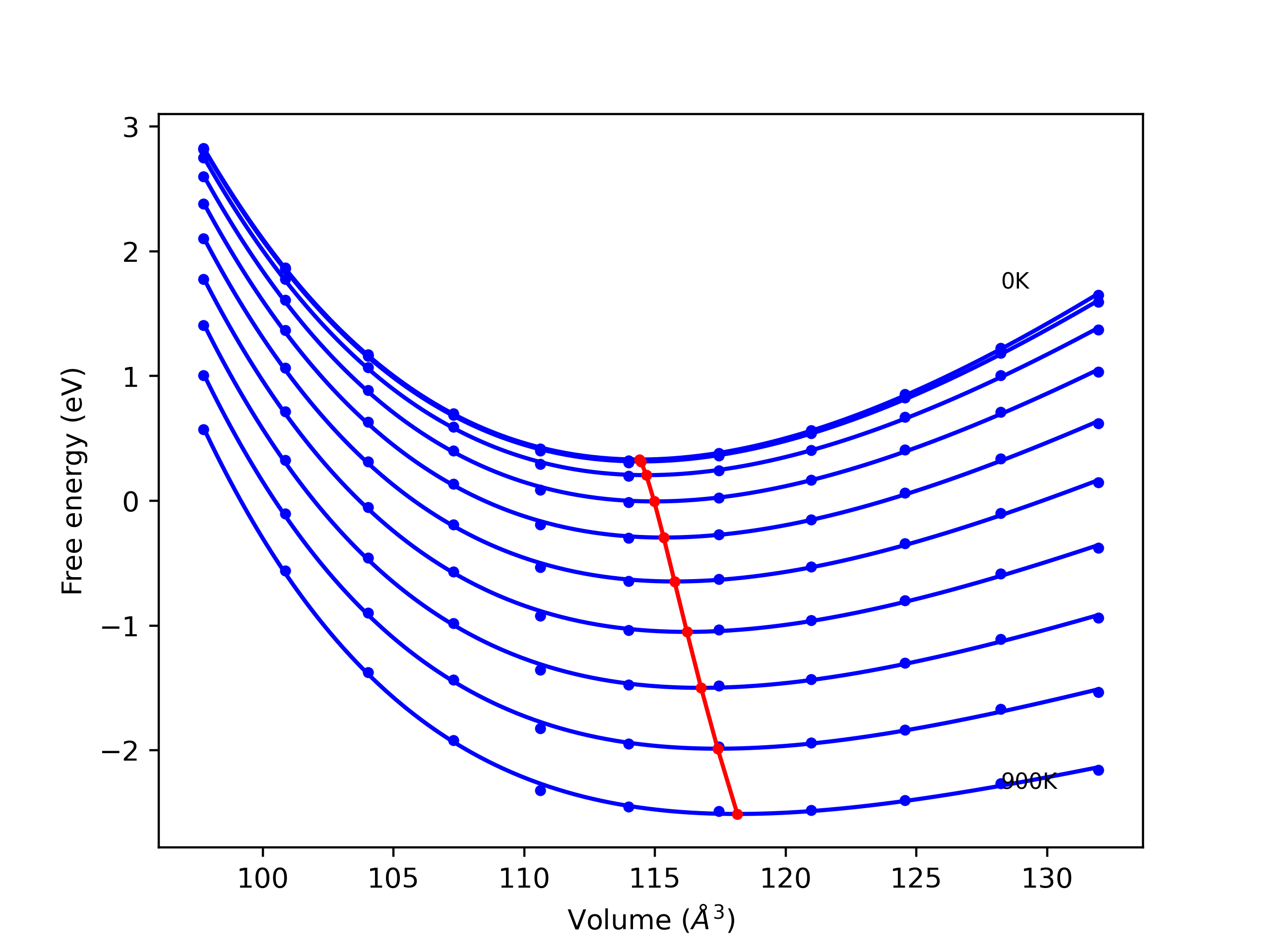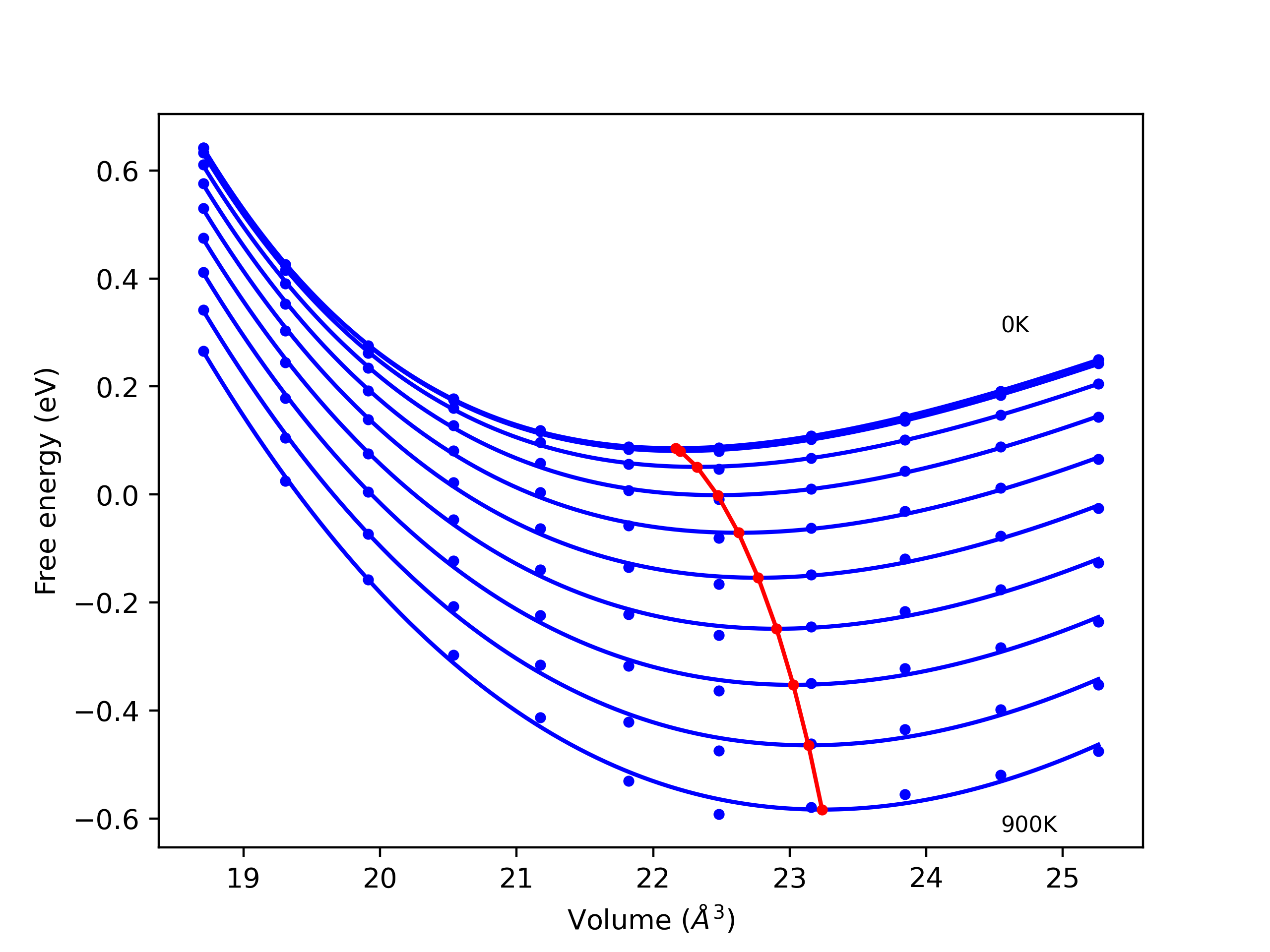Plots of lattice and elastic constants are shown as a function of temperature. The 0K points were taken from the Crystal Structure Predictions and the Elastic Constants Predictions sections above for the unique crystal structures relaxed with the "dynamic" method. Starting from the 0 K relaxed crystal unit cells, supercell systems are created by replicating all three dimensions by the same multiplier to achieve at least 4000 atoms. The systems are then relaxed at 50 K and zero pressure using 1 million NPT steps. Lattice constants are estimated by averaging the measured box dimensions. Temperatures are iteratively increased by 50 K, with each subsequent relaxation calculation starting from the final atomic configuration at the previous temperature and relaxing for another 1 million steps.