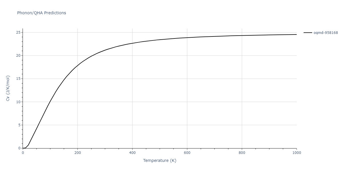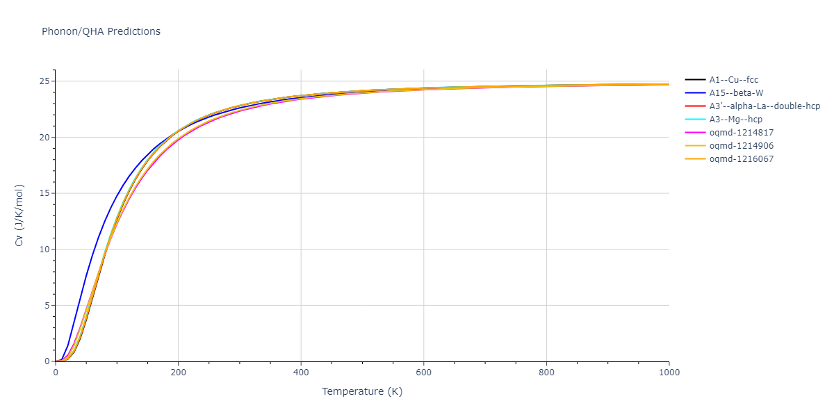 Plots of internal energy, Gibbs free energy, entropy, heat capacity and volume are shown here as a function of temperature for various crystal structures and liquid phases. The included crystal structures correspond to those in the Solid Structures vs. Temperature section, and the liquid phases to those in the Liquid Properties section. Internal energy and volume are taken from the associated structure relaxations mentioned in those previous sections. Constant pressure heat capacity is estimated using 3-point numerical derivatives of enthalpy versus temperature. Note that since all simulations done here are at 0 pressure, internal energy and enthalpy are equivalent.