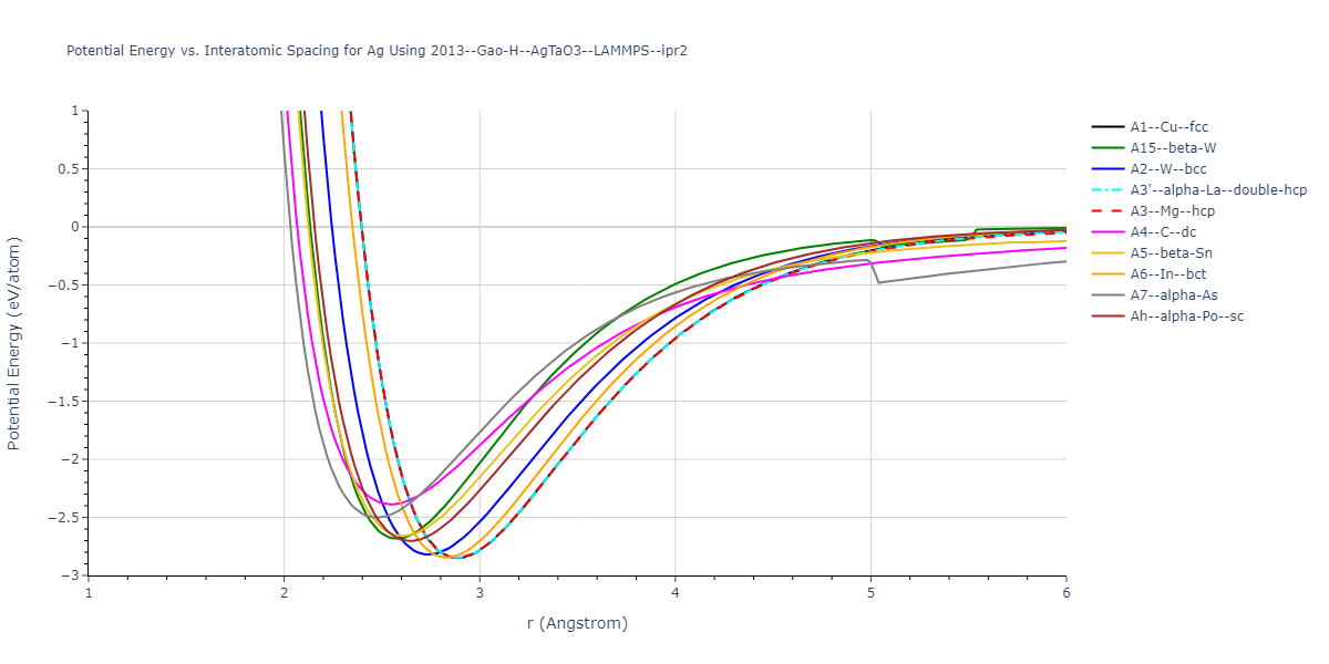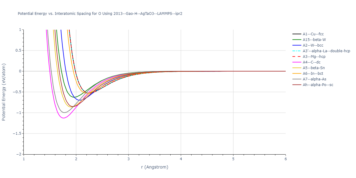 Plots of potential energy vs interatomic spacing, r, are shown below for a number of crystal structures. The structures are generated based on the ideal atomic positions and b/a and c/a lattice parameter ratios for a given crystal prototype. The size of the system is then uniformly scaled, and the energy calculated without relaxing the system. To obtain these plots, values of r are evaluated every 0.02 Å up to 6 Å.