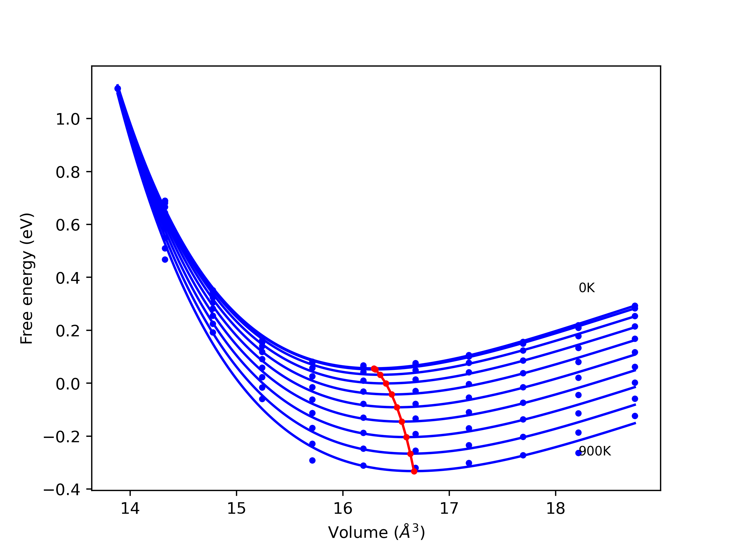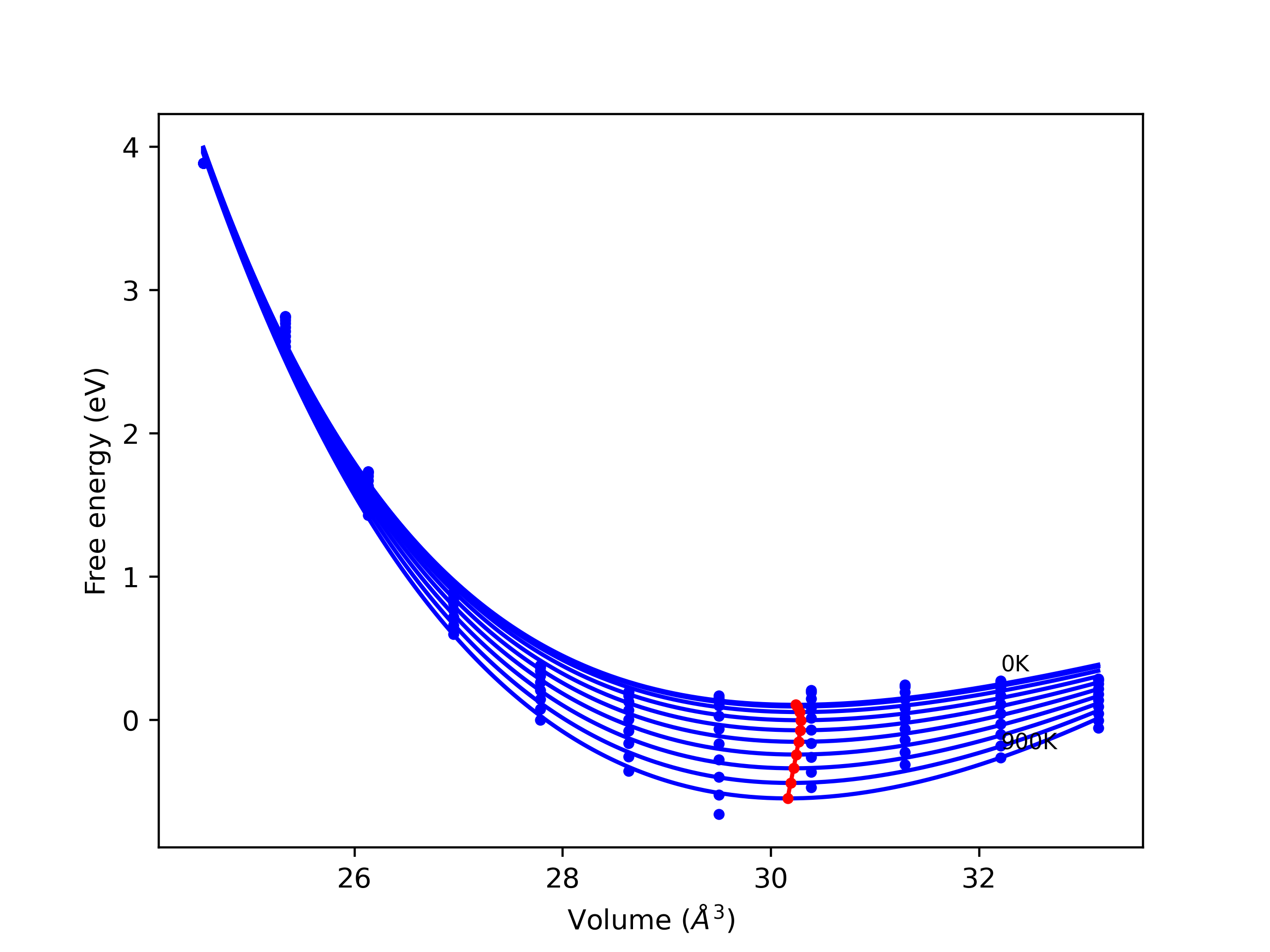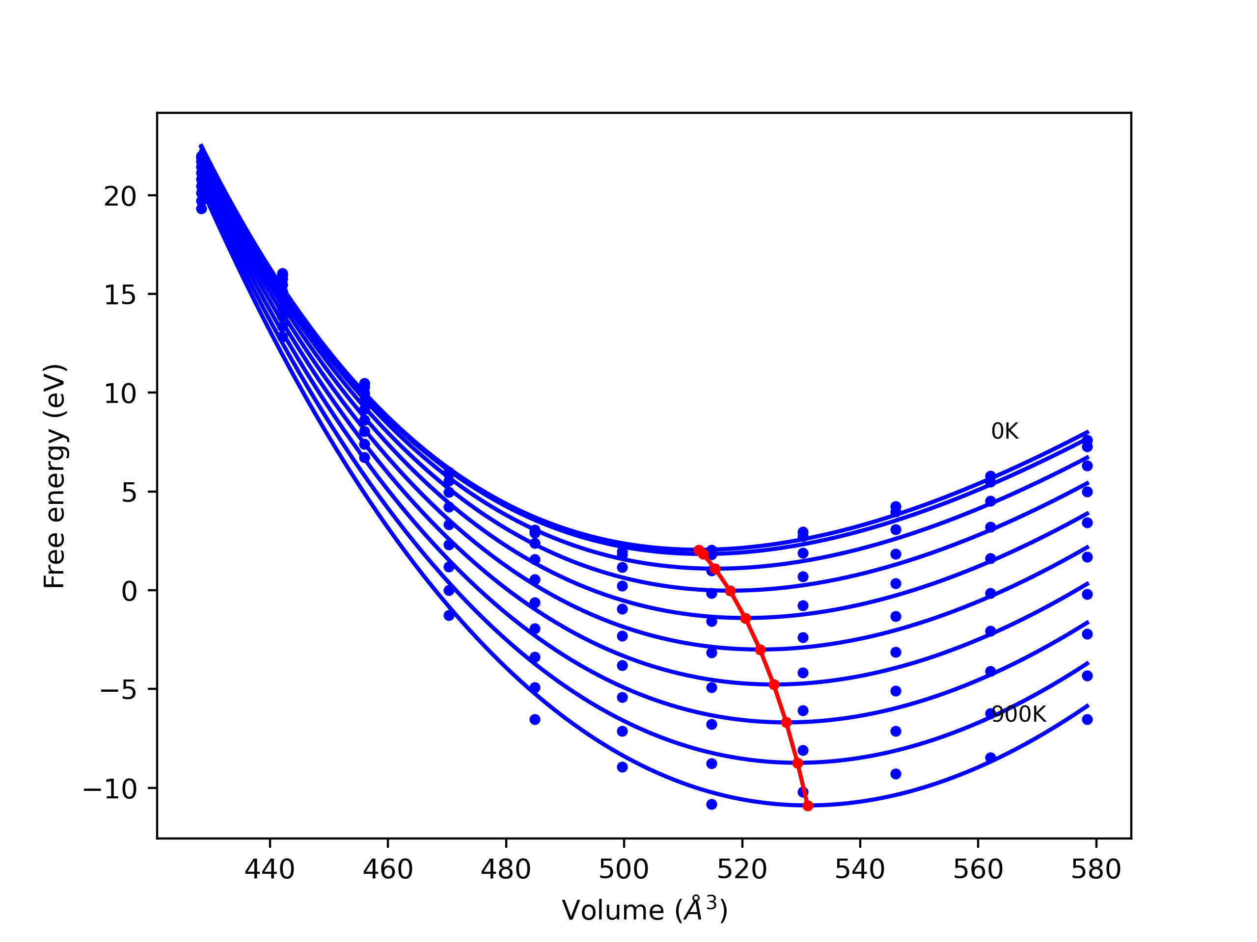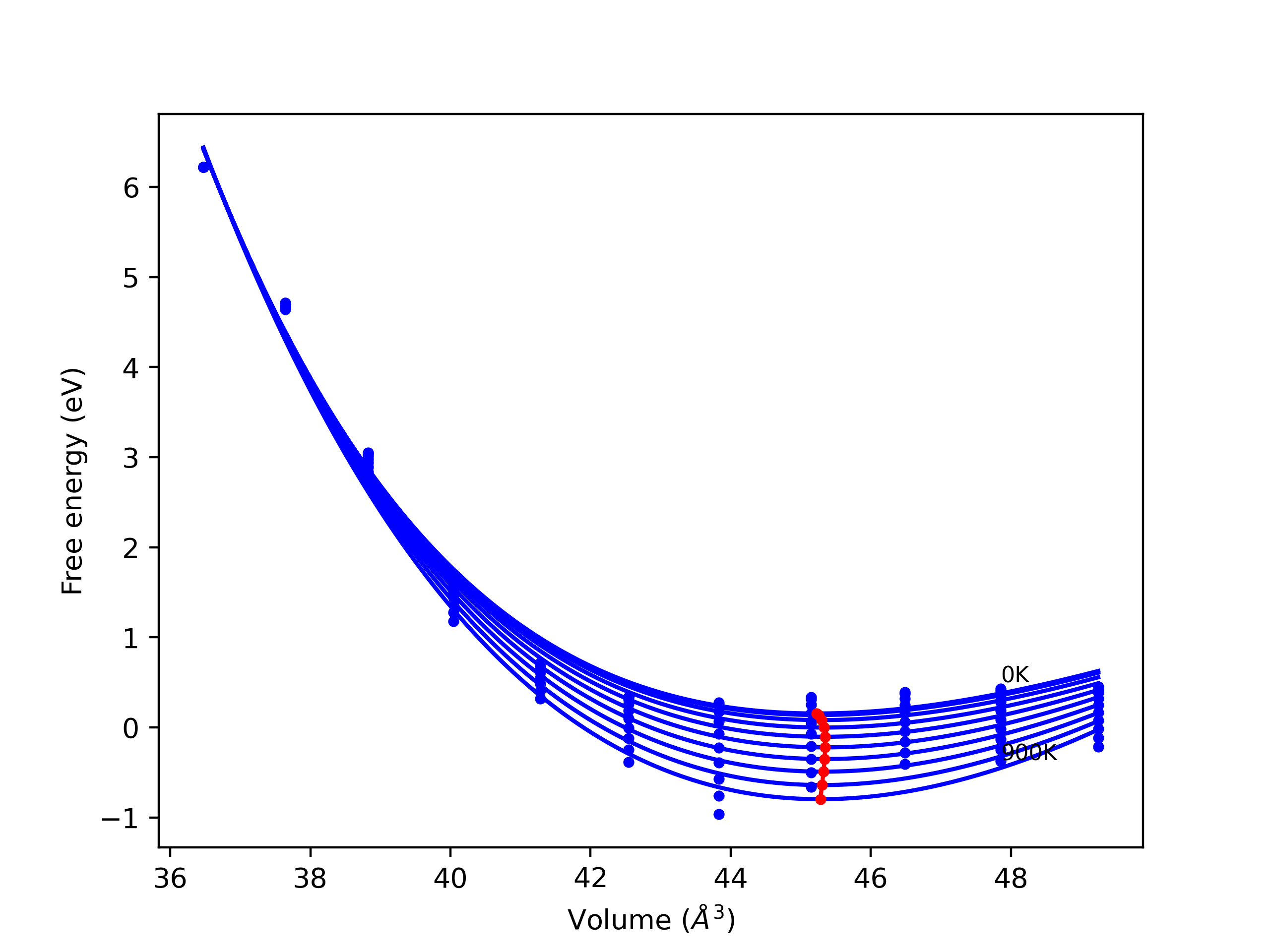 The Gibbs energies of the phases are estimated using thermodynamic integration between the interatomic potential in question and a simpler model with known Gibbs free energy values. For solids, the reference model is an Einstein solid, while for liquids it is the Uhlenbeck-Ford potential. Besides a short run at the start of the solid calculations to estimate Einstein model spring constants, the two calculations proceed similarly. Starting with the final relaxation configurations, the systems are stabilized for 25,000 steps. Then, over the next 50,000 steps the potential is swapped out for the reference potential. The system is then stabilized for another 25,000 steps with the reference model before a reverse swap of 50,000 steps is performed. The simulation ends with one final 25,000 step stabilization period. From the simulation, the irreversible work of transformation is estimated and used to compute the absolute Gibbs free energy of the target phase and potential relative to the reference potential. Entropy is estimated as the difference in enthalpy and Gibbs free energy and divided by temperature.