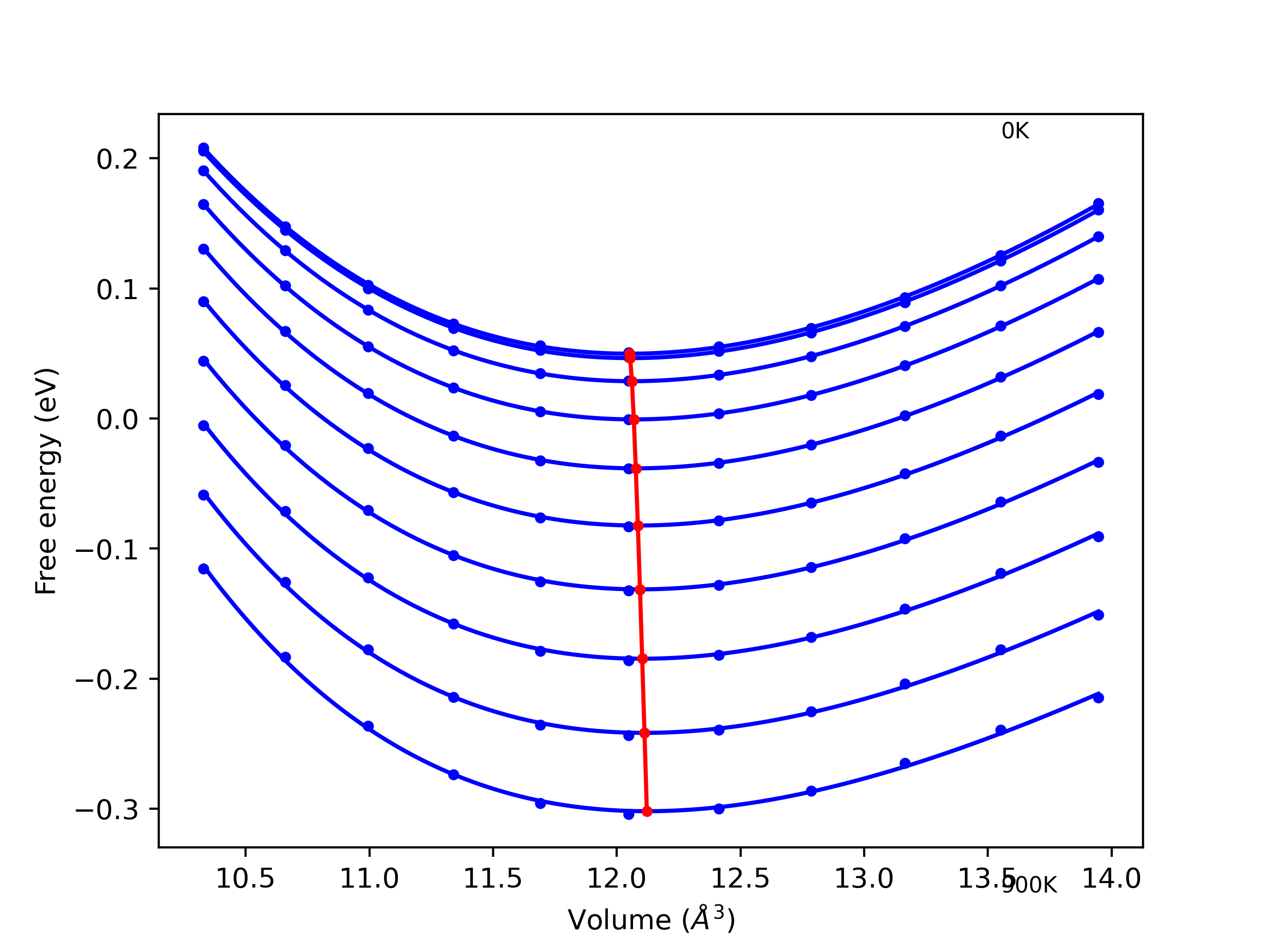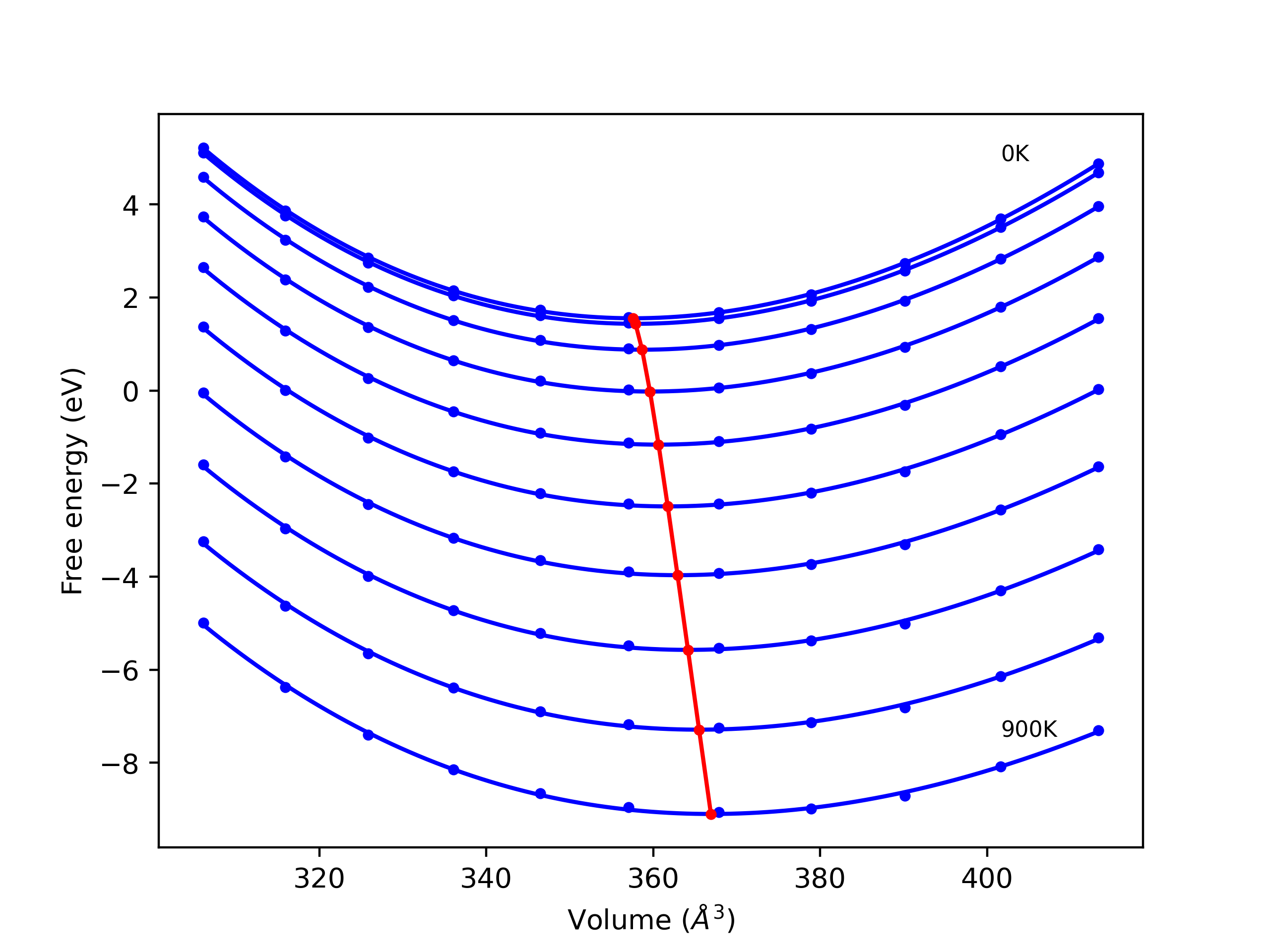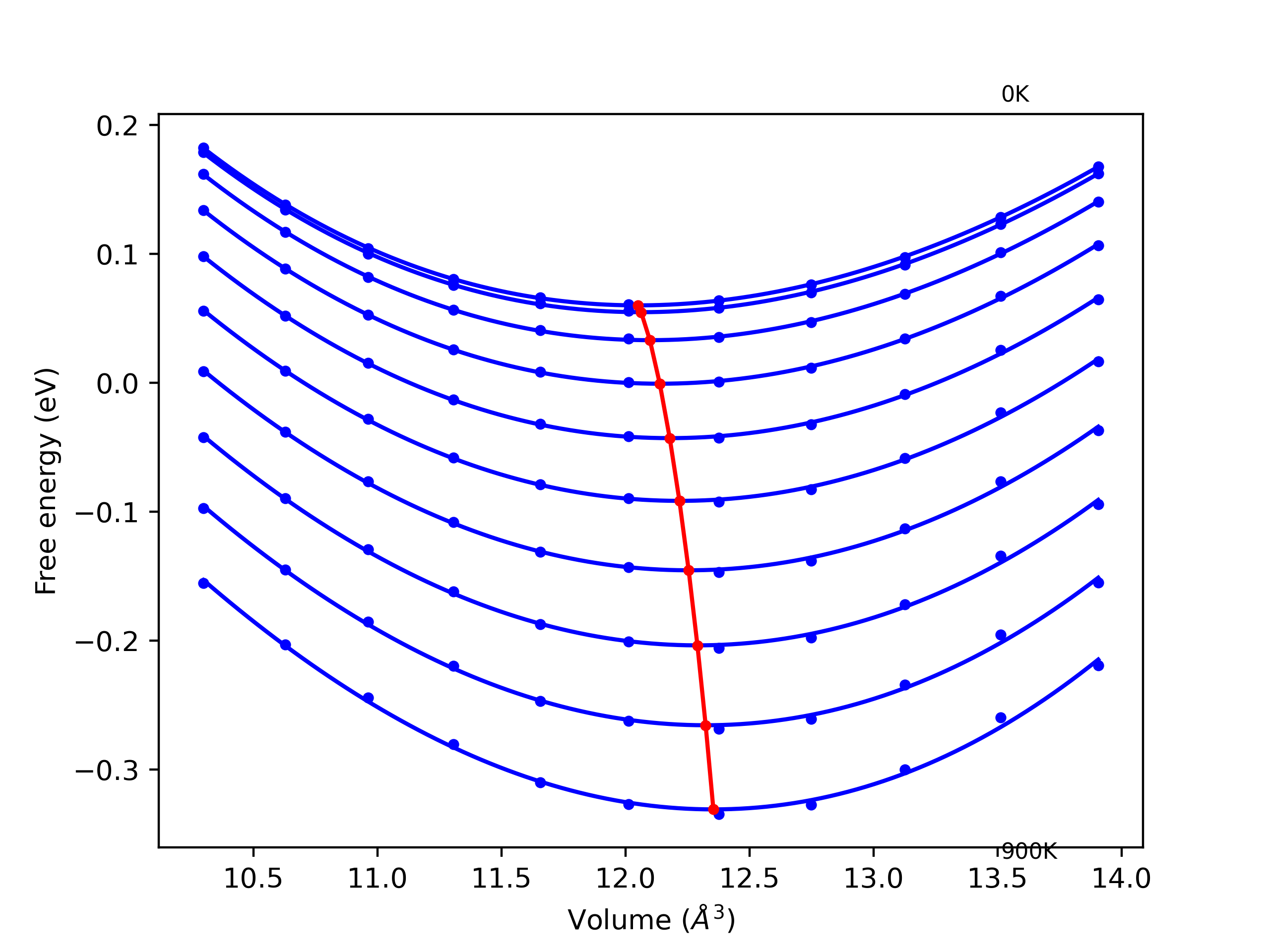 Phonon band structures and crystal properties estimated from quasi-harmonic approximation (QHA) calculations are displayed for select crystals. The calculations were performed using phonopy and LAMMPS. For the phonon calculations, 3x3 supercells of the potential-specific relaxed crystals were used. The QHA calculations were based on 11 strain states ranging from -0.05 to 0.05.