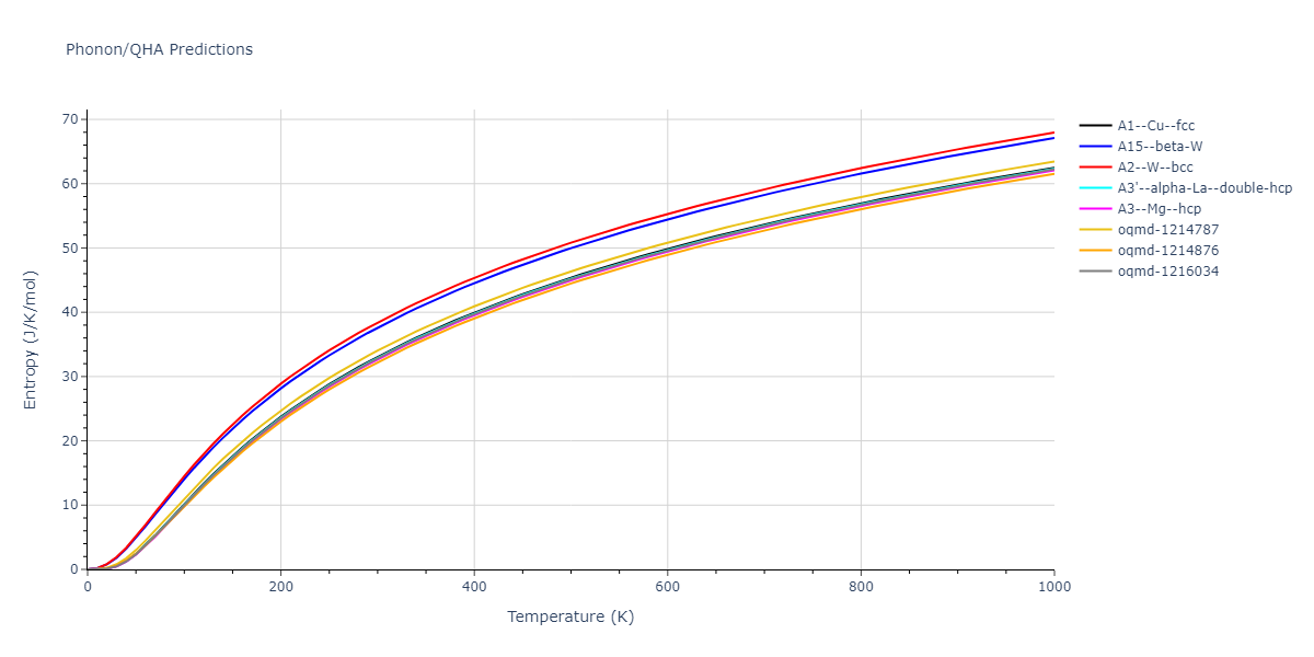 The Gibbs energies of the phases are estimated using thermodynamic integration between the interatomic potential in question and a simpler model with known Gibbs free energy values. For solids, the reference model is an Einstein solid, while for liquids it is the Uhlenbeck-Ford potential. Besides a short run at the start of the solid calculations to estimate Einstein model spring constants, the two calculations proceed similarly. Starting with the final relaxation configurations, the systems are stabilized for 25,000 steps. Then, over the next 50,000 steps the potential is swapped out for the reference potential. The system is then stabilized for another 25,000 steps with the reference model before a reverse swap of 50,000 steps is performed. The simulation ends with one final 25,000 step stabilization period. From the simulation, the irreversible work of transformation is estimated and used to compute the absolute Gibbs free energy of the target phase and potential relative to the reference potential. Entropy is estimated as the difference in enthalpy and Gibbs free energy and divided by temperature.