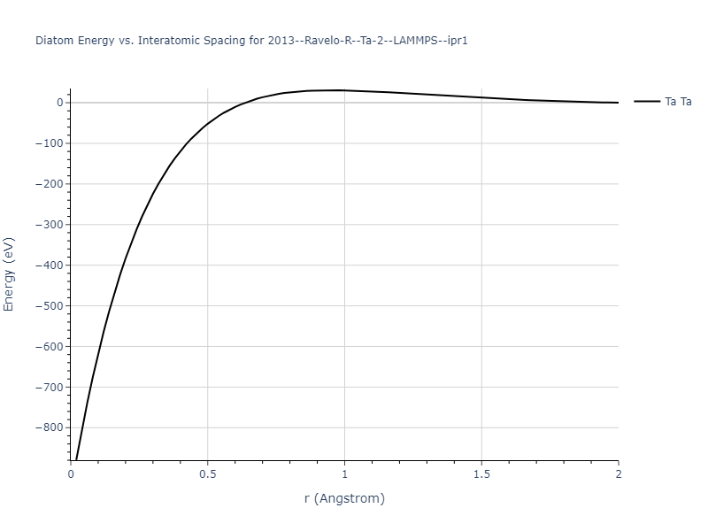 Plots of the potential energy vs interatomic spacing, r, are shown below for all diatom sets associated with the interatomic potential. This calculation provides insights into the functional form of the potential's two-body interactions. A system consisting of only two atoms is created, and the potential energy is evaluated for the atoms separated by 0.02 Å <= r <= 6.0> Å in intervals of 0.02 Å. Two plots are shown: one for the "standard" interaction distance range, and one for small values of r. The small r plot is useful for determining whether the potential is suitable for radiation studies.
