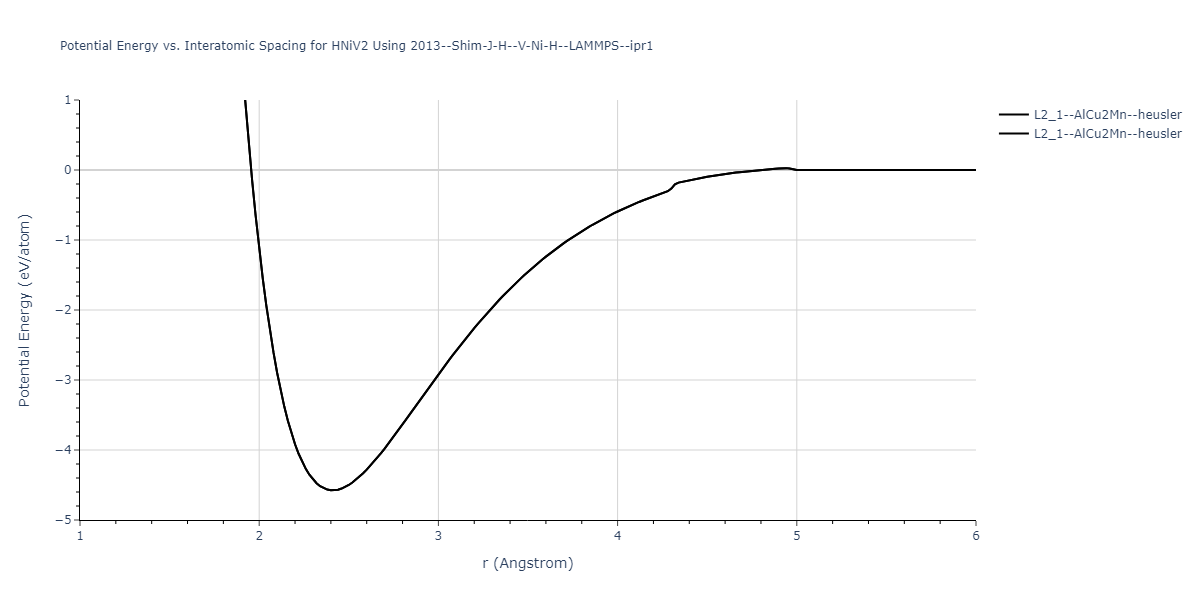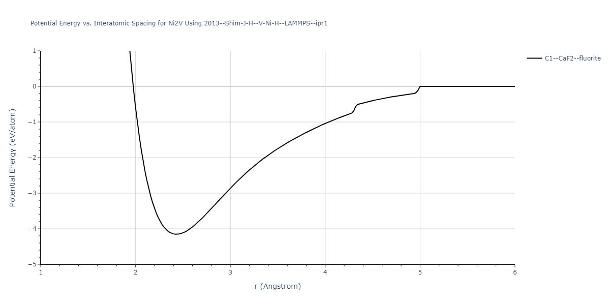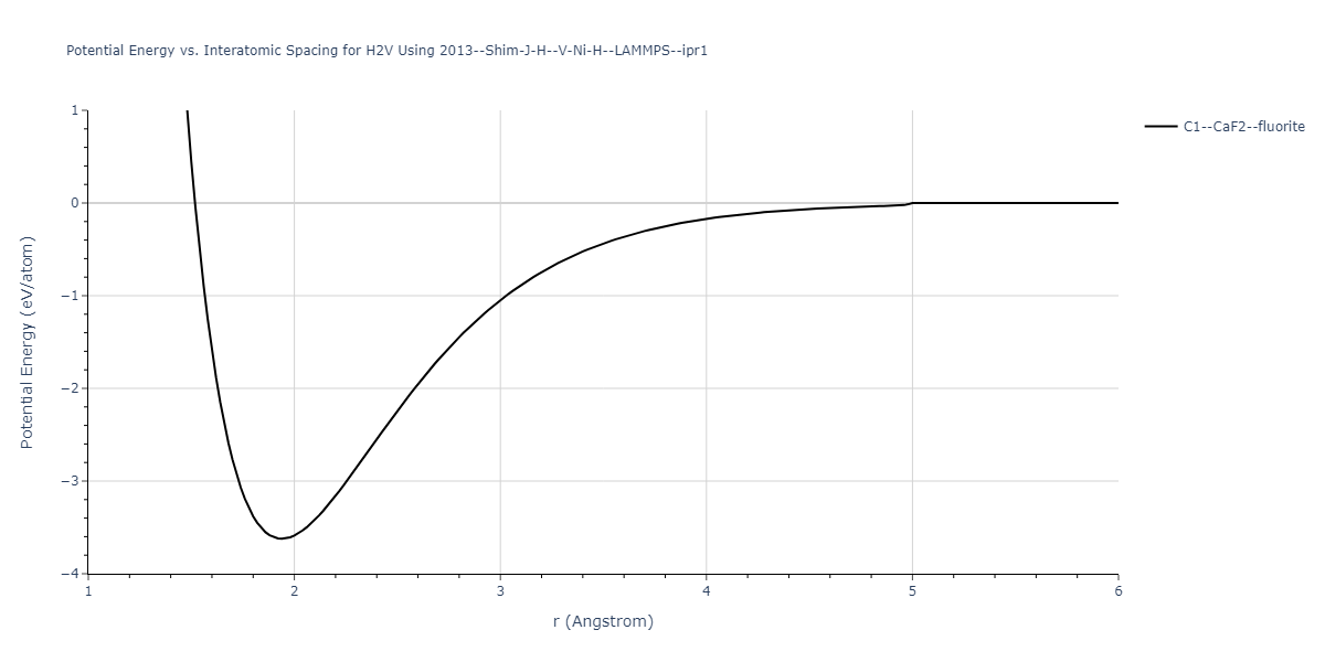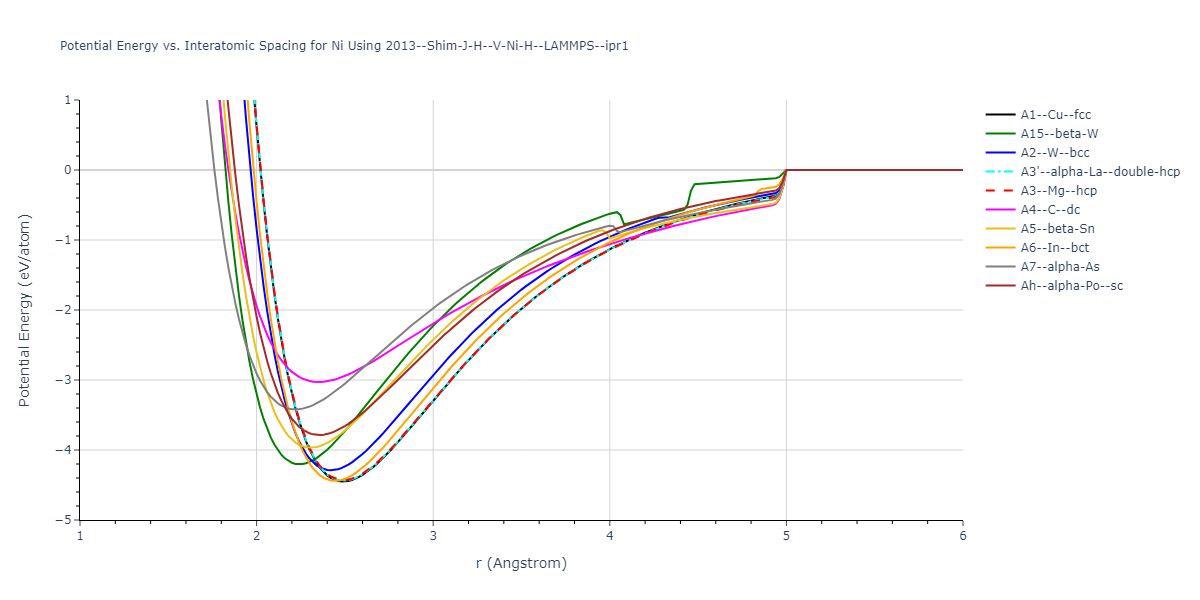 Plots of potential energy vs interatomic spacing, r, are shown below for a number of crystal structures. The structures are generated based on the ideal atomic positions and b/a and c/a lattice parameter ratios for a given crystal prototype. The size of the system is then uniformly scaled, and the energy calculated without relaxing the system. To obtain these plots, values of r are evaluated every 0.02 Å up to 6 Å.