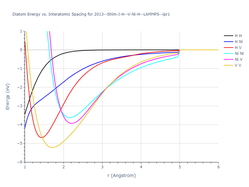Plots of the potential energy vs interatomic spacing, r, are shown below for all diatom sets associated with the interatomic potential. This calculation provides insights into the functional form of the potential's two-body interactions. A system consisting of only two atoms is created, and the potential energy is evaluated for the atoms separated by 0.02 Å <= r <= 6.0> Å in intervals of 0.02 Å. Two plots are shown: one for the "standard" interaction distance range, and one for small values of r. The small r plot is useful for determining whether the potential is suitable for radiation studies.