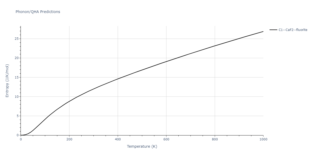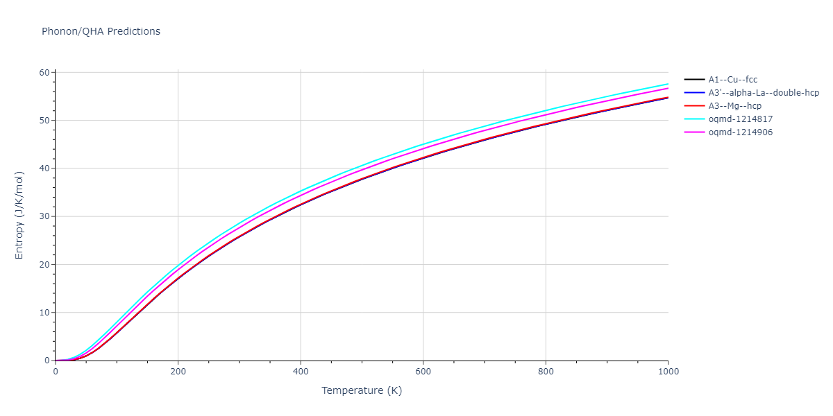 The Gibbs energies of the phases are estimated using thermodynamic integration between the interatomic potential in question and a simpler model with known Gibbs free energy values. For solids, the reference model is an Einstein solid, while for liquids it is the Uhlenbeck-Ford potential. Besides a short run at the start of the solid calculations to estimate Einstein model spring constants, the two calculations proceed similarly. Starting with the final relaxation configurations, the systems are stabilized for 25,000 steps. Then, over the next 50,000 steps the potential is swapped out for the reference potential. The system is then stabilized for another 25,000 steps with the reference model before a reverse swap of 50,000 steps is performed. The simulation ends with one final 25,000 step stabilization period. From the simulation, the irreversible work of transformation is estimated and used to compute the absolute Gibbs free energy of the target phase and potential relative to the reference potential. Entropy is estimated as the difference in enthalpy and Gibbs free energy and divided by temperature.