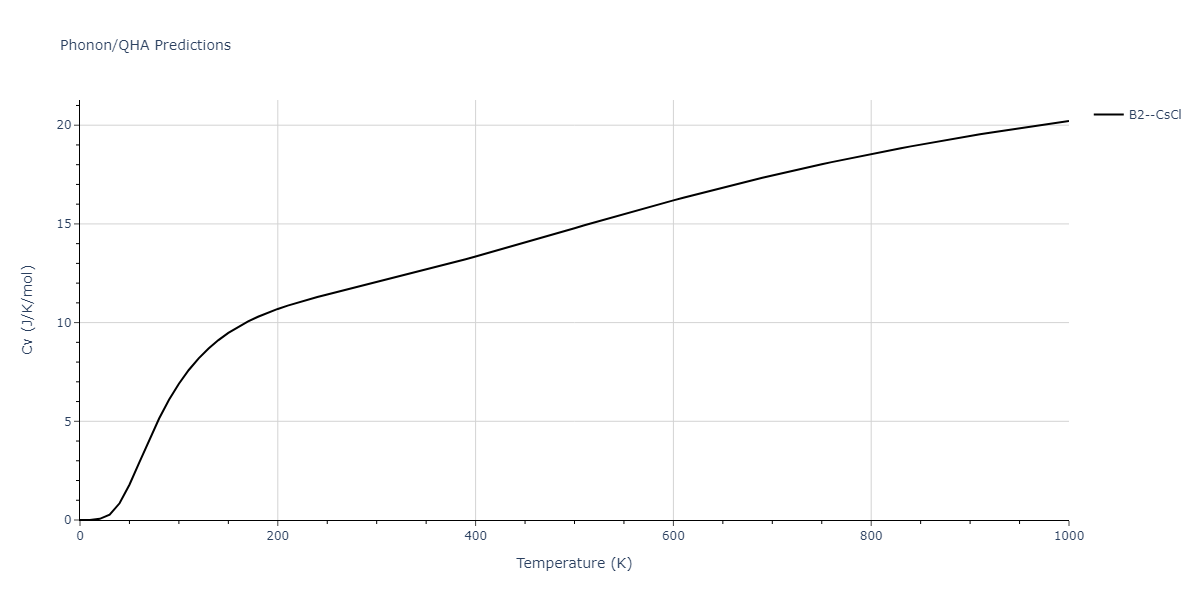 Plots of internal energy, Gibbs free energy, entropy, heat capacity and volume are shown here as a function of temperature for various crystal structures and liquid phases. The included crystal structures correspond to those in the Solid Structures vs. Temperature section, and the liquid phases to those in the Liquid Properties section. Internal energy and volume are taken from the associated structure relaxations mentioned in those previous sections. Constant pressure heat capacity is estimated using 3-point numerical derivatives of enthalpy versus temperature. Note that since all simulations done here are at 0 pressure, internal energy and enthalpy are equivalent.