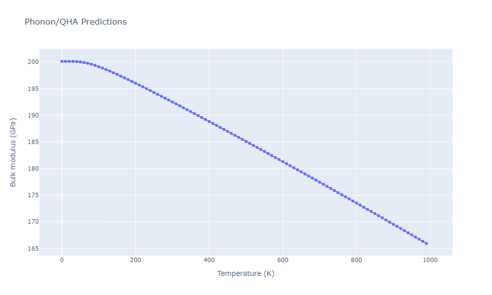 Plots of lattice and elastic constants are shown as a function of temperature. The 0K points were taken from the Crystal Structure Predictions and the Elastic Constants Predictions sections above for the unique crystal structures relaxed with the "dynamic" method. Starting from the 0 K relaxed crystal unit cells, supercell systems are created by replicating all three dimensions by the same multiplier to achieve at least 4000 atoms. The systems are then relaxed at 50 K and zero pressure using 1 million NPT steps. Lattice constants are estimated by averaging the measured box dimensions. Temperatures are iteratively increased by 50 K, with each subsequent relaxation calculation starting from the final atomic configuration at the previous temperature and relaxing for another 1 million steps.
