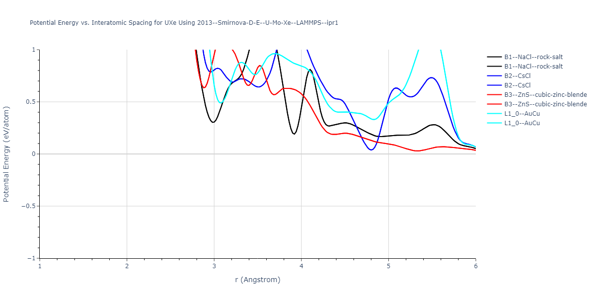 Plots of potential energy vs interatomic spacing, r, are shown below for a number of crystal structures. The structures are generated based on the ideal atomic positions and b/a and c/a lattice parameter ratios for a given crystal prototype. The size of the system is then uniformly scaled, and the energy calculated without relaxing the system. To obtain these plots, values of r are evaluated every 0.02 Å up to 6 Å.