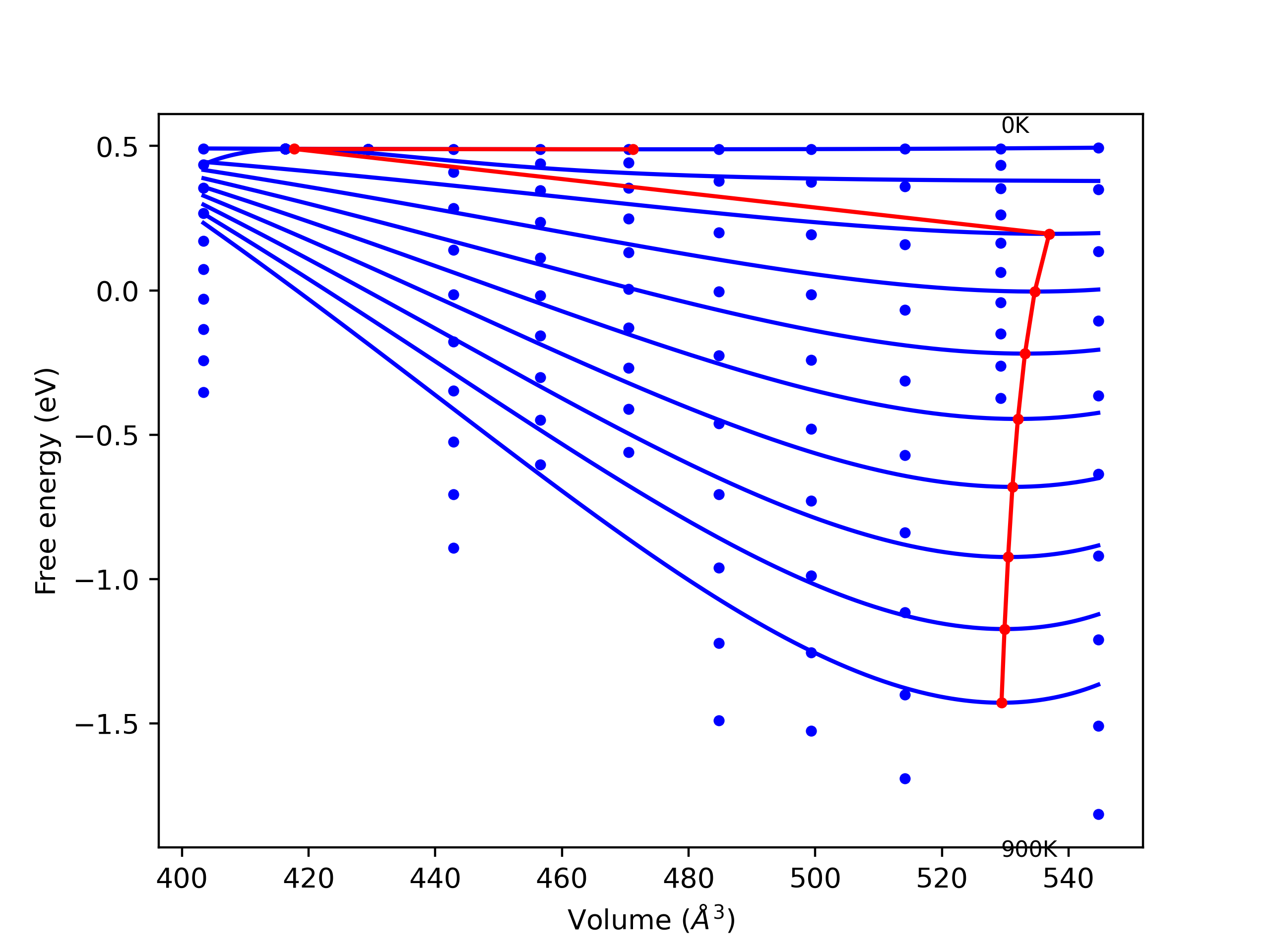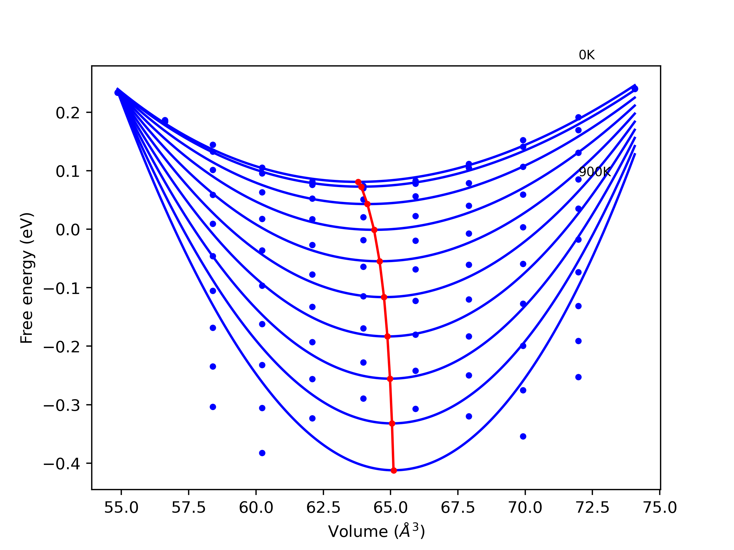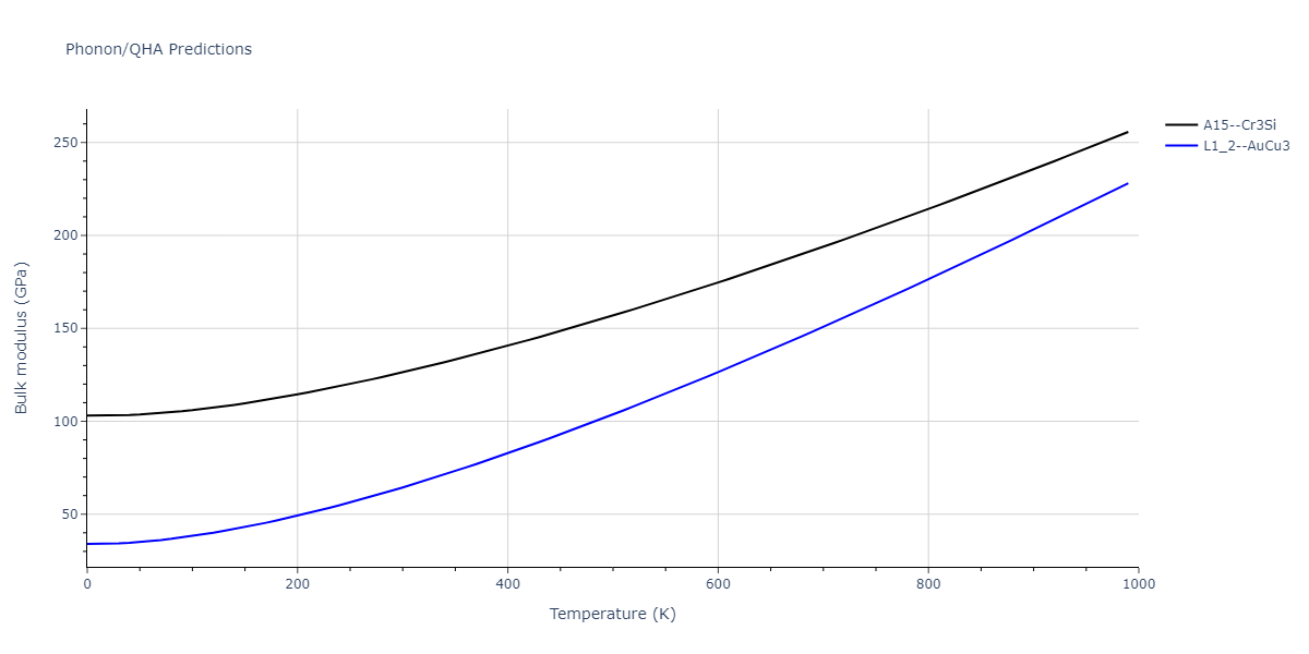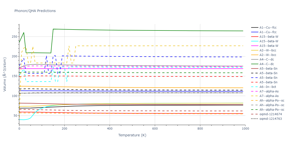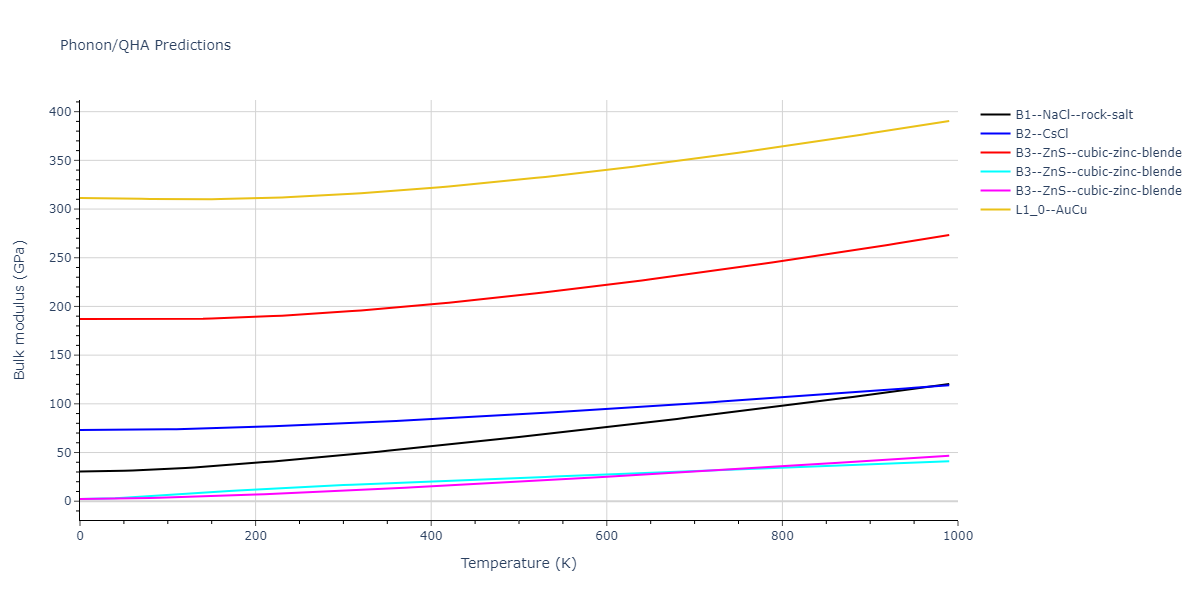 Plots of lattice and elastic constants are shown as a function of temperature. The 0K points were taken from the Crystal Structure Predictions and the Elastic Constants Predictions sections above for the unique crystal structures relaxed with the "dynamic" method. Starting from the 0 K relaxed crystal unit cells, supercell systems are created by replicating all three dimensions by the same multiplier to achieve at least 4000 atoms. The systems are then relaxed at 50 K and zero pressure using 1 million NPT steps. Lattice constants are estimated by averaging the measured box dimensions. Temperatures are iteratively increased by 50 K, with each subsequent relaxation calculation starting from the final atomic configuration at the previous temperature and relaxing for another 1 million steps.