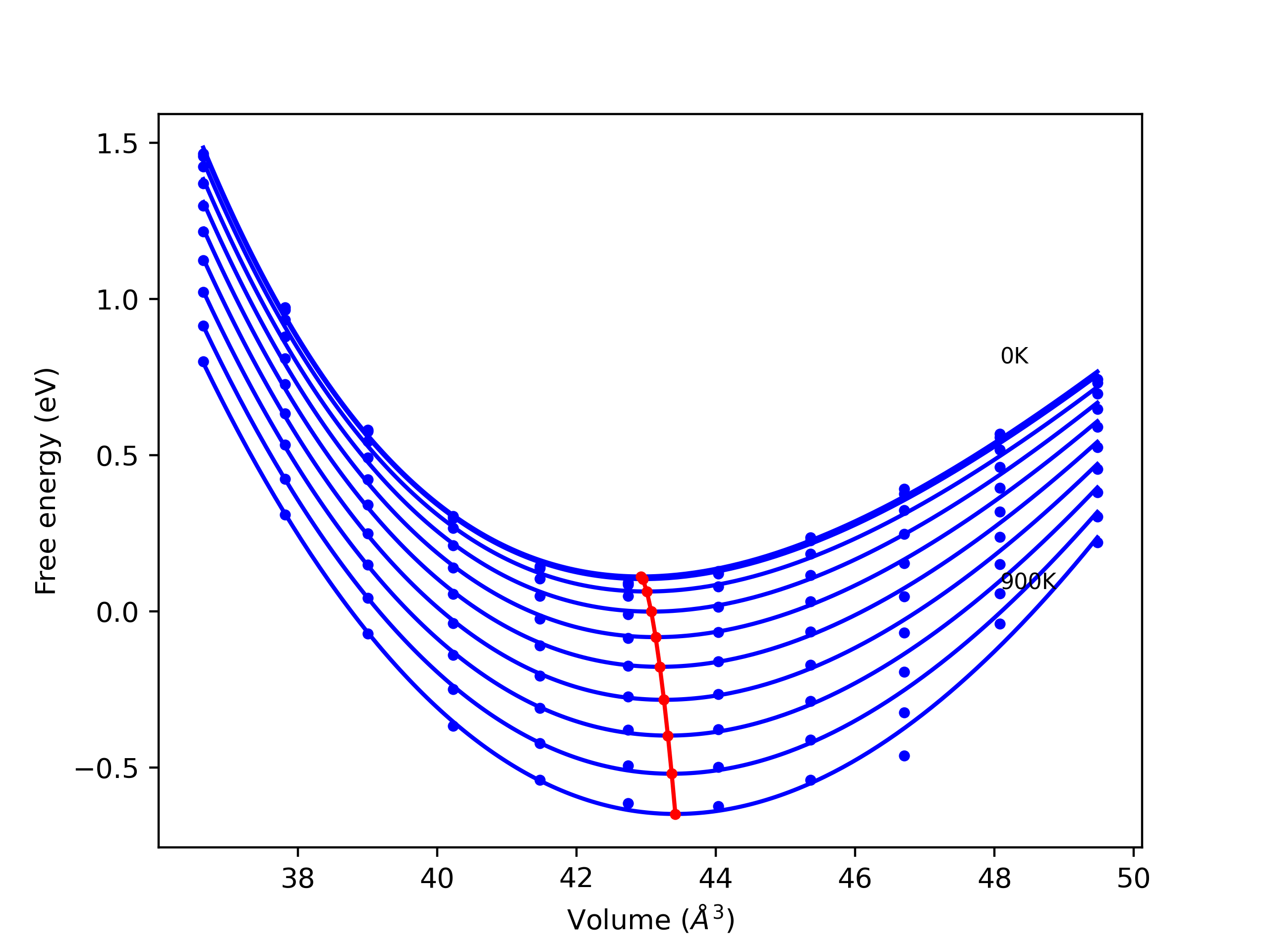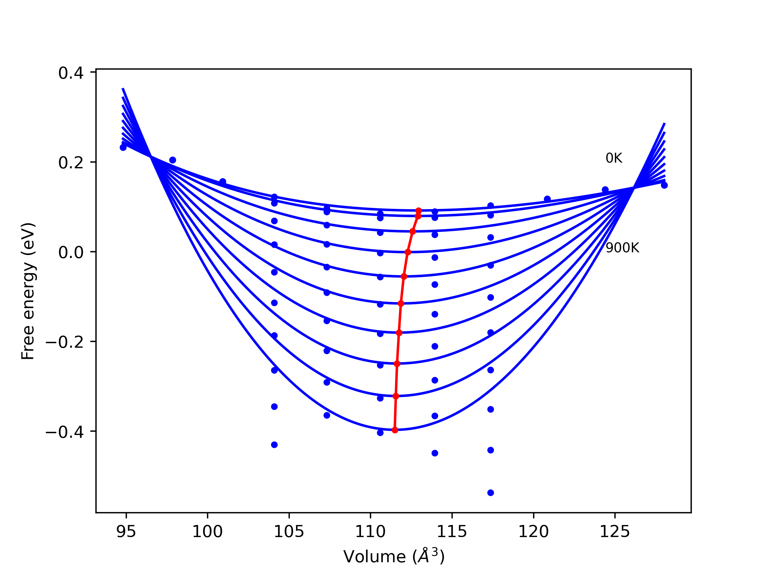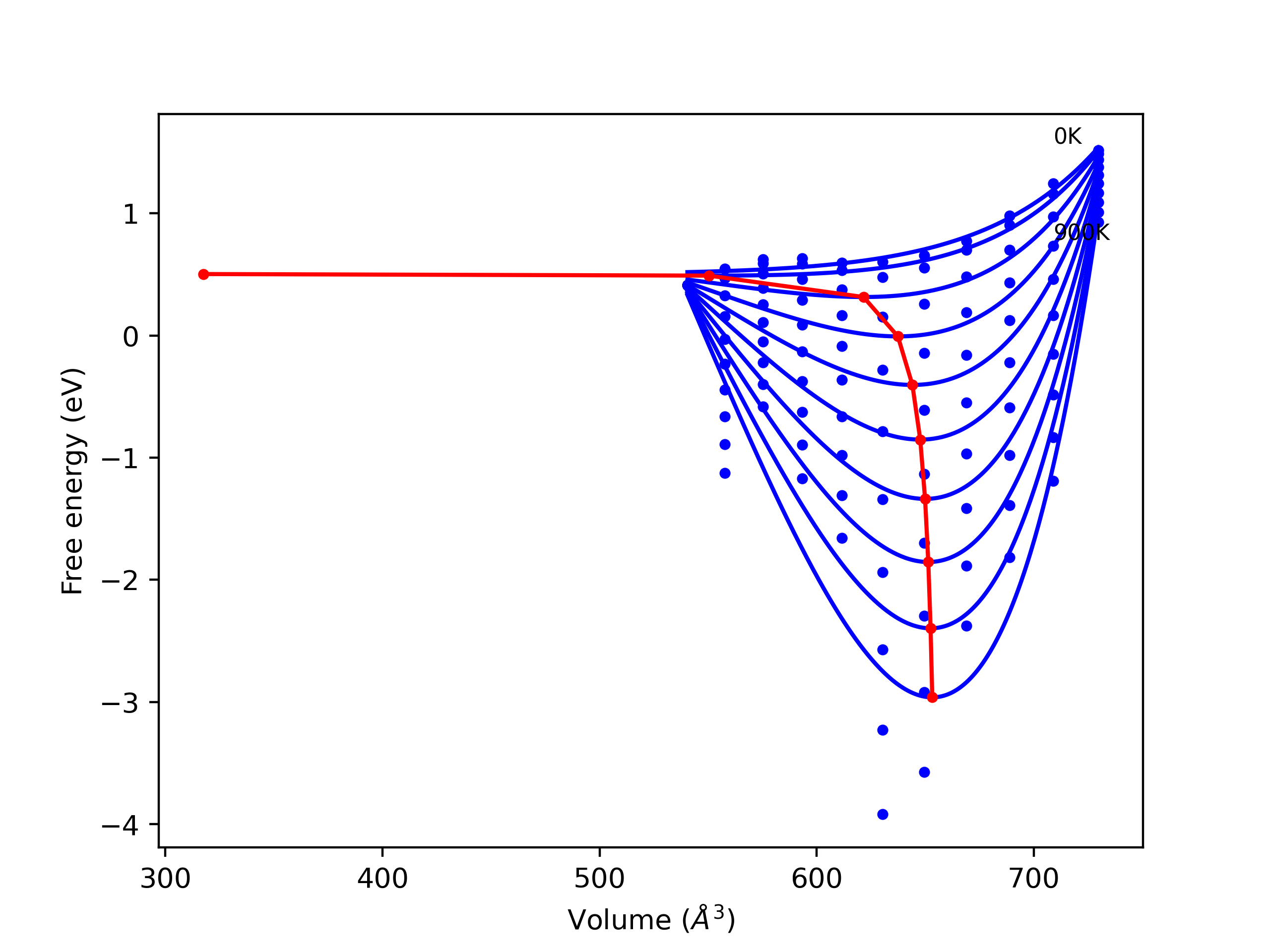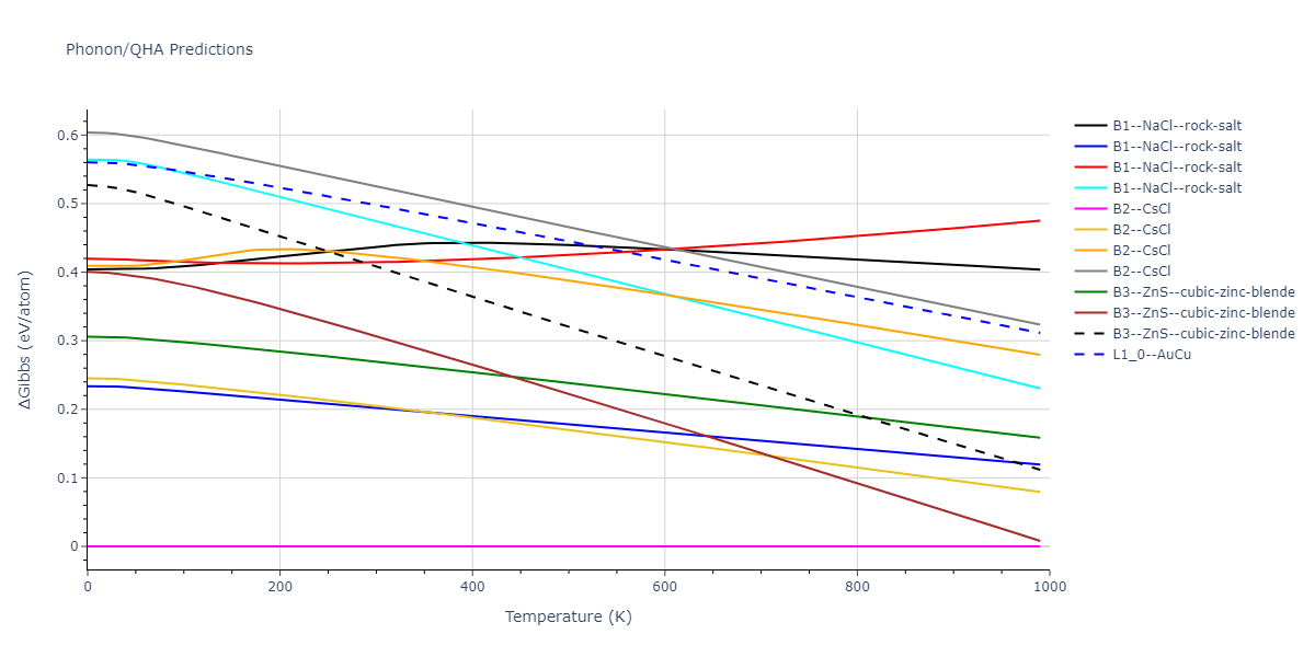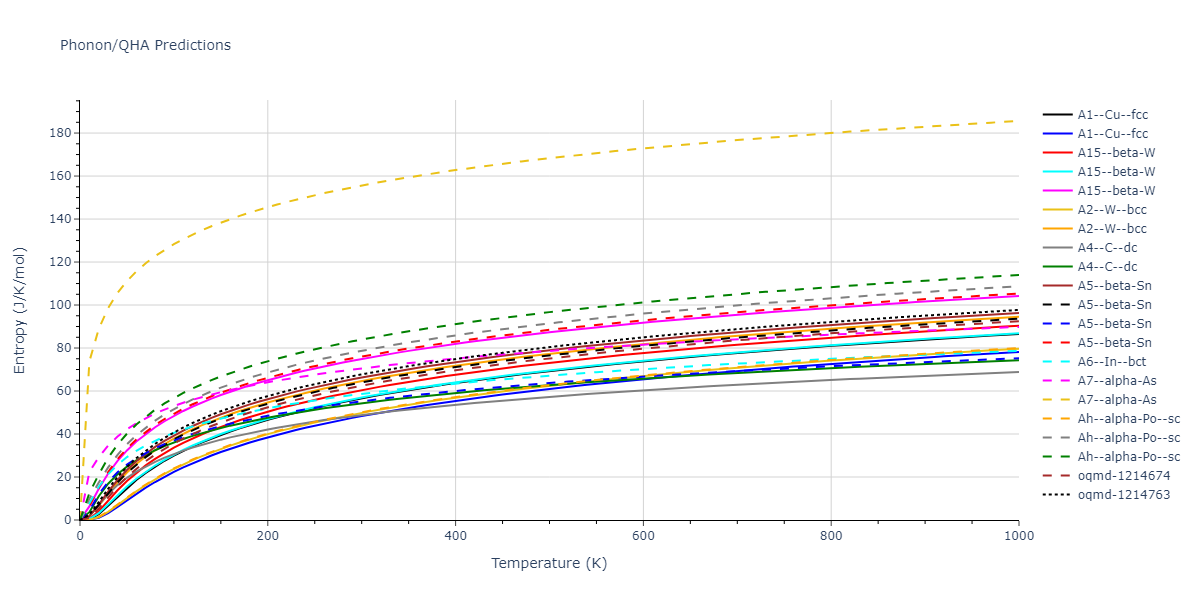 The Gibbs energies of the phases are estimated using thermodynamic integration between the interatomic potential in question and a simpler model with known Gibbs free energy values. For solids, the reference model is an Einstein solid, while for liquids it is the Uhlenbeck-Ford potential. Besides a short run at the start of the solid calculations to estimate Einstein model spring constants, the two calculations proceed similarly. Starting with the final relaxation configurations, the systems are stabilized for 25,000 steps. Then, over the next 50,000 steps the potential is swapped out for the reference potential. The system is then stabilized for another 25,000 steps with the reference model before a reverse swap of 50,000 steps is performed. The simulation ends with one final 25,000 step stabilization period. From the simulation, the irreversible work of transformation is estimated and used to compute the absolute Gibbs free energy of the target phase and potential relative to the reference potential. Entropy is estimated as the difference in enthalpy and Gibbs free energy and divided by temperature.