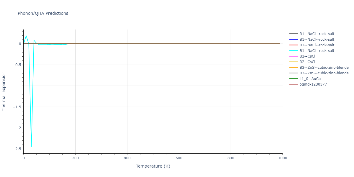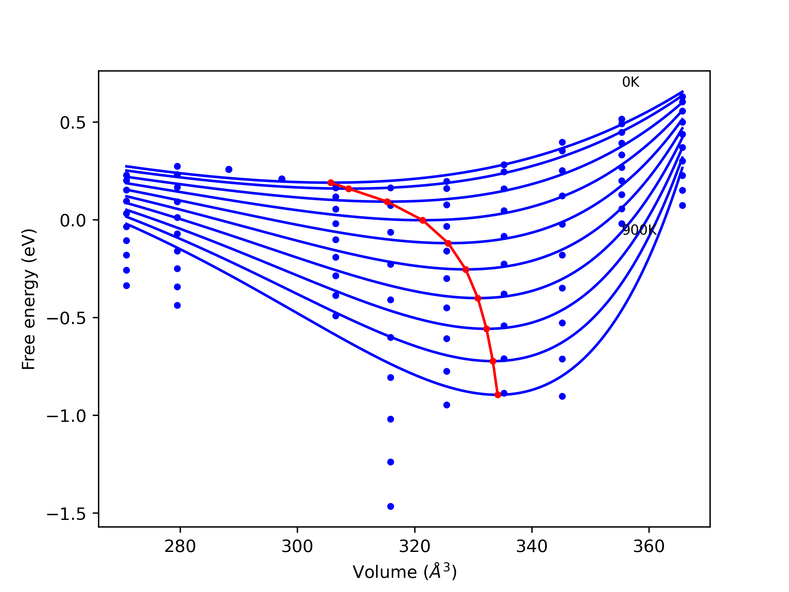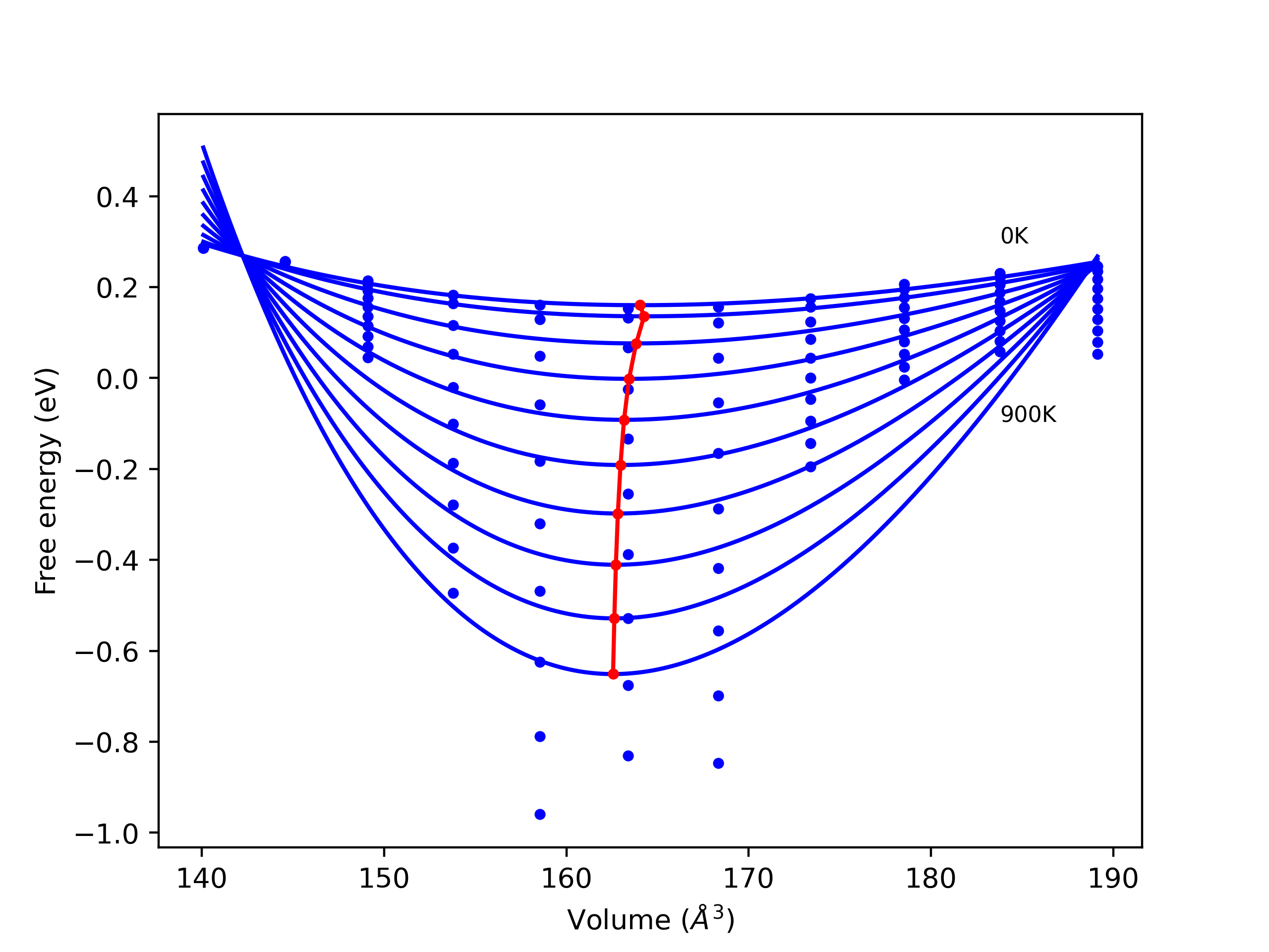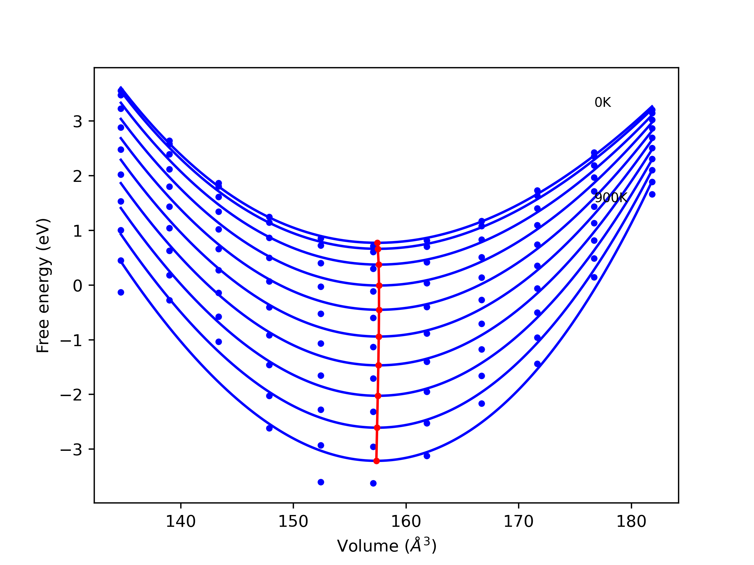 The Gibbs energies of the phases are estimated using thermodynamic integration between the interatomic potential in question and a simpler model with known Gibbs free energy values. For solids, the reference model is an Einstein solid, while for liquids it is the Uhlenbeck-Ford potential. Besides a short run at the start of the solid calculations to estimate Einstein model spring constants, the two calculations proceed similarly. Starting with the final relaxation configurations, the systems are stabilized for 25,000 steps. Then, over the next 50,000 steps the potential is swapped out for the reference potential. The system is then stabilized for another 25,000 steps with the reference model before a reverse swap of 50,000 steps is performed. The simulation ends with one final 25,000 step stabilization period. From the simulation, the irreversible work of transformation is estimated and used to compute the absolute Gibbs free energy of the target phase and potential relative to the reference potential. Entropy is estimated as the difference in enthalpy and Gibbs free energy and divided by temperature.