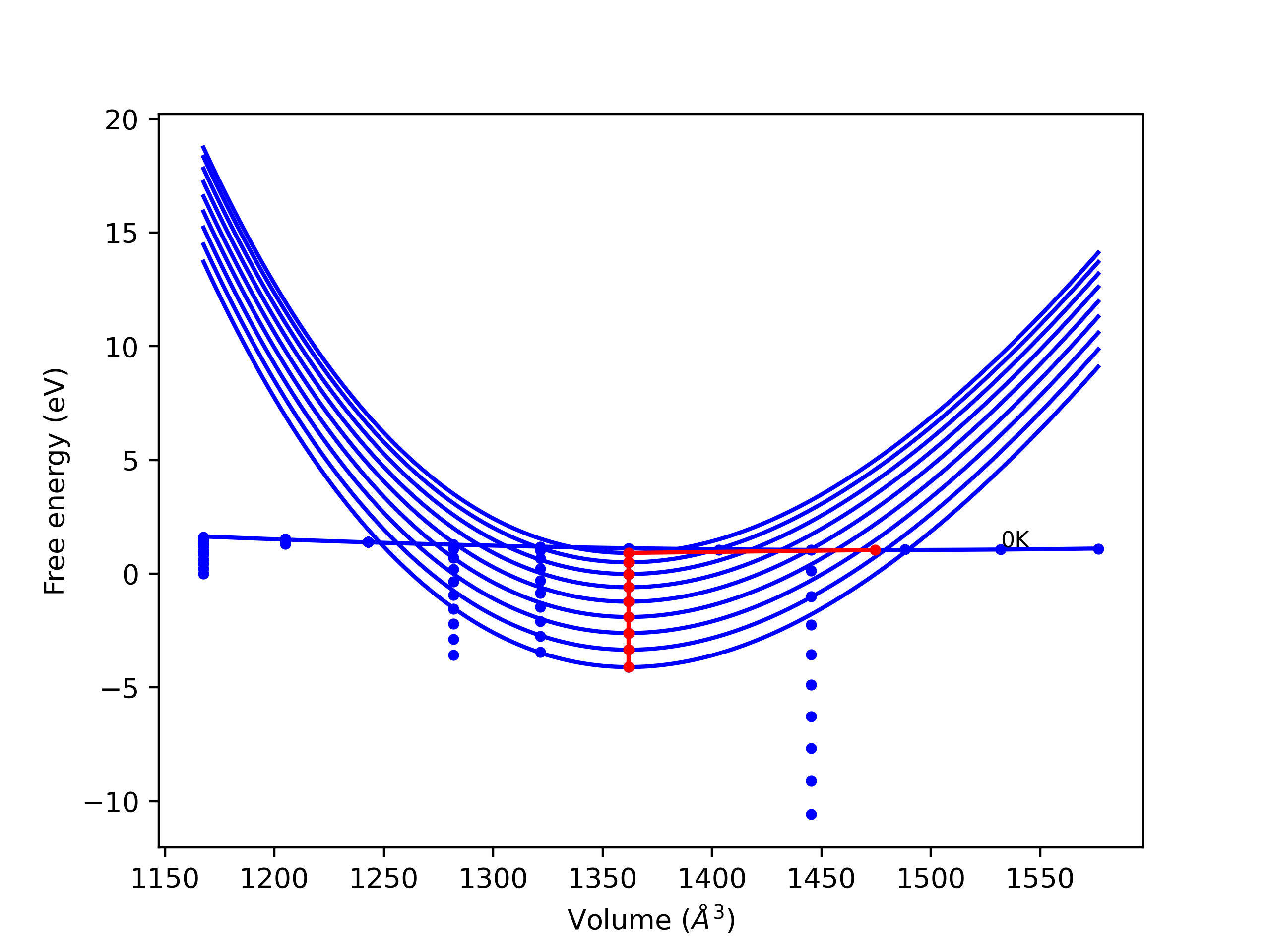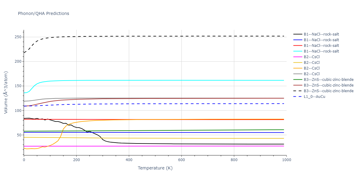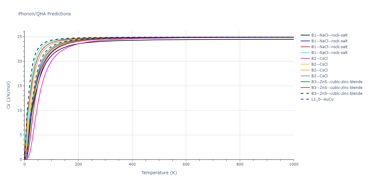 Plots of internal energy, Gibbs free energy, entropy, heat capacity and volume are shown here as a function of temperature for various crystal structures and liquid phases. The included crystal structures correspond to those in the Solid Structures vs. Temperature section, and the liquid phases to those in the Liquid Properties section. Internal energy and volume are taken from the associated structure relaxations mentioned in those previous sections. Constant pressure heat capacity is estimated using 3-point numerical derivatives of enthalpy versus temperature. Note that since all simulations done here are at 0 pressure, internal energy and enthalpy are equivalent.