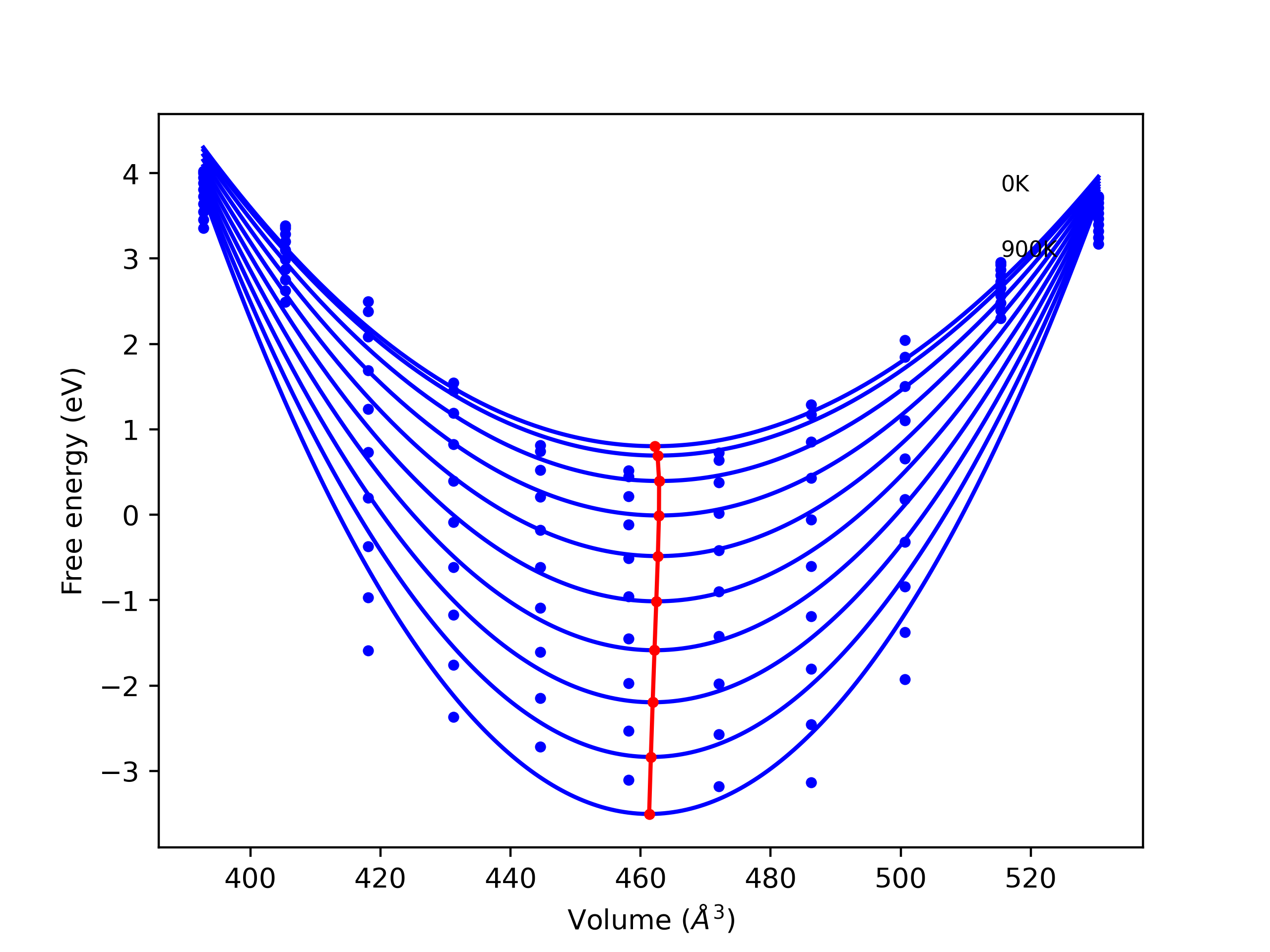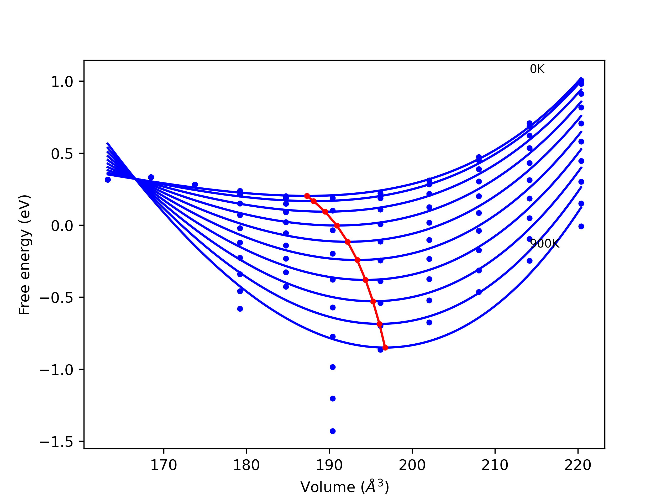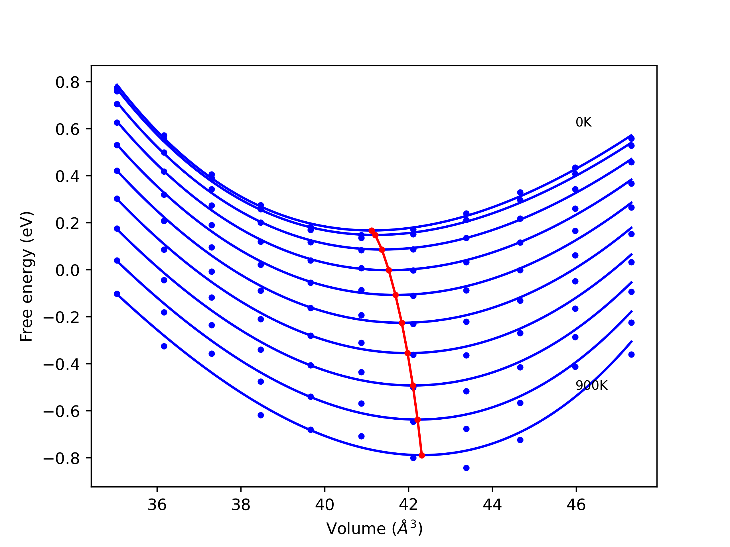 The Gibbs energies of the phases are estimated using thermodynamic integration between the interatomic potential in question and a simpler model with known Gibbs free energy values. For solids, the reference model is an Einstein solid, while for liquids it is the Uhlenbeck-Ford potential. Besides a short run at the start of the solid calculations to estimate Einstein model spring constants, the two calculations proceed similarly. Starting with the final relaxation configurations, the systems are stabilized for 25,000 steps. Then, over the next 50,000 steps the potential is swapped out for the reference potential. The system is then stabilized for another 25,000 steps with the reference model before a reverse swap of 50,000 steps is performed. The simulation ends with one final 25,000 step stabilization period. From the simulation, the irreversible work of transformation is estimated and used to compute the absolute Gibbs free energy of the target phase and potential relative to the reference potential. Entropy is estimated as the difference in enthalpy and Gibbs free energy and divided by temperature.