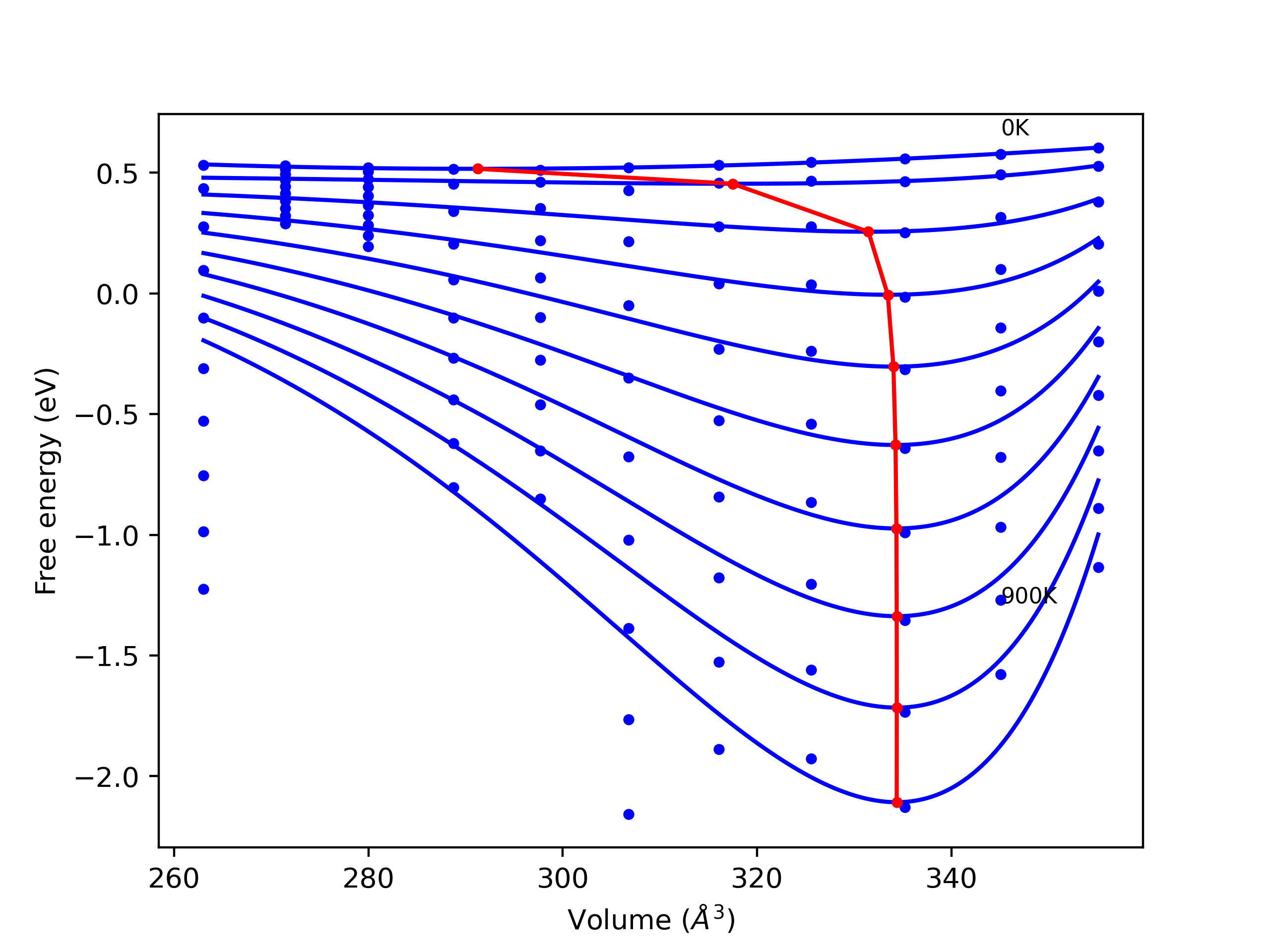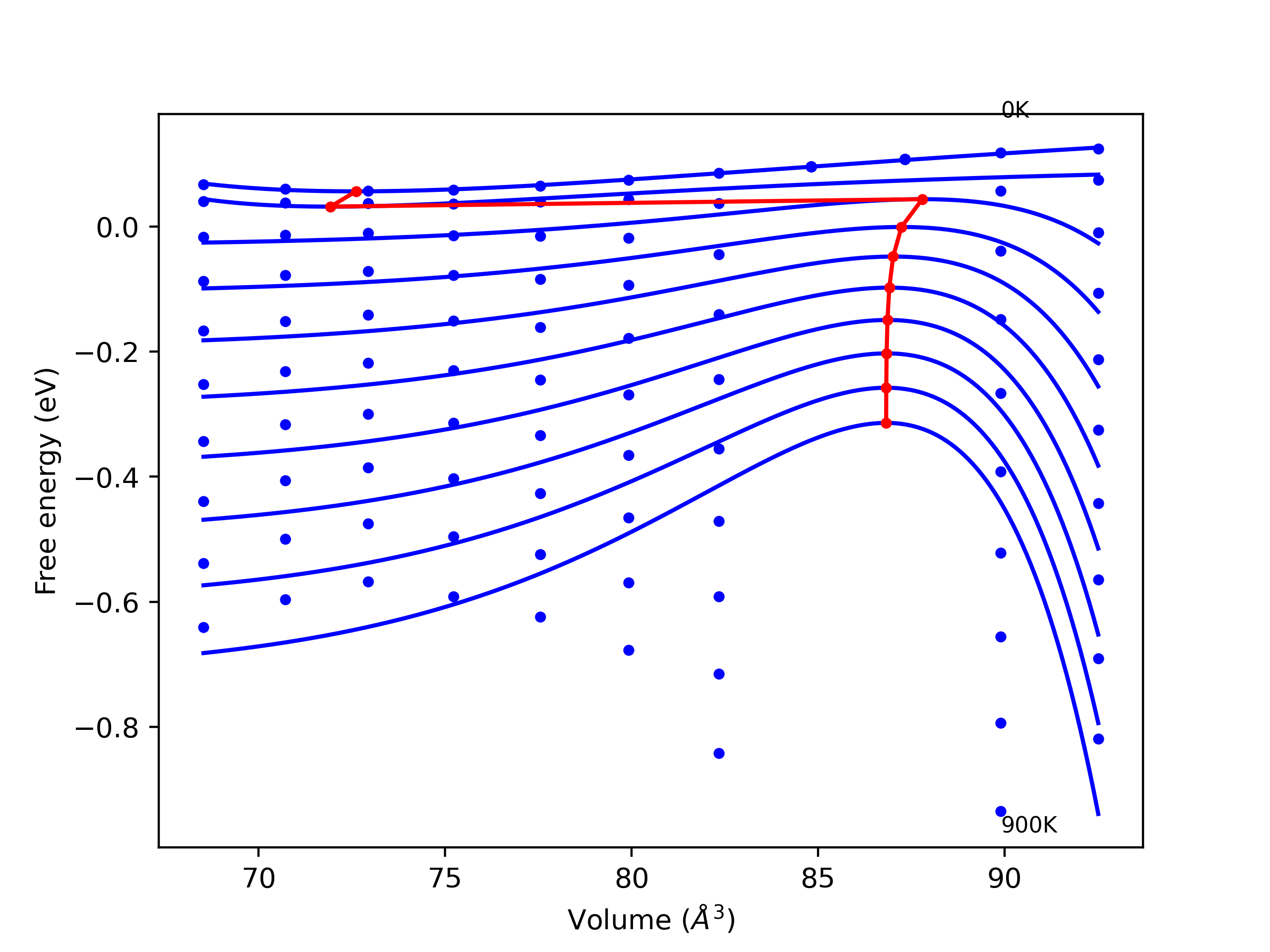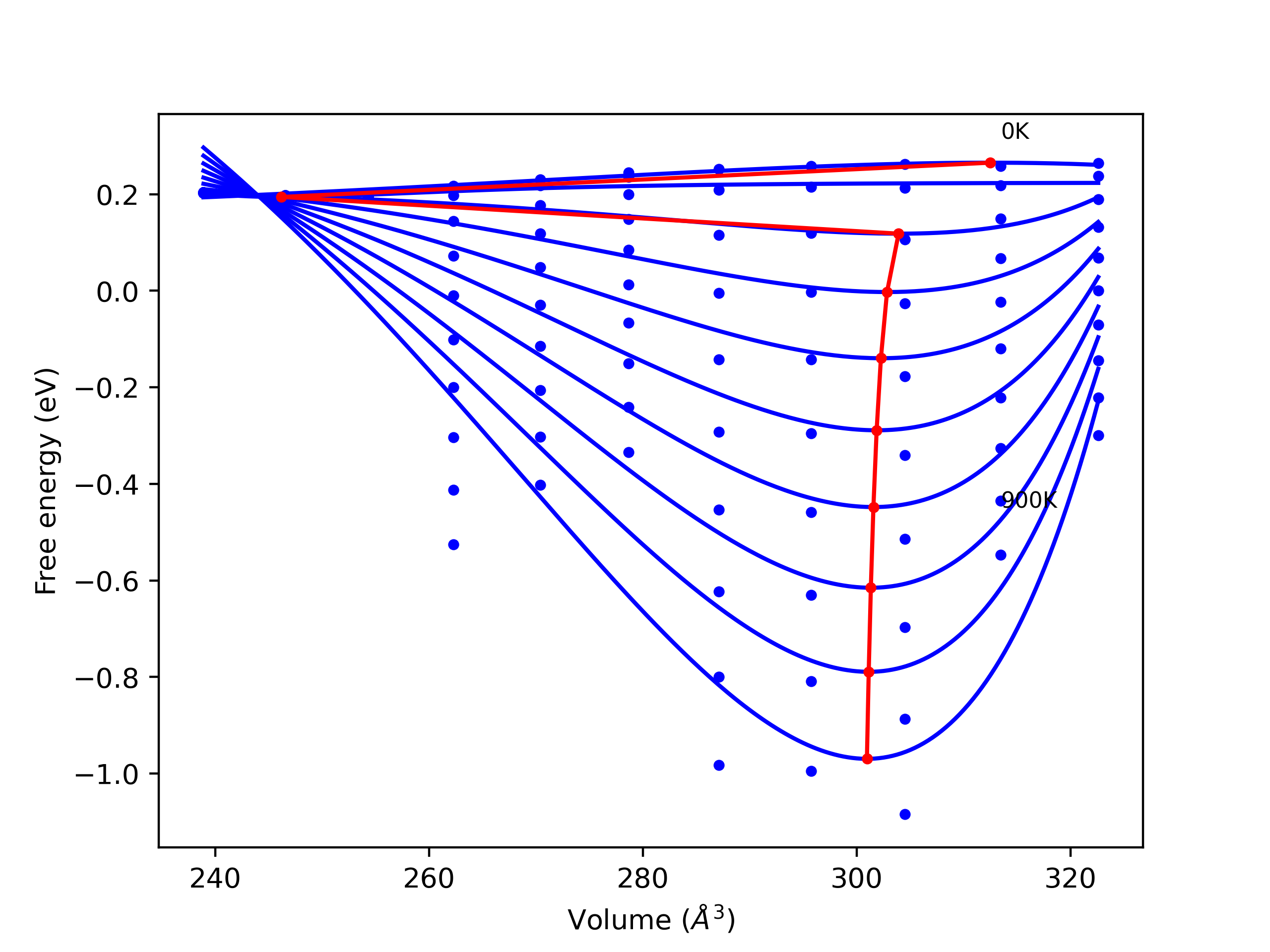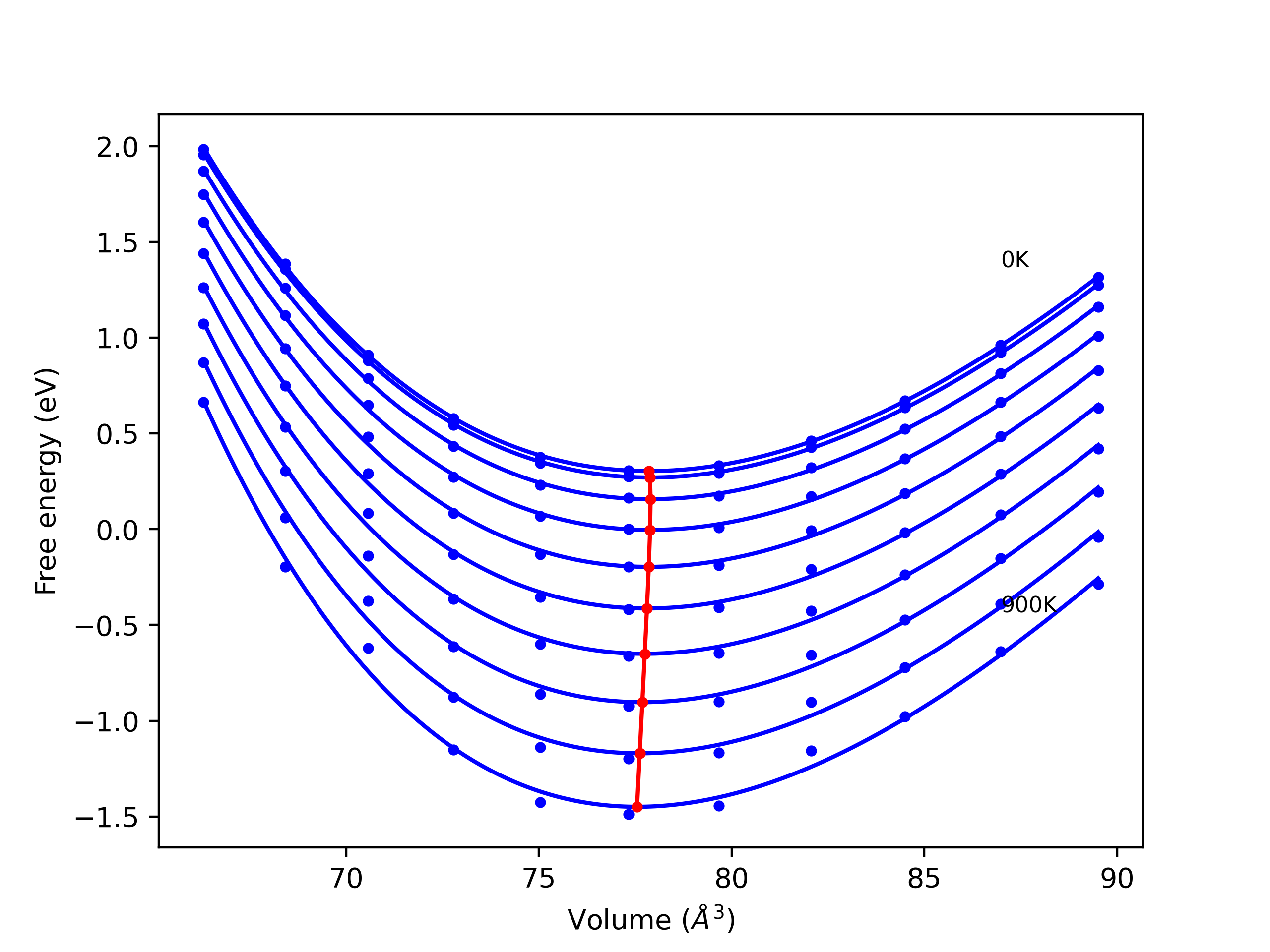 The Gibbs energies of the phases are estimated using thermodynamic integration between the interatomic potential in question and a simpler model with known Gibbs free energy values. For solids, the reference model is an Einstein solid, while for liquids it is the Uhlenbeck-Ford potential. Besides a short run at the start of the solid calculations to estimate Einstein model spring constants, the two calculations proceed similarly. Starting with the final relaxation configurations, the systems are stabilized for 25,000 steps. Then, over the next 50,000 steps the potential is swapped out for the reference potential. The system is then stabilized for another 25,000 steps with the reference model before a reverse swap of 50,000 steps is performed. The simulation ends with one final 25,000 step stabilization period. From the simulation, the irreversible work of transformation is estimated and used to compute the absolute Gibbs free energy of the target phase and potential relative to the reference potential. Entropy is estimated as the difference in enthalpy and Gibbs free energy and divided by temperature.