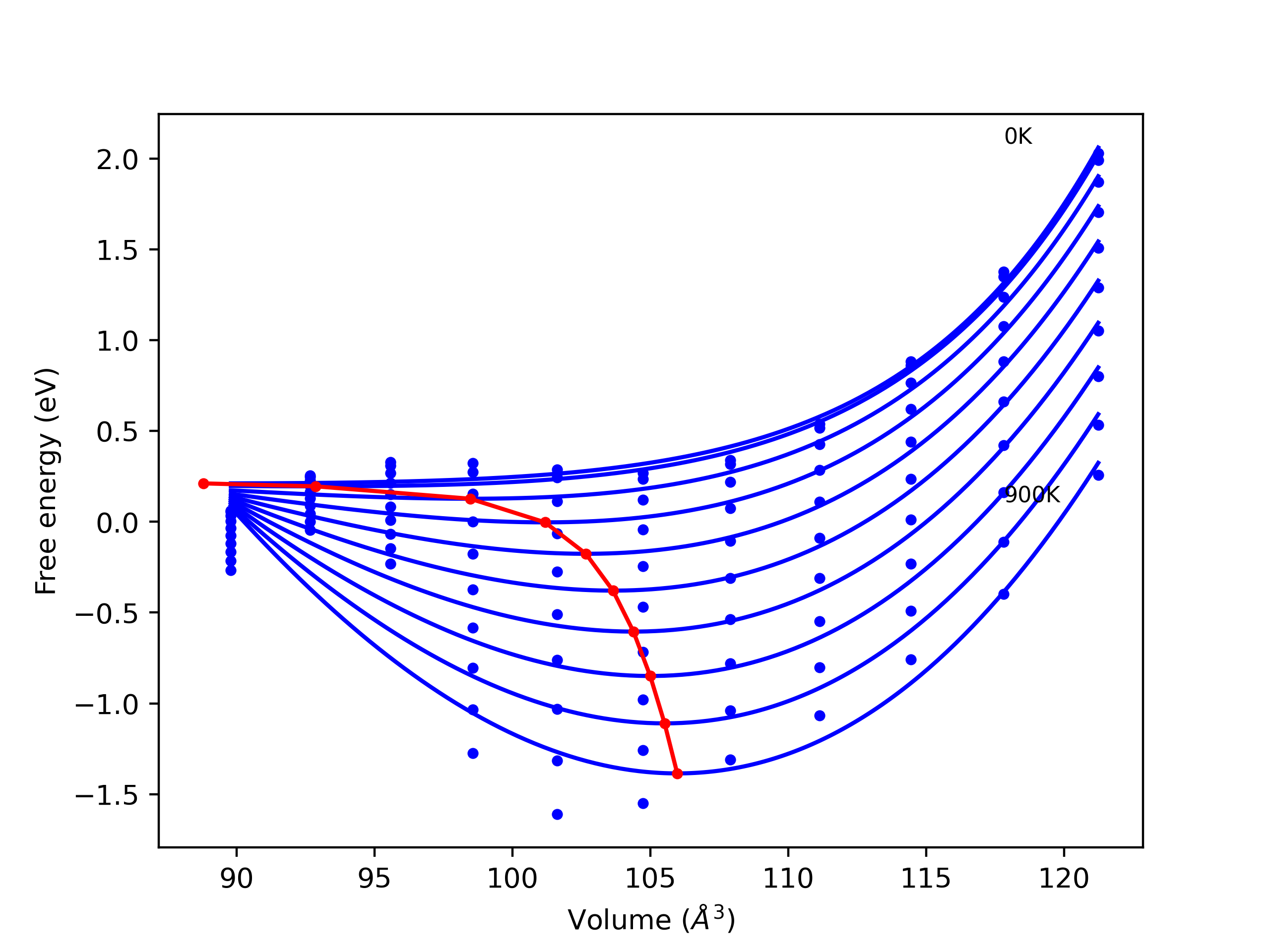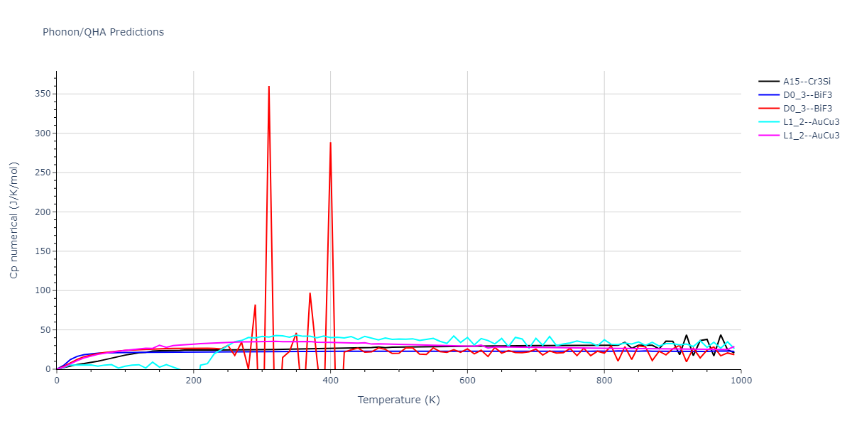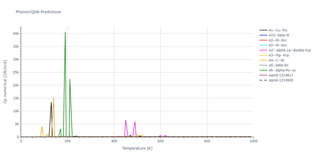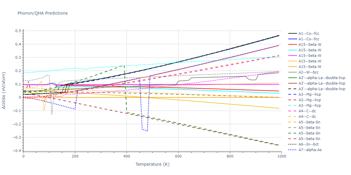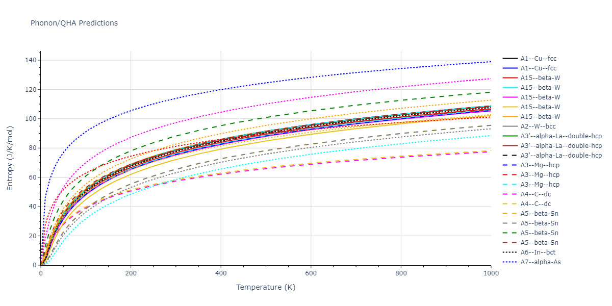 Plots of internal energy, Gibbs free energy, entropy, heat capacity and volume are shown here as a function of temperature for various crystal structures and liquid phases. The included crystal structures correspond to those in the Solid Structures vs. Temperature section, and the liquid phases to those in the Liquid Properties section. Internal energy and volume are taken from the associated structure relaxations mentioned in those previous sections. Constant pressure heat capacity is estimated using 3-point numerical derivatives of enthalpy versus temperature. Note that since all simulations done here are at 0 pressure, internal energy and enthalpy are equivalent.