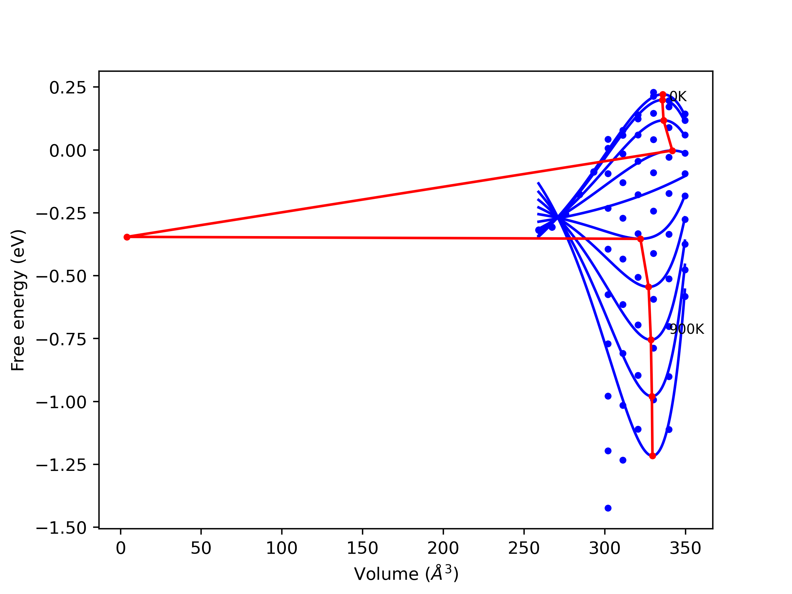 Plots of lattice and elastic constants are shown as a function of temperature. The 0K points were taken from the Crystal Structure Predictions and the Elastic Constants Predictions sections above for the unique crystal structures relaxed with the "dynamic" method. Starting from the 0 K relaxed crystal unit cells, supercell systems are created by replicating all three dimensions by the same multiplier to achieve at least 4000 atoms. The systems are then relaxed at 50 K and zero pressure using 1 million NPT steps. Lattice constants are estimated by averaging the measured box dimensions. Temperatures are iteratively increased by 50 K, with each subsequent relaxation calculation starting from the final atomic configuration at the previous temperature and relaxing for another 1 million steps.